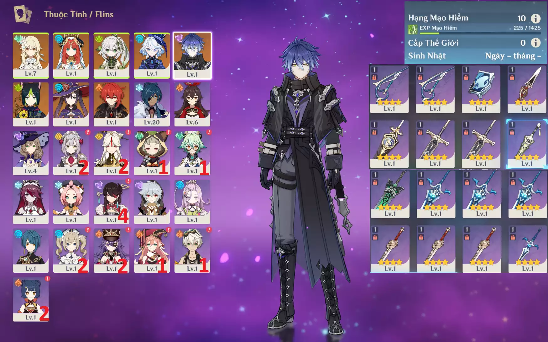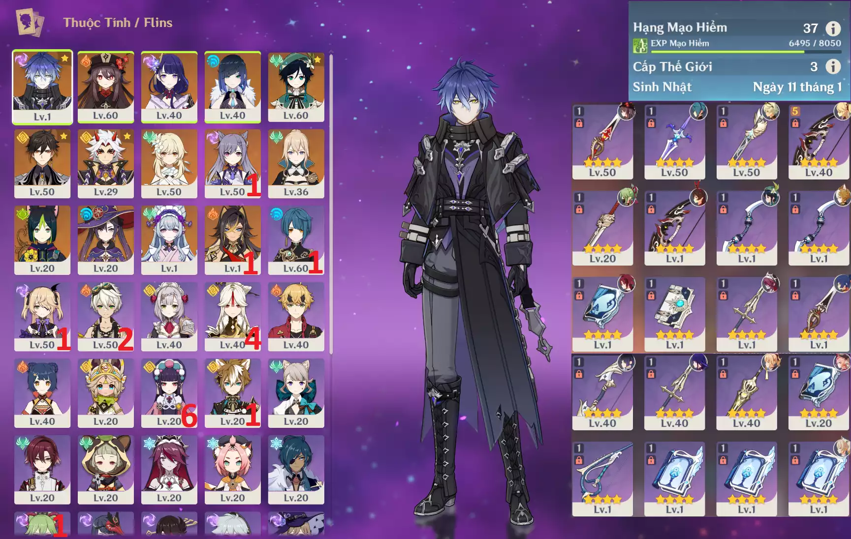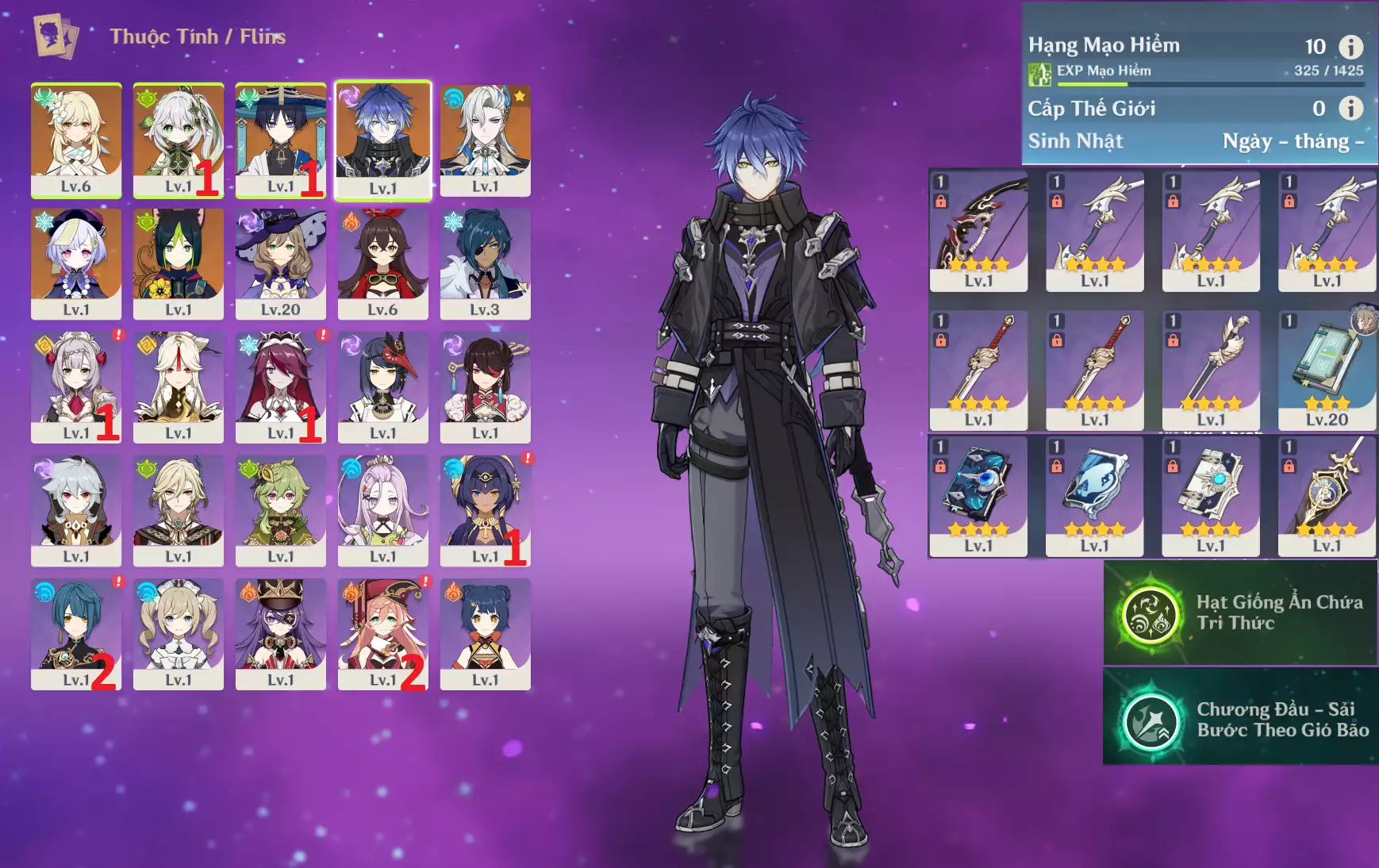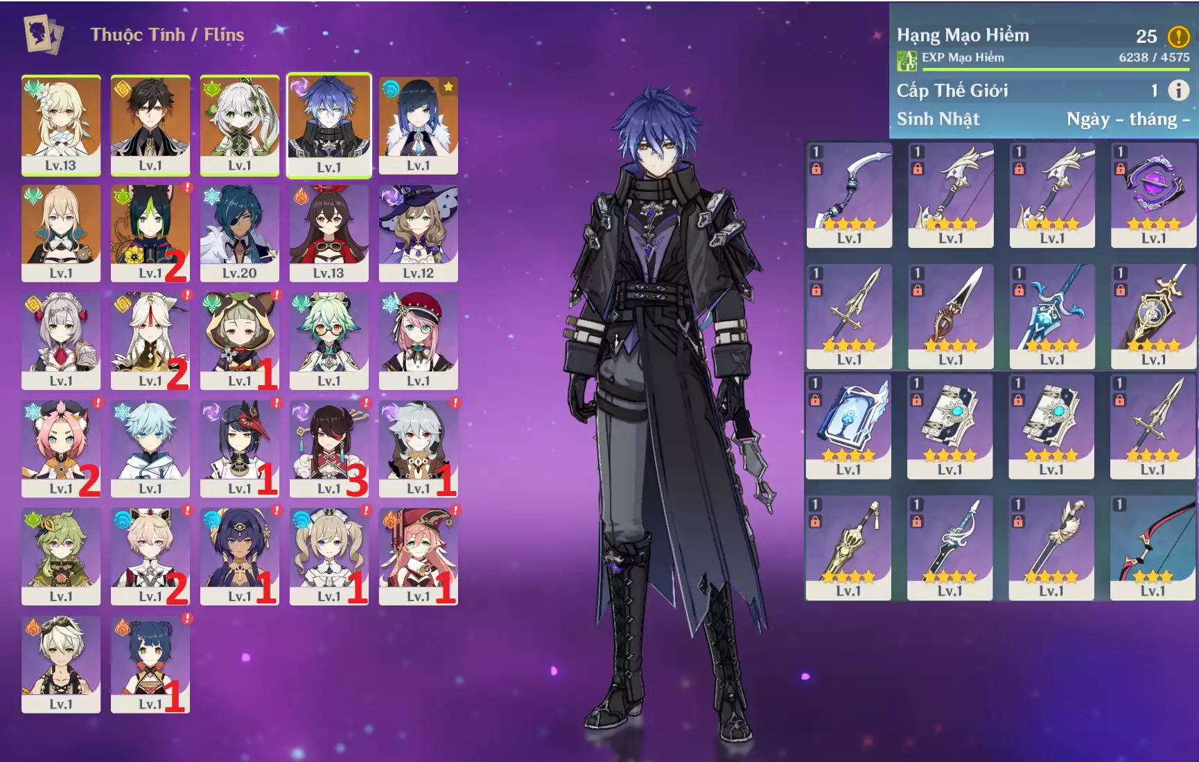 Ar25 : Flins + Nahida + Zhongli + Yelan + TighnariC2 + Jean_ bennet xianglingC1 _ banner nhân vật 15/90 ( acc trắng thông tin _ chưa set mail + sinh nhật ) _ map + nhiệm vụ zin 99,99%