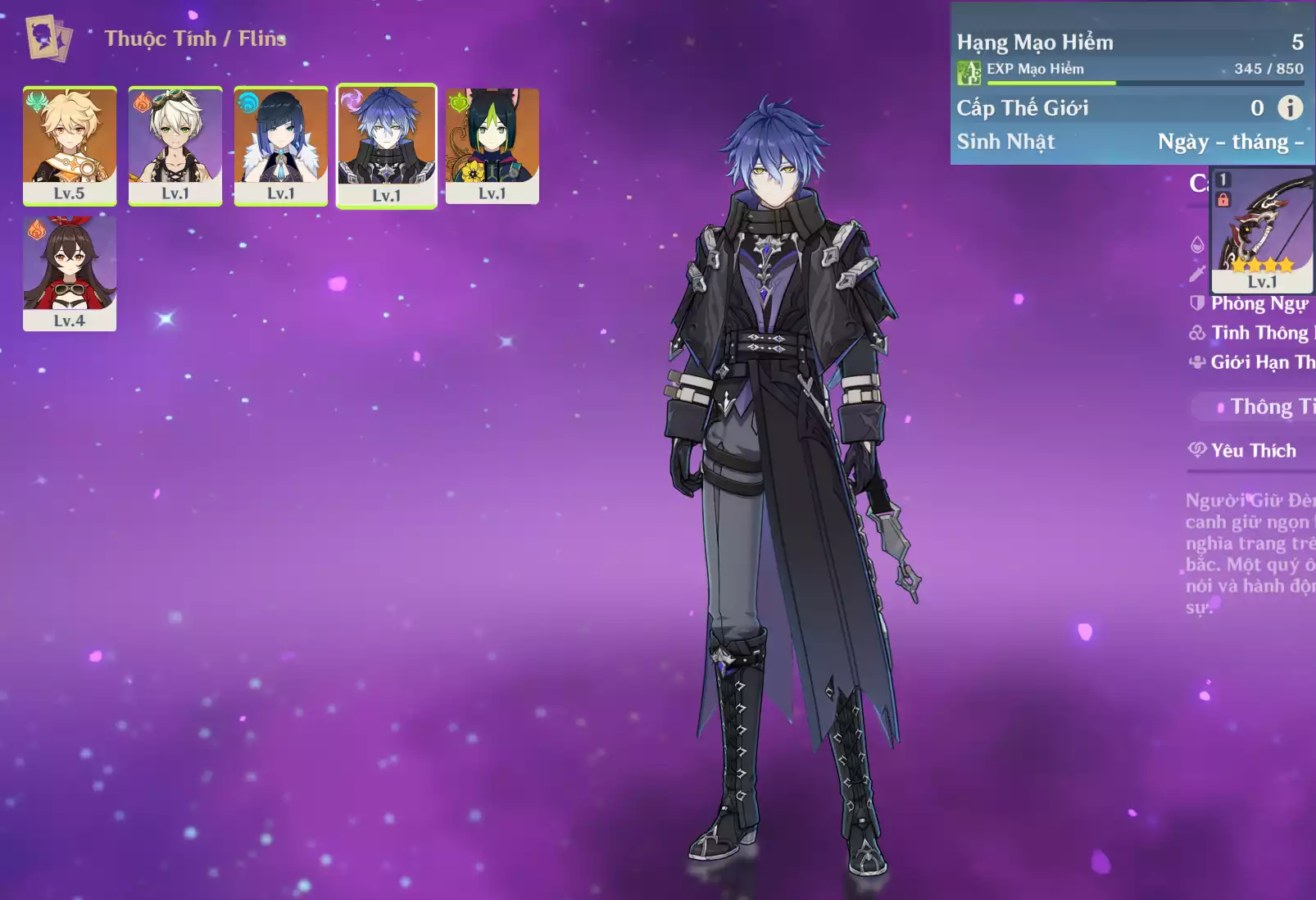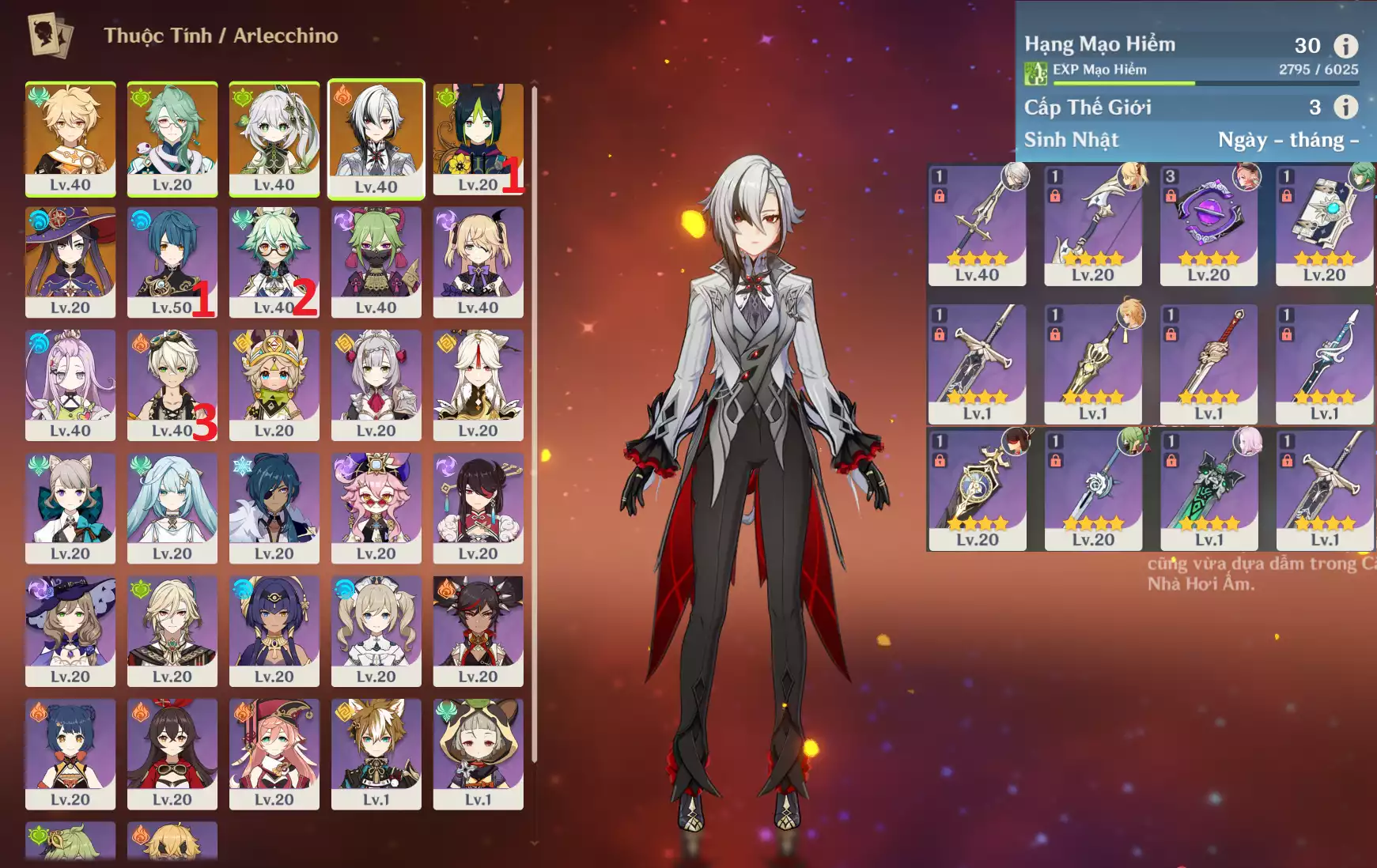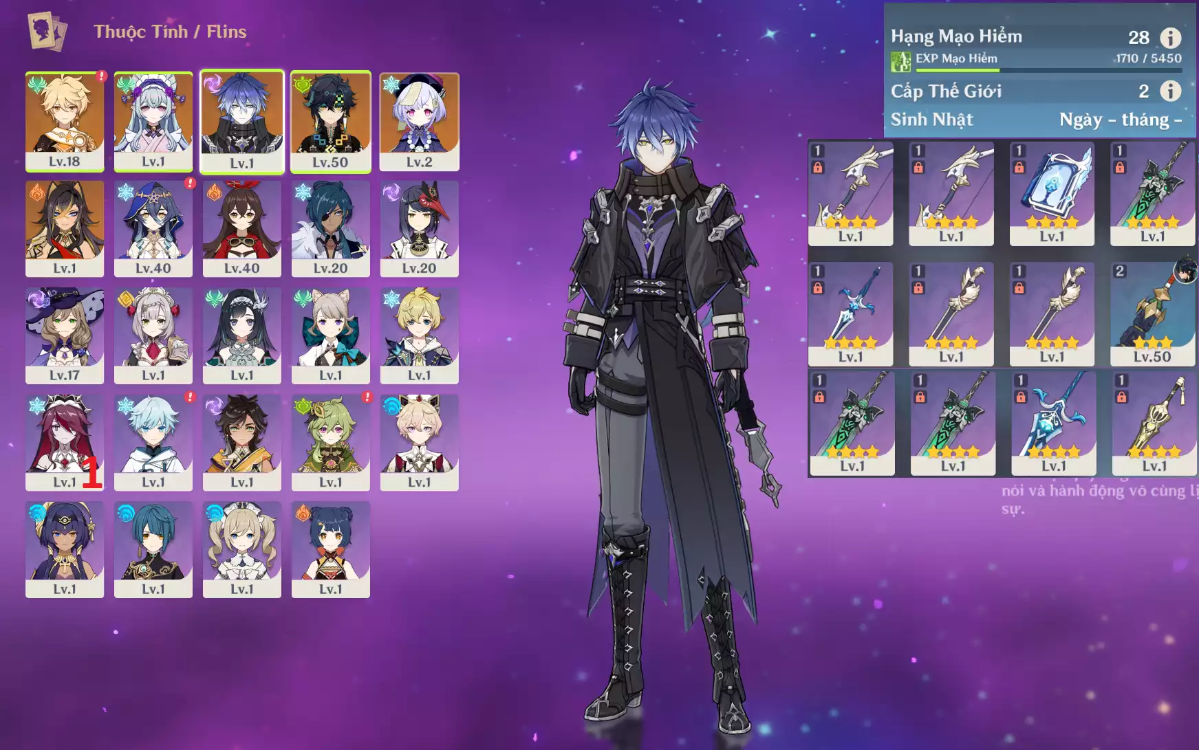 Ar25 : Flins + Nahida + Zhongli + Yelan + TighnariC2 + Jean_ bennet xianglingC1 _ banner nhân vật 15/90 ( acc trắng thông tin _ chưa set mail + sinh nhật ) _ map + nhiệm vụ zin 99,99%