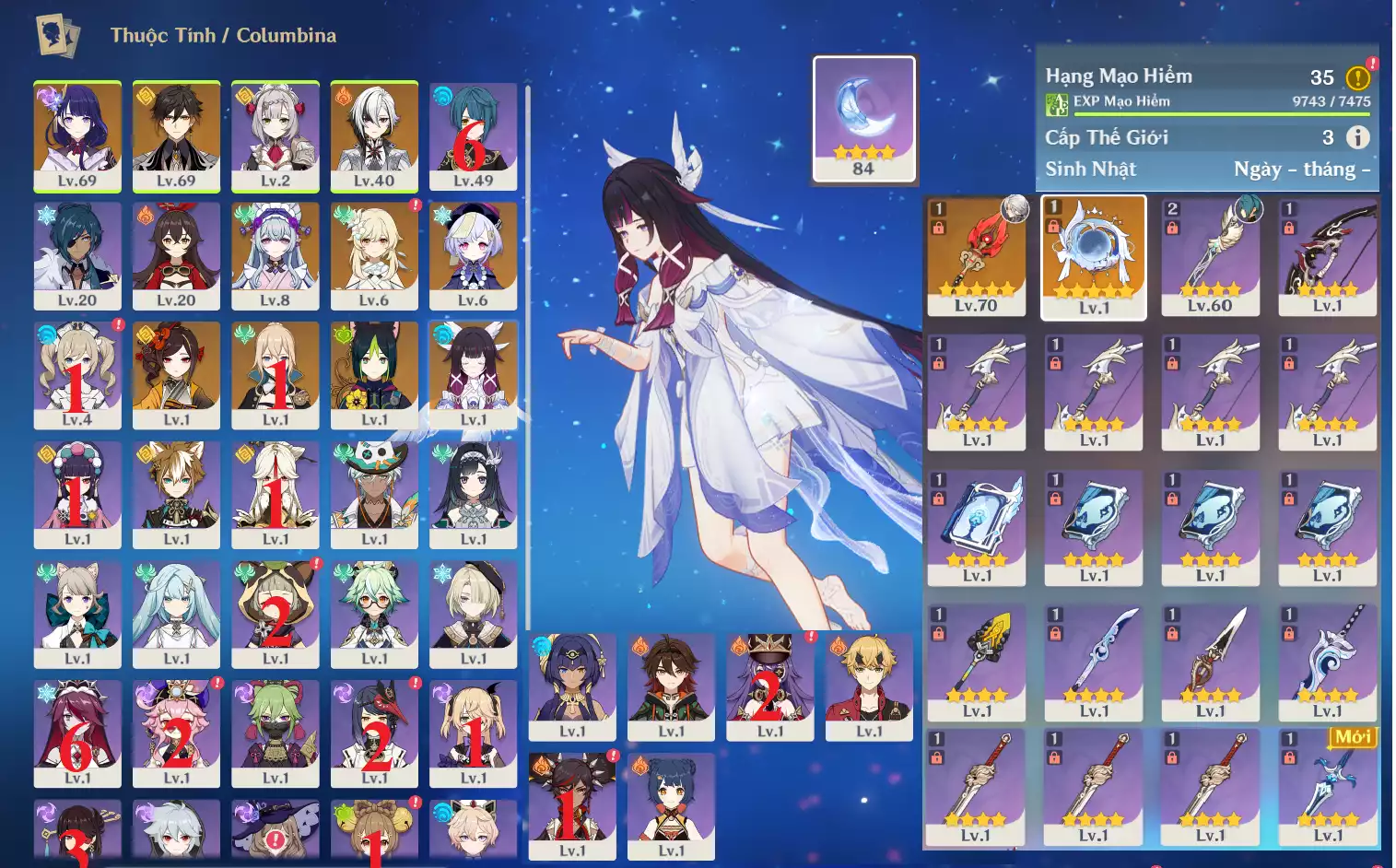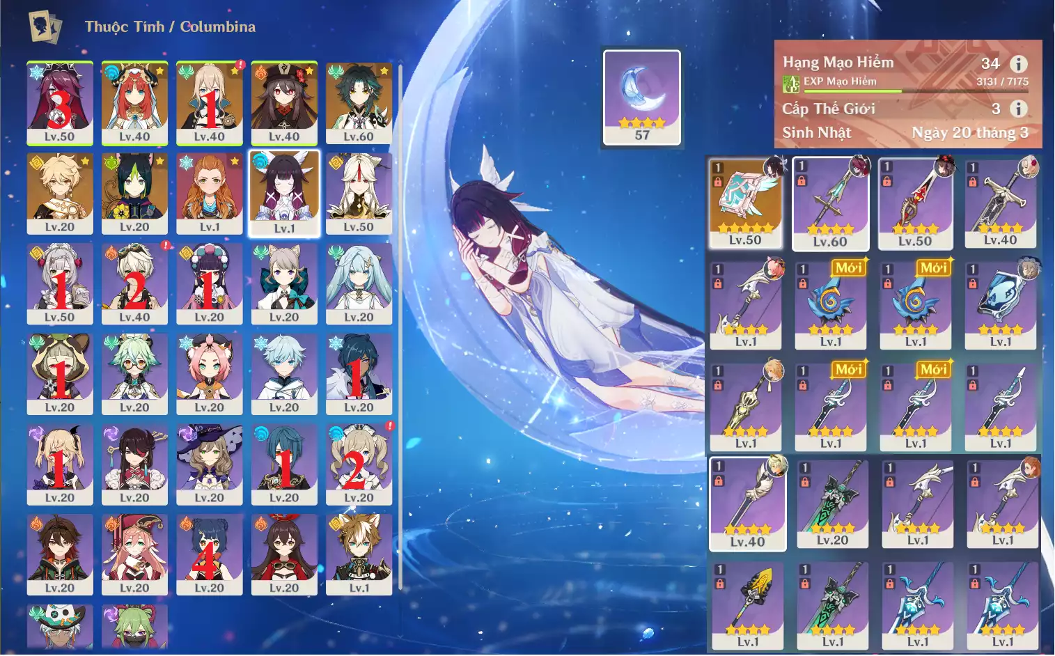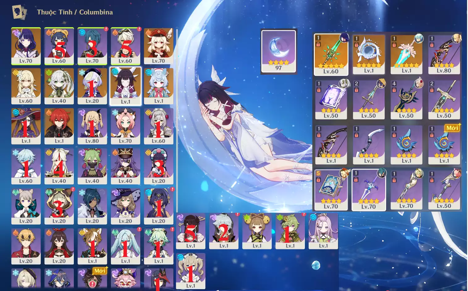 #359699 1,000,000đ 1,000,000đ AR level 34 Khu Vực asia Tướng 5* 7 Ar34: Columbina QTK* + Hutao + Xiao + Nilou + Tighnari JeanC1 bennetC2 , banner nhân vật 6 trang Tướng : 7 Vũ khí : 1 Chi tiết