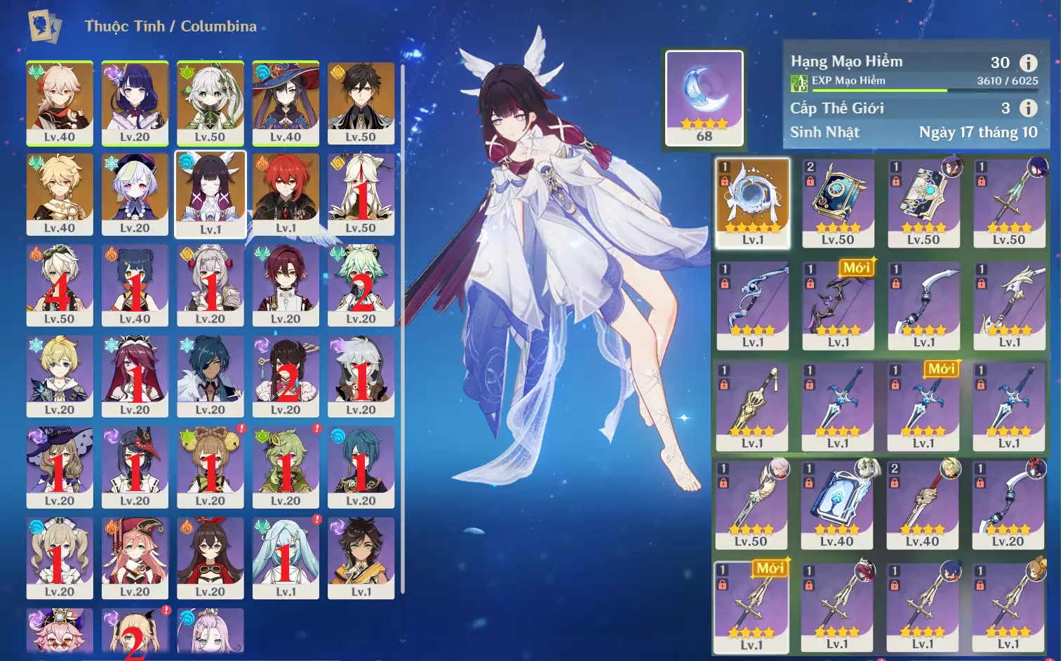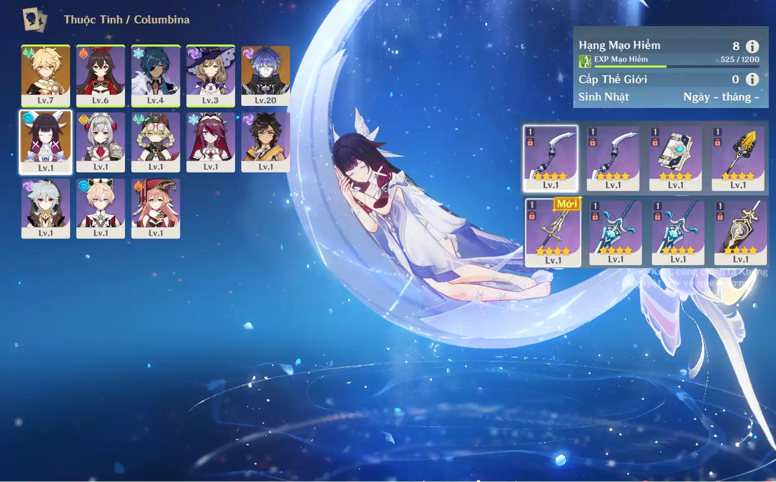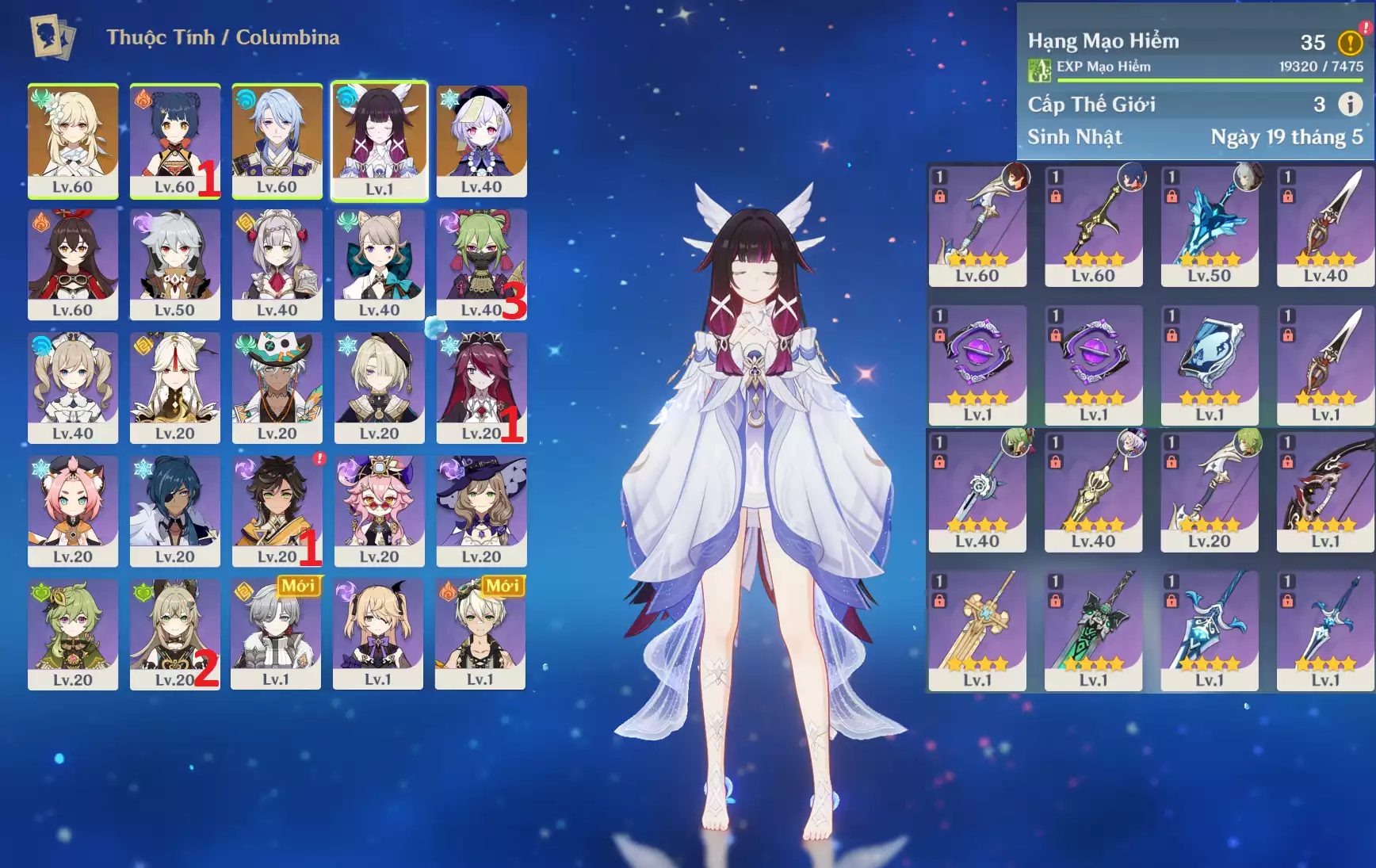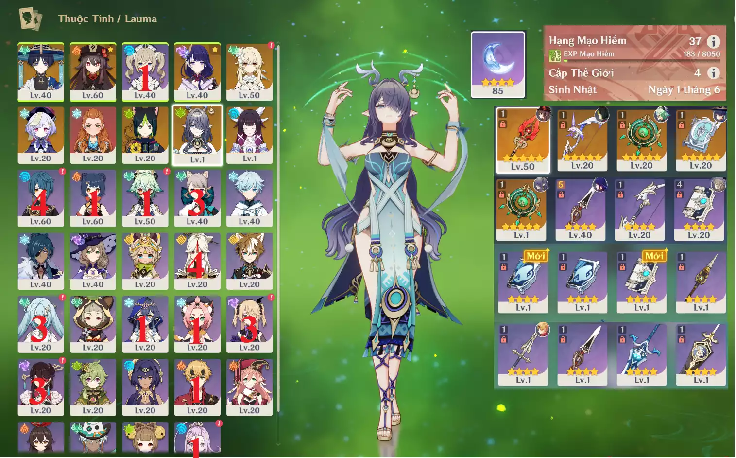 #359699 1,000,000đ 1,000,000đ AR level 34 Khu Vực asia Tướng 5* 7 Ar34: Columbina QTK* + Hutao + Xiao + Nilou + Tighnari JeanC1 bennetC2 , banner nhân vật 6 trang Tướng : 7 Vũ khí : 1 Chi tiết