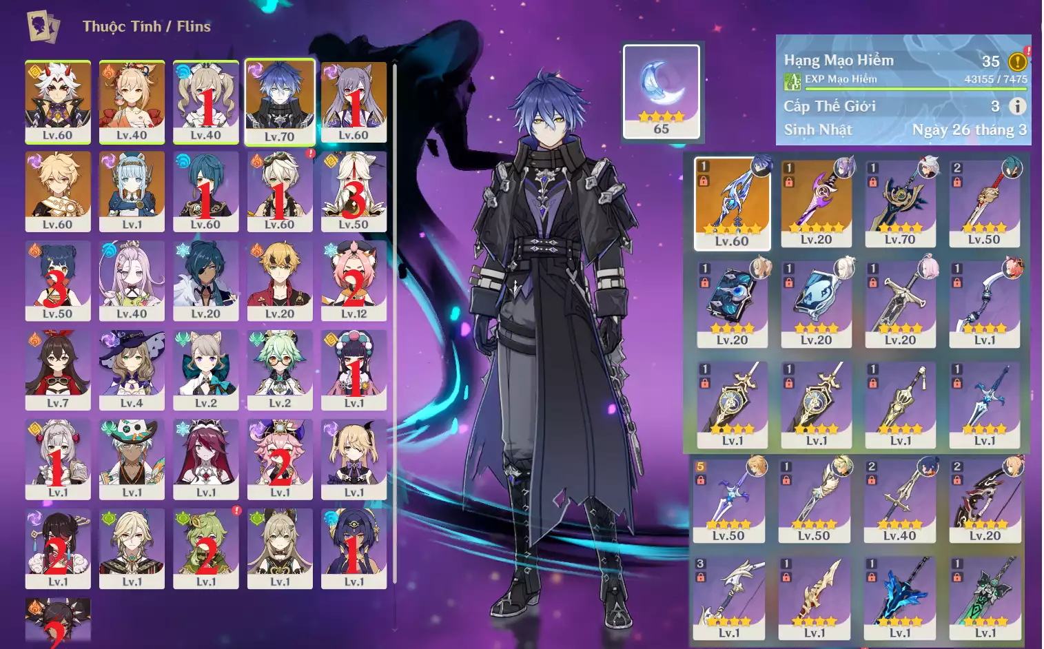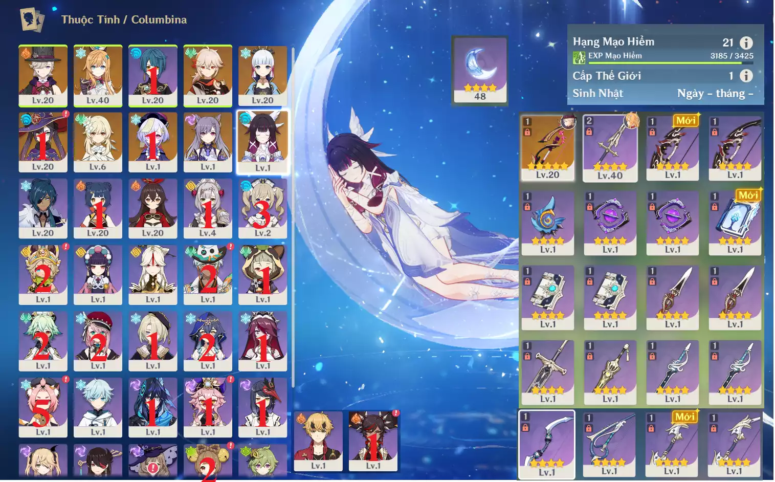 #359696 3,000,000đ 3,000,000đ AR level 35 Khu Vực asia Tướng 5* 9 SIÊU PHẨM Ar35: Nguyệt thần Columbina trấn DKHM* + Arlecchino Hộ Ma + Zhongli + Raiden Shogun BAAL + Chiori + Mizuki + JeanC1 QiQi Tighnari + xingqiuC6 RosariaC6 , chưa set sinh nhật Tướng : 9 Vũ khí : 2 Chi tiết