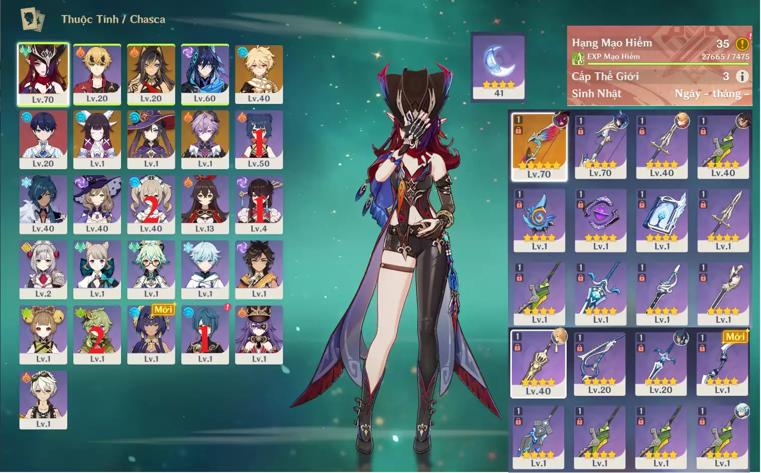 #359702 2,000,000đ 2,000,000đ AR level 35 Khu Vực asia Tướng 5* 6 VIP Ar35: Chasca trấn XVTT* + Columbina + Durin + Dehya Mona bennet, banner vũ khí 4 trang , chưa set sinh nhật Tướng : 6 Vũ khí : 1 Chi tiết