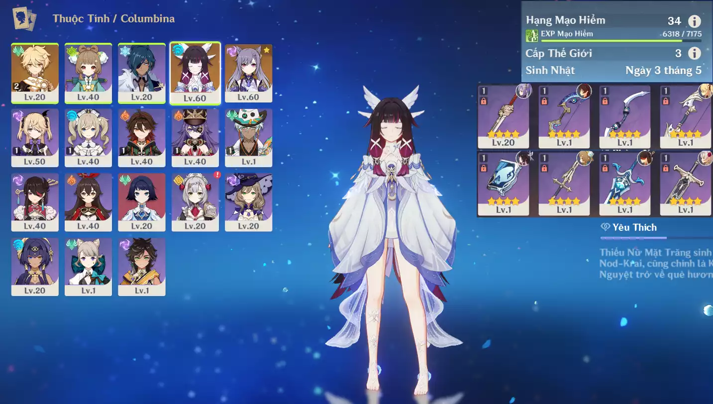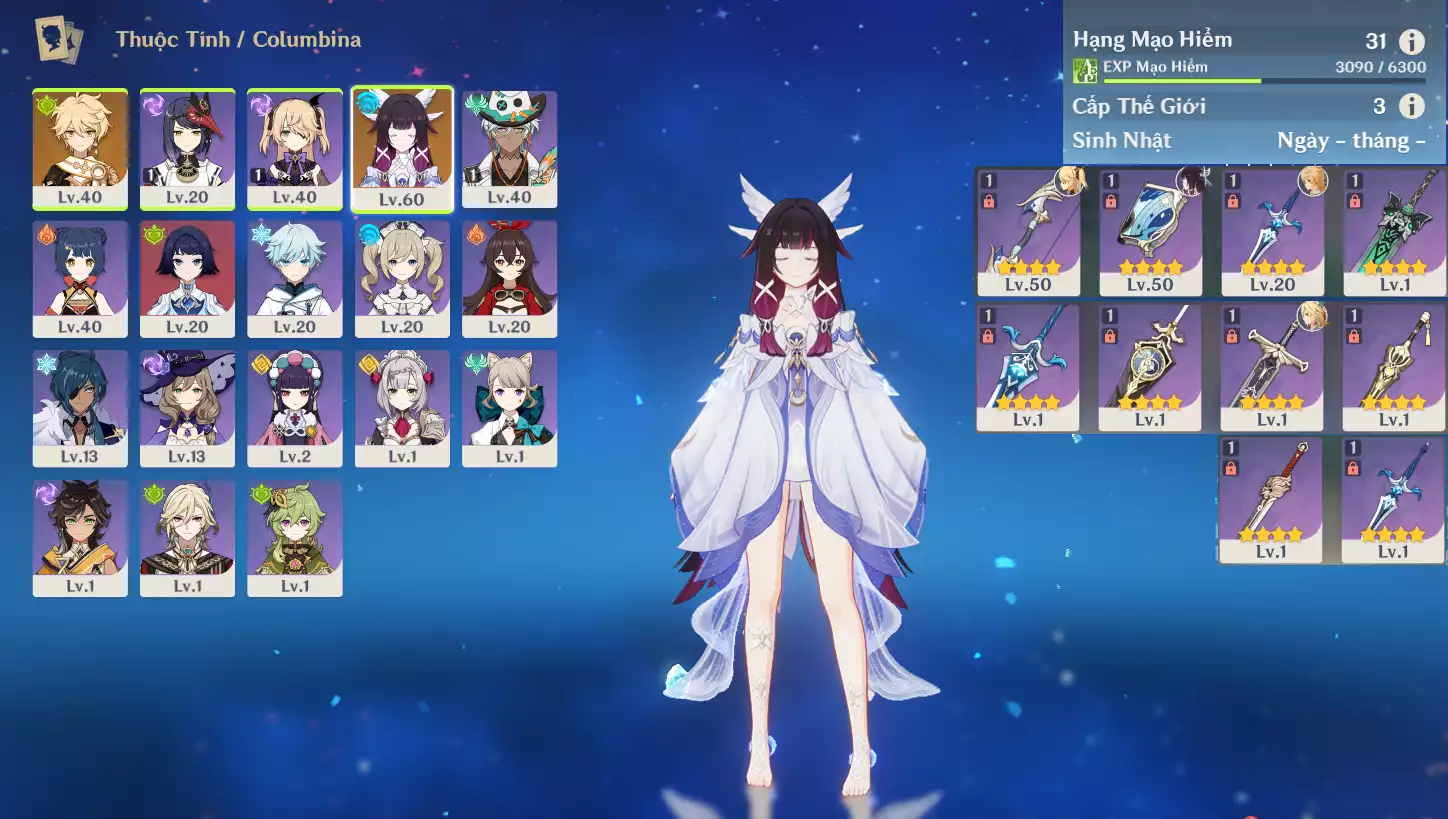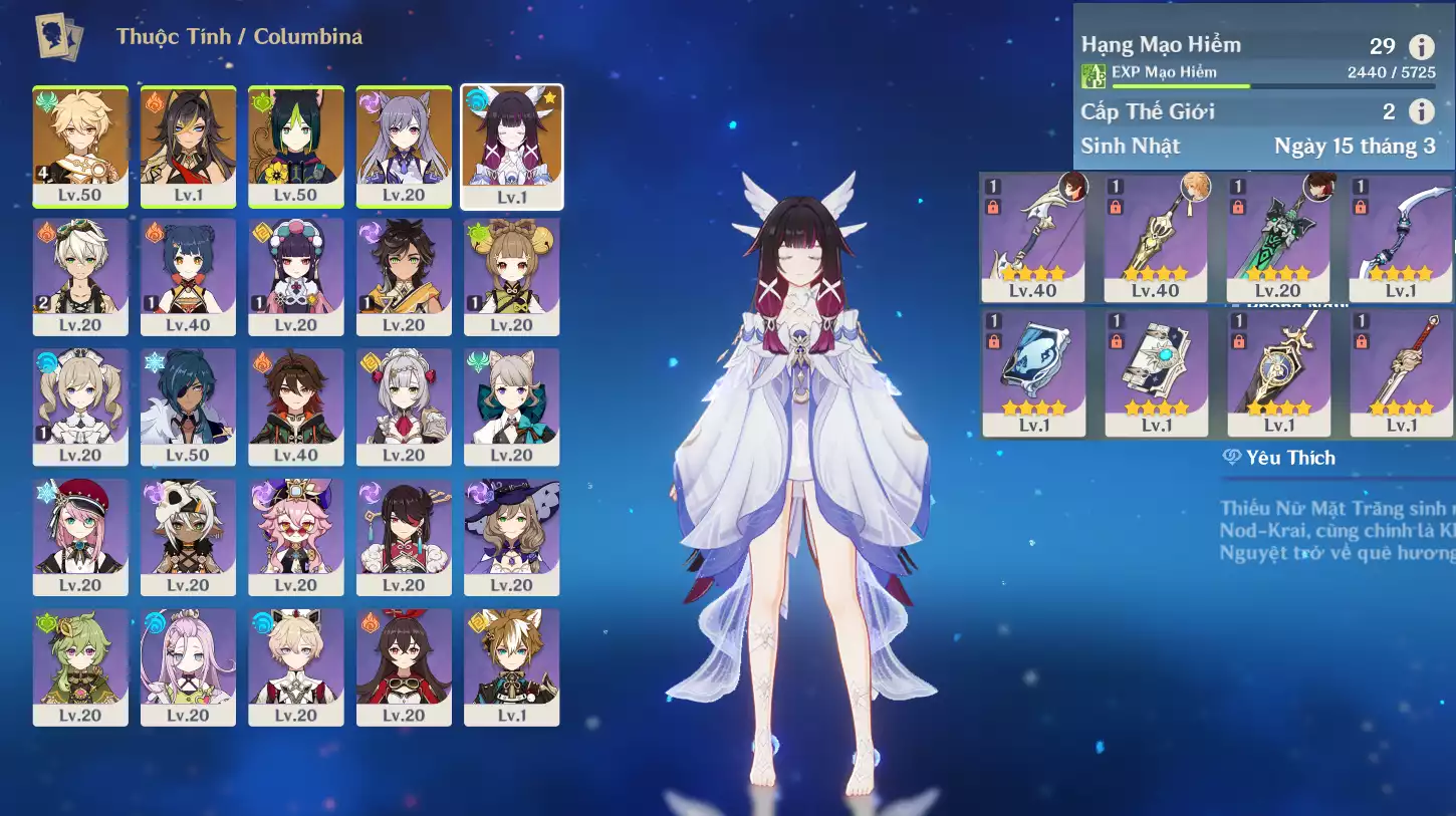 #361780 300,000đ 300,000đ AR level 34 Khu Vực asia Tướng 5* 2 Ar34 : Nguyệt thần Columbina + Keqing _ banner nhân vật 7 trang ( chưa set user ) _ map zin 95% Tướng : 2 Vũ khí : 0 Chi tiết