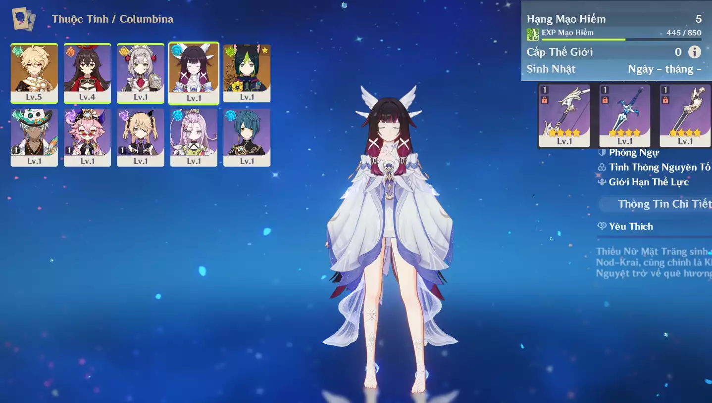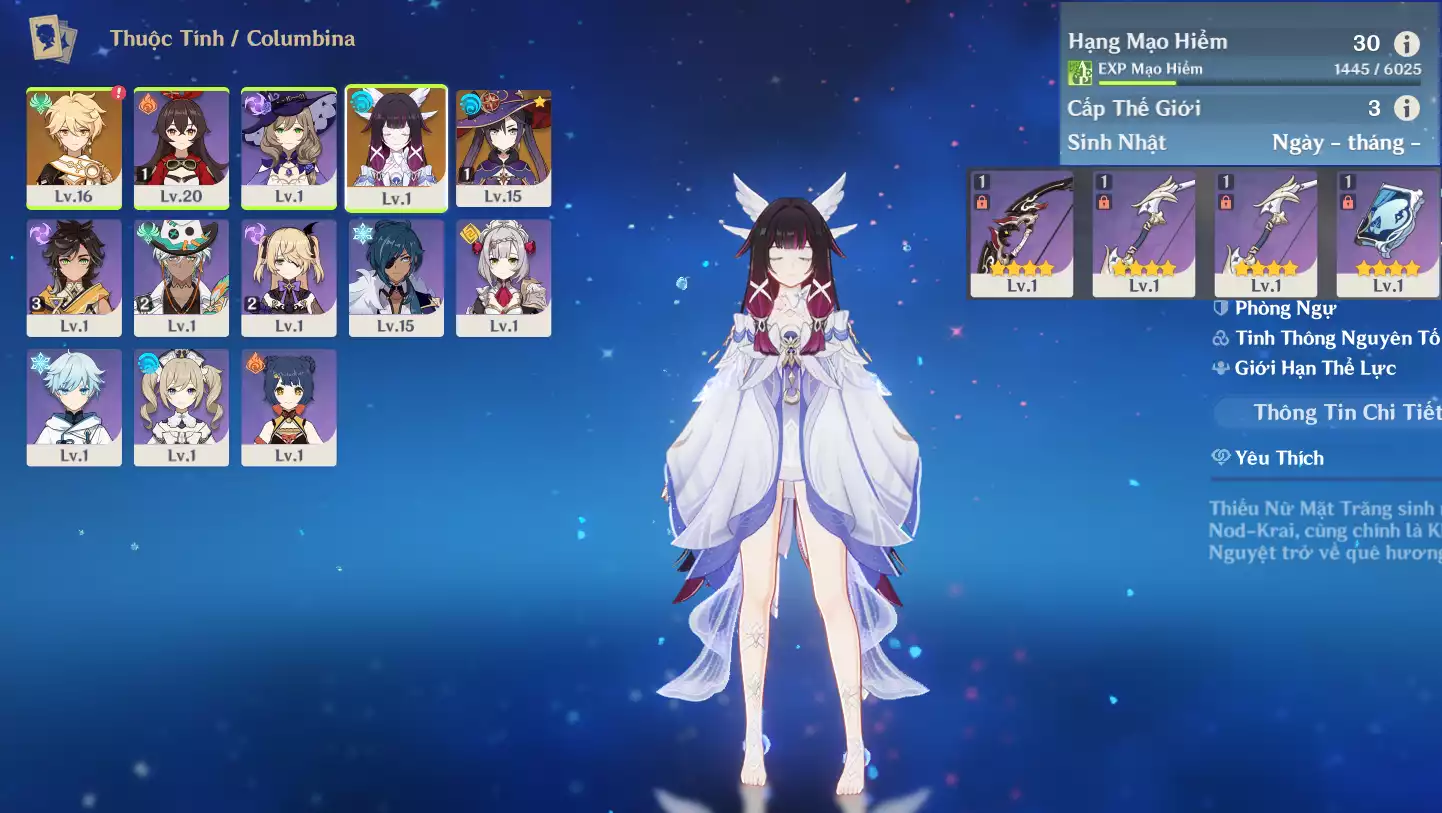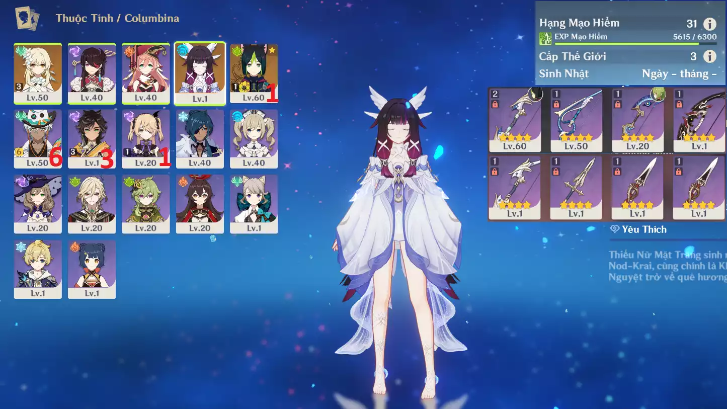 #361781 349,000đ 349,000đ AR level 29 Khu Vực asia Tướng 5* 4 Ar29 : Nguyệt thần Columbina + Tighnari + Dehya + Keqing _ banner nhân vật 3 trang ( chưa set user ) _ map zin 99% Tướng : 4 Vũ khí : 0 Chi tiết