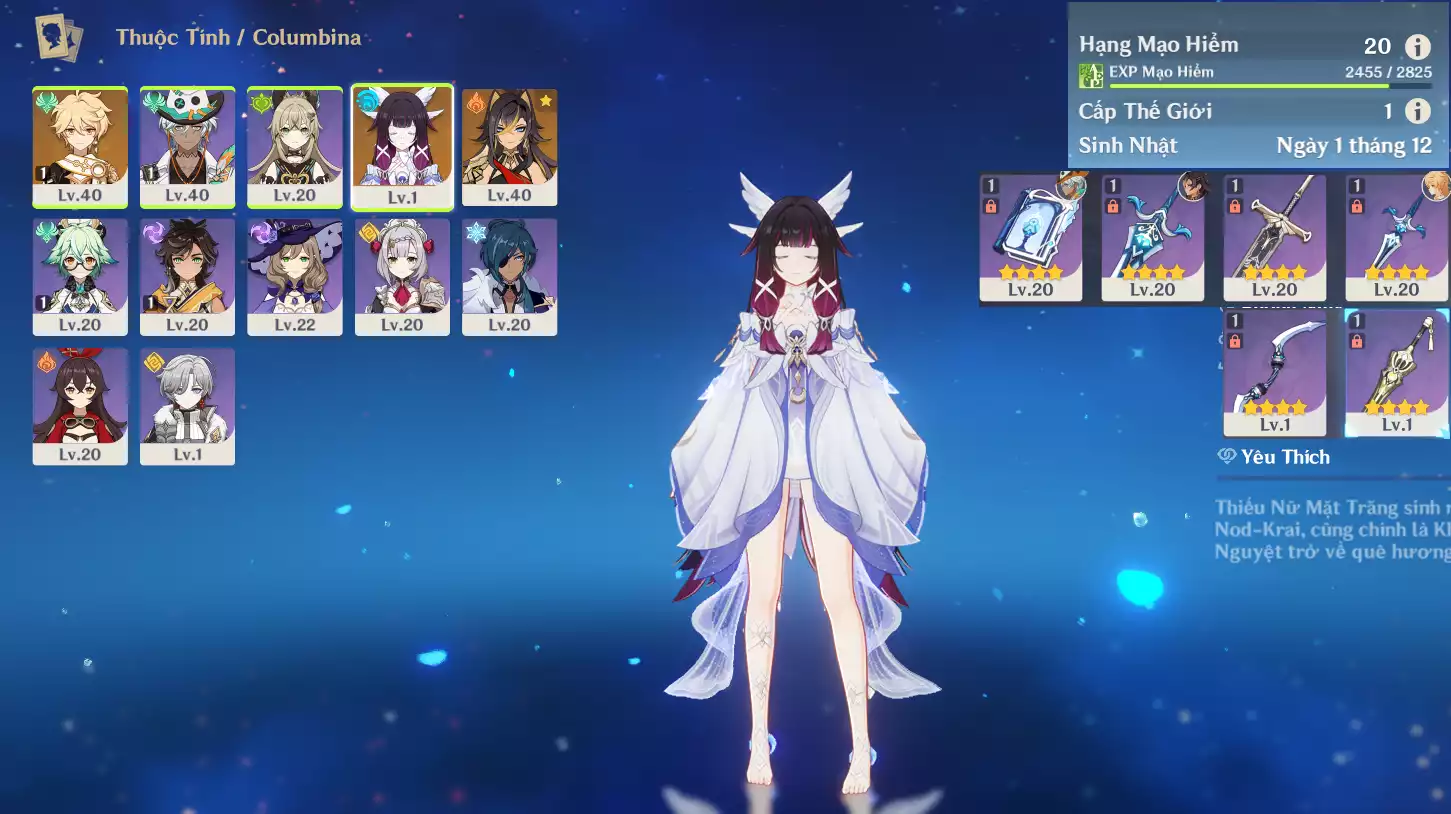 #361790 499,000đ 499,000đ AR level 5 Khu Vực asia Tướng 5* 2 acc khởi đầu Ar5 : Nguyệt thần Columbina + Tighnari _ banner nhân vật 2 trang ( chưa set user + sinh nhật ) Tướng : 2 Vũ khí : 0 Chi tiết