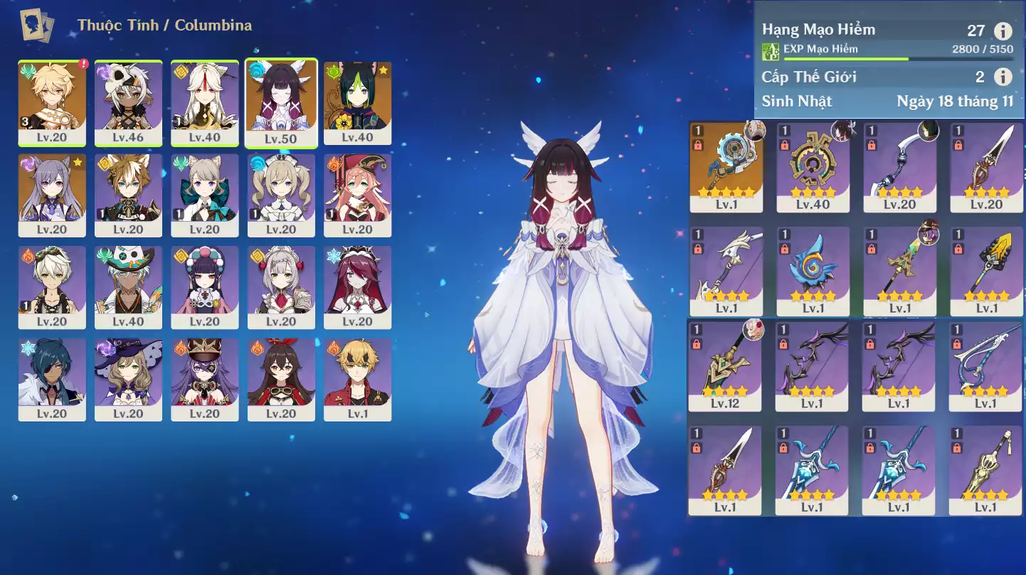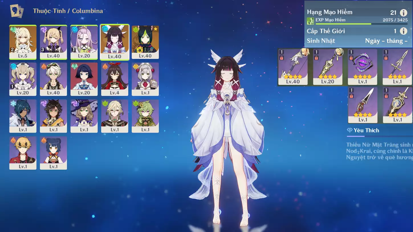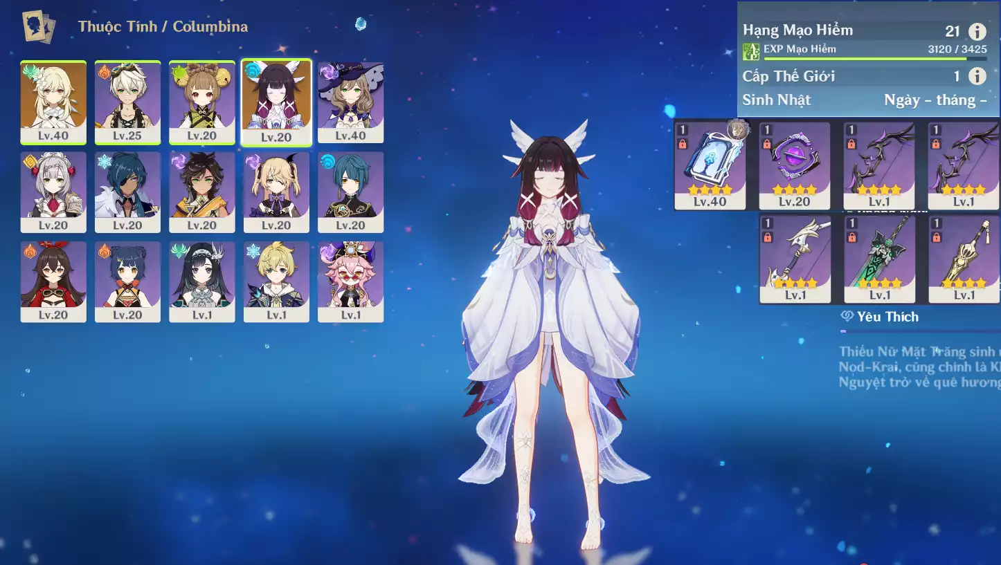 #361788 400,000đ 400,000đ AR level 21 Khu Vực asia Tướng 5* 2 Ar21 : Nguyệt thần Columbina + Tighnari _ banner nhân vật 7 trang ( chưa set user + sinh nhật ) _ map zin 99% Tướng : 2 Vũ khí : 0 Chi tiết