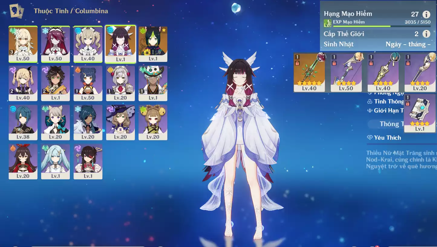 #361791 300,000đ 300,000đ AR level 35 Khu Vực asia Tướng 5* 2 Ar35 : Nguyệt thần Columbina + Tighnari _ banner nhân vật 5 trang ( chưa set user + sinh nhật ) _ map zin 95% Tướng : 2 Vũ khí : 0 Chi tiết