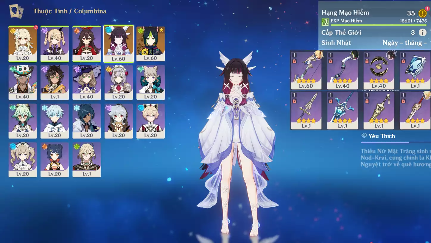 #361786 400,000đ 400,000đ AR level 21 Khu Vực asia Tướng 5* 1 Ar21 : Nguyệt thần Columbina _ banner nhân vật 2 trang ( chưa set user + sinh nhật ) _ map zin 99% Tướng : 1 Vũ khí : 0 Chi tiết