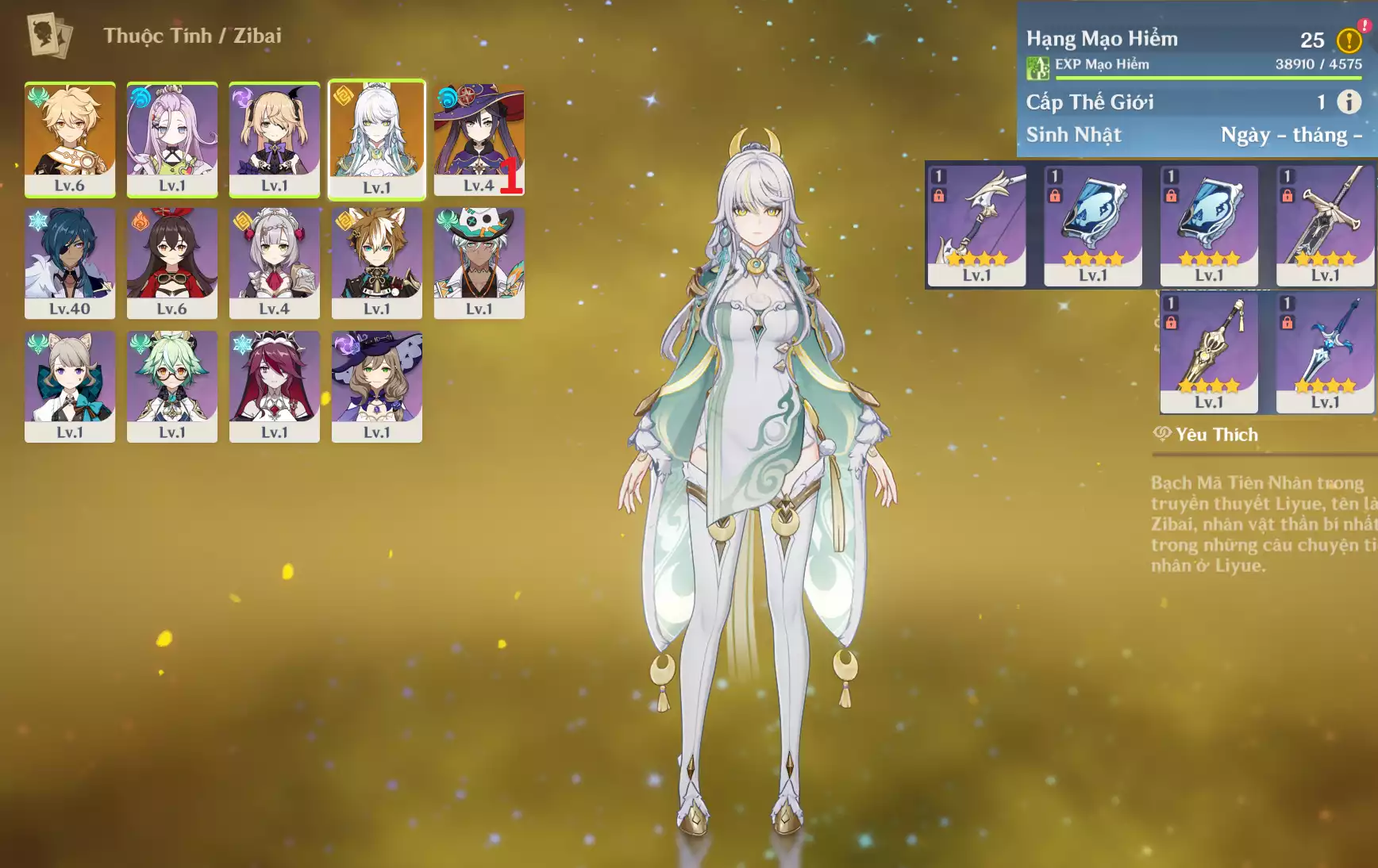 #359581 600,000đ 600,000đ AR level 5 Khu Vực asia Tướng 5* 3 Ar5 : Top1 dps hệ nham Zibai + Dehya + Jean _ banner nhân vật 3 trang ( chưa set user + sinh nhật ) Tướng : 3 Vũ khí : 0 Chi tiết