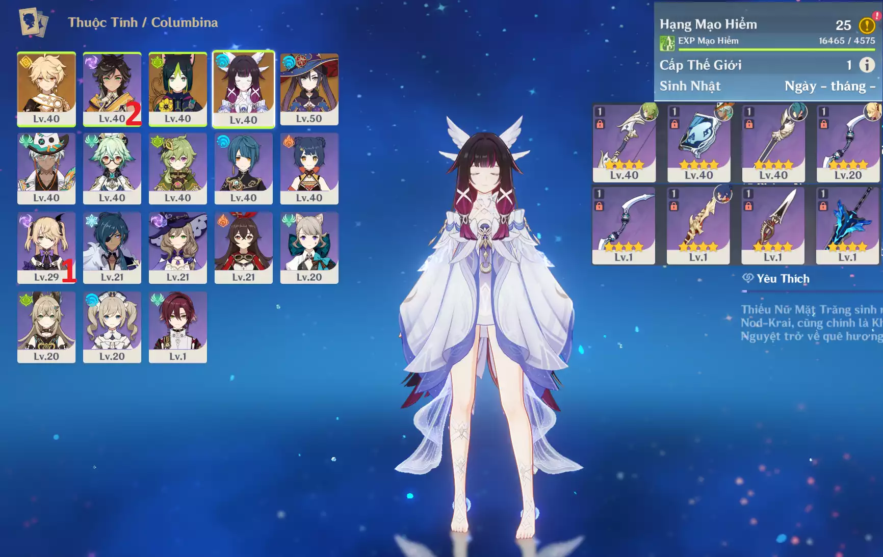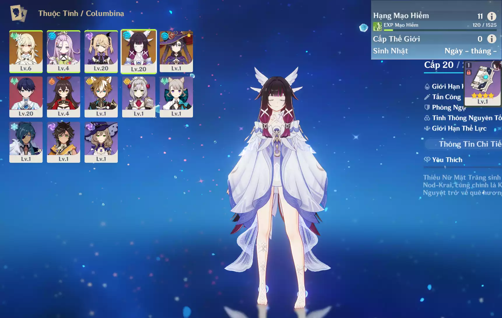 #359585 549,000đ 549,000đ AR level 11 Khu Vực asia Tướng 5* 2 Ar11 : Nguyệt thần Columbina + Mona _ banner nhân vật 4 trang ( chưa set user + sinh nhật ) Tướng : 2 Vũ khí : 0 Chi tiết