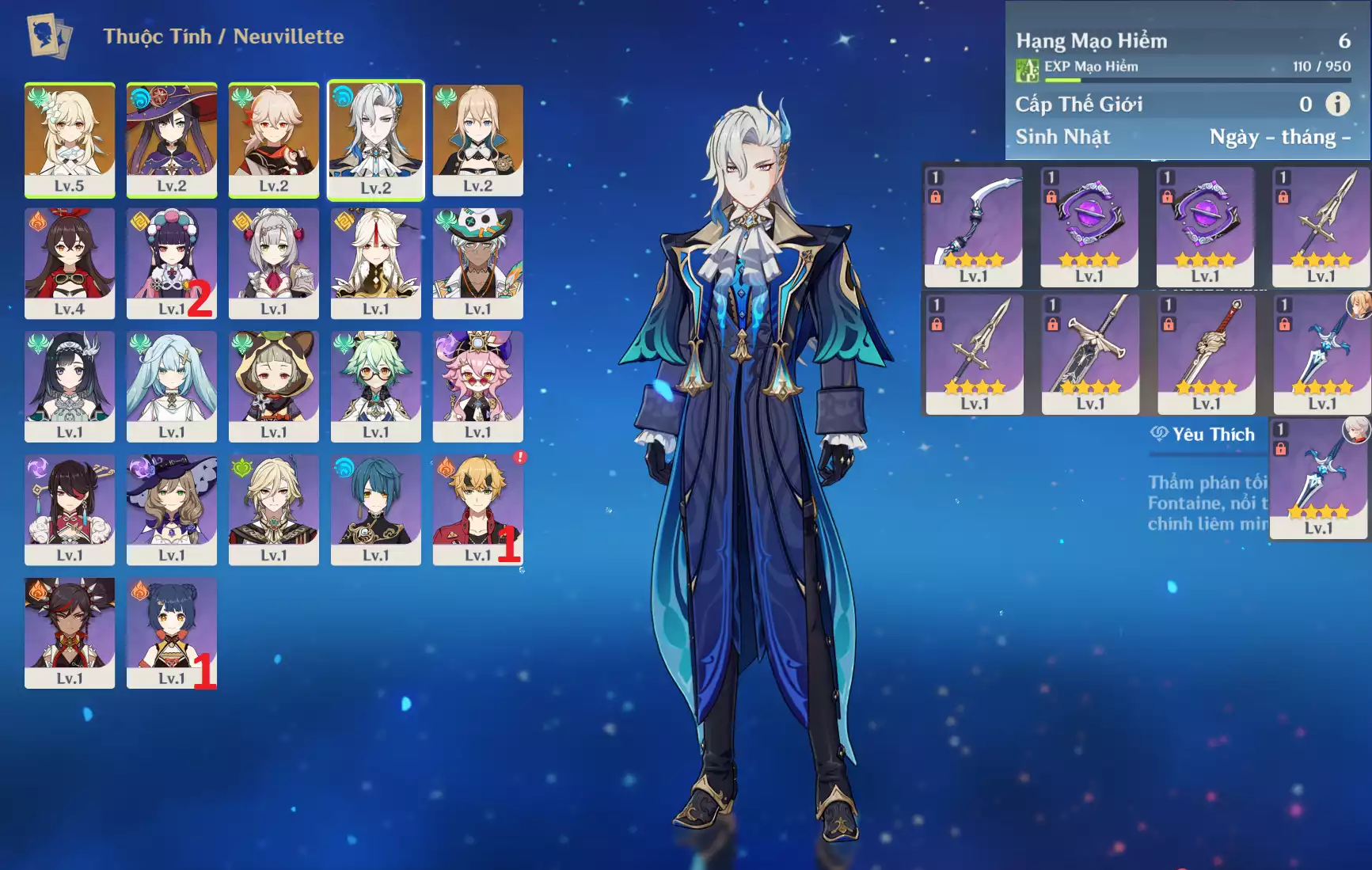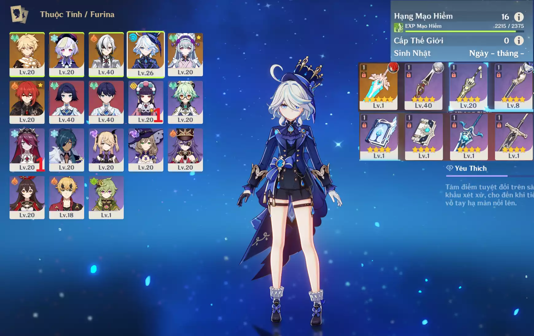 #359574 799,000đ 799,000đ AR level 16 Khu Vực asia Tướng 5* 5 Ar16 : Arlecchino + Furina + Mizuki + Diluc + QiQi + TKKN _ banner nhân vật ĐÃ LỆCH 10/90 ( chưa set user + sinh nhật ) Tướng : 5 Vũ khí : 1 Chi tiết