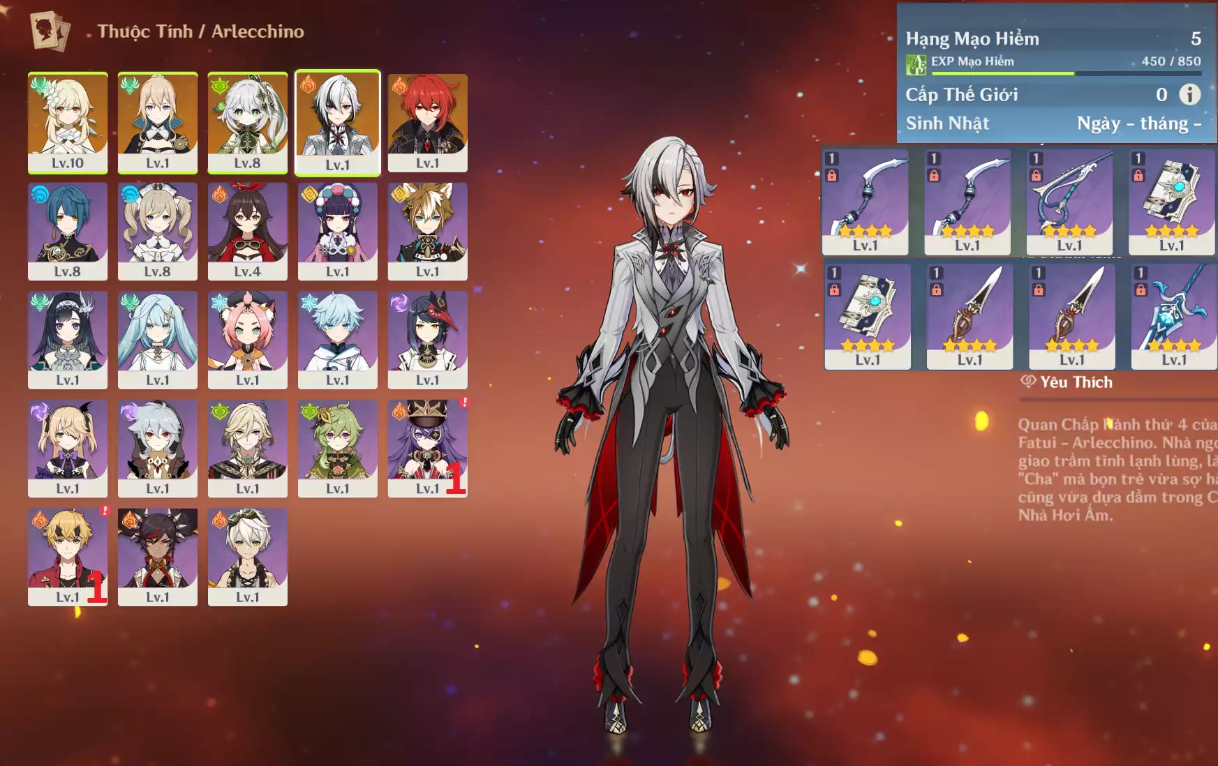 #359573 699,000đ 699,000đ AR level 5 Khu Vực asia Tướng 5* 4 Ar5 : Arlecchino + Nahida + Tighnari + Jean + Diluc _ banner nhân vật 20/90 ( chưa set user + sinh nhật ) Tướng : 4 Vũ khí : 0 Chi tiết