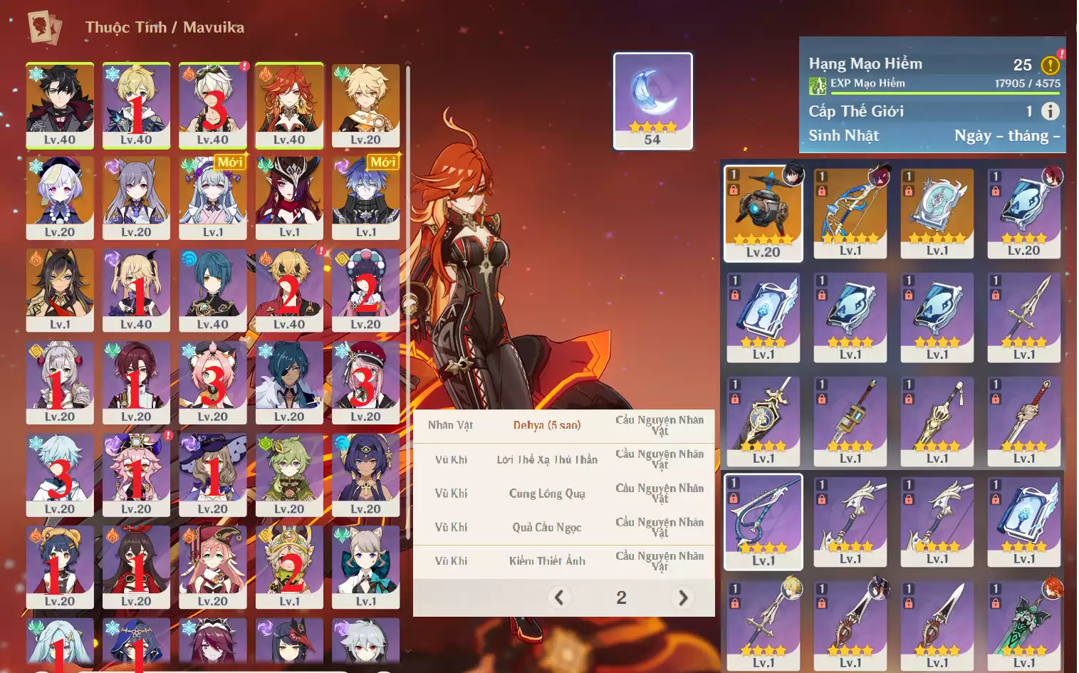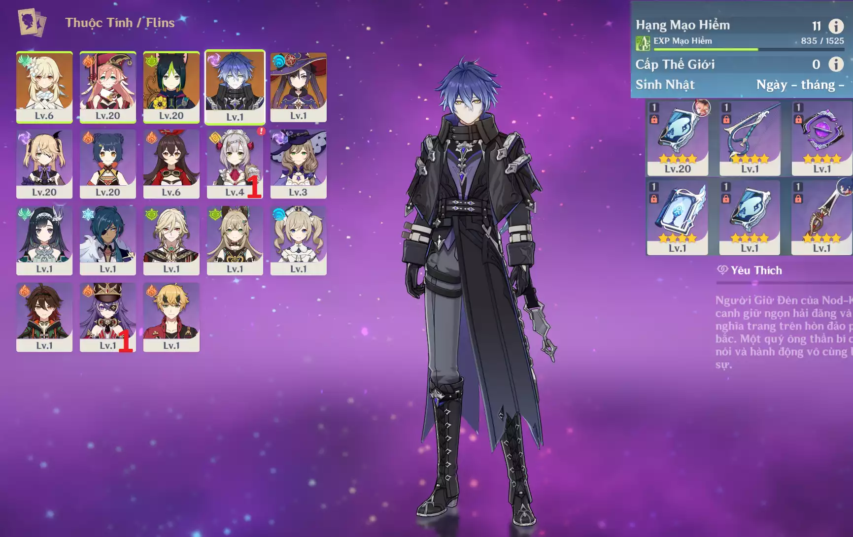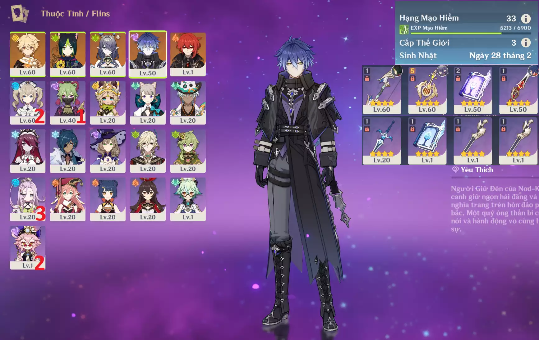 VIP Ar25: Char mới Flins + Wriot trấn QĐVR* + Mavuika + Chasca cung5* + Mizuki Dehya QiQi Keqing bennetC3 main NAM , banner nhân vật ĐÃ LỆCH 5 trang , chưa set user _ chưa set sinh nhật