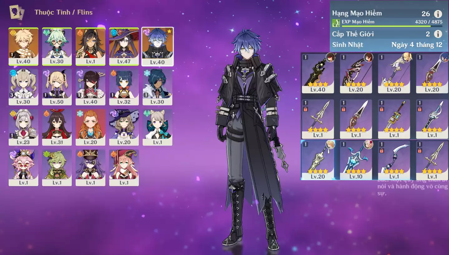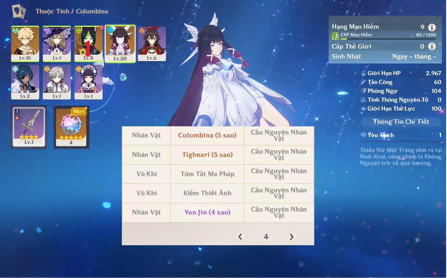 #361593 499,000đ 499,000đ AR level 9 Khu Vực asia Tướng 5* 2 Ar9: Nguyệt thần Columbina + TighnariCm1 main NAM , banner nhân vật 4 trang + 4roll hồng , chưa set user _ chưa set sinh nhật Tướng : 2 Vũ khí : 0 Chi tiết