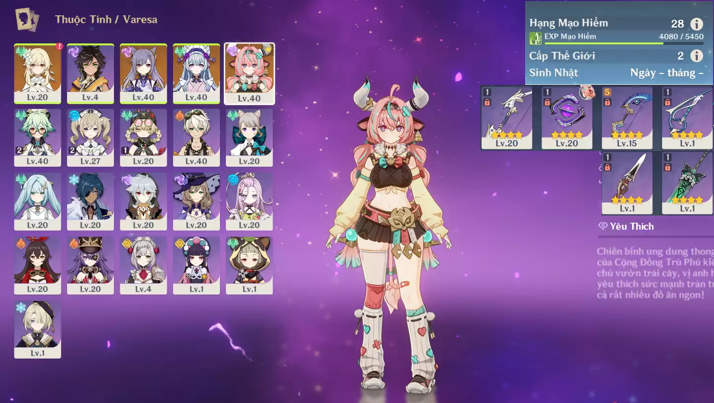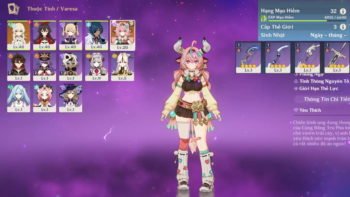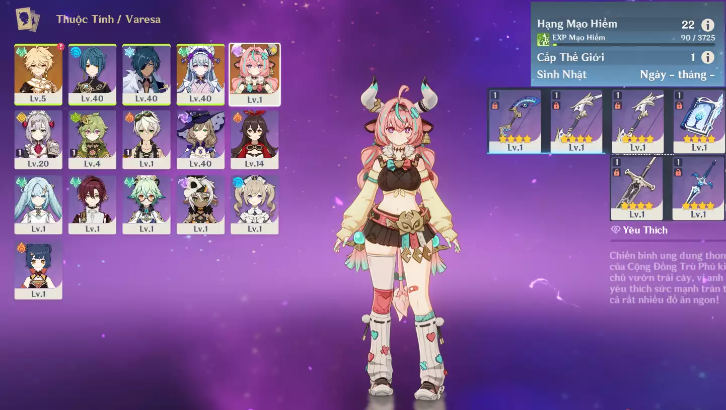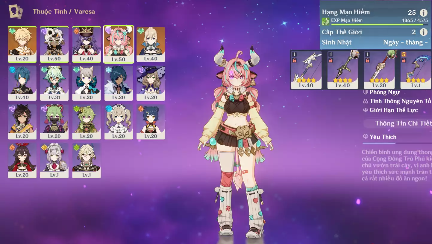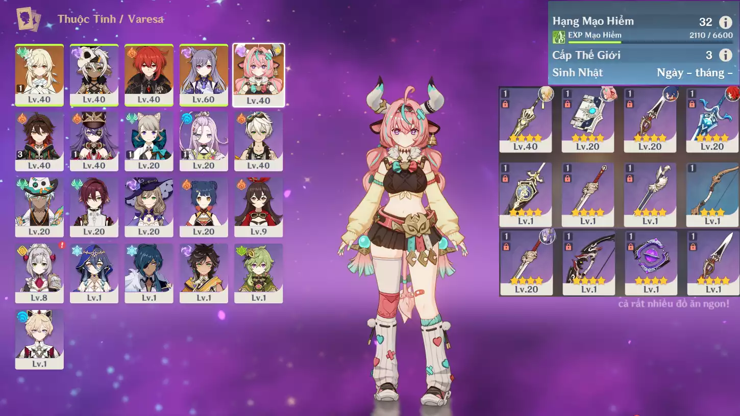 #361600 400,000đ 400,000đ AR level 28 Khu Vực asia Tướng 5* 3 Ar28 : Varesa + Mizuki + Keqing _ banner nhân vật 2 trang ( chưa set user + sinh nhật ) _ map zin hơn 95% Tướng : 3 Vũ khí : 0 Chi tiết