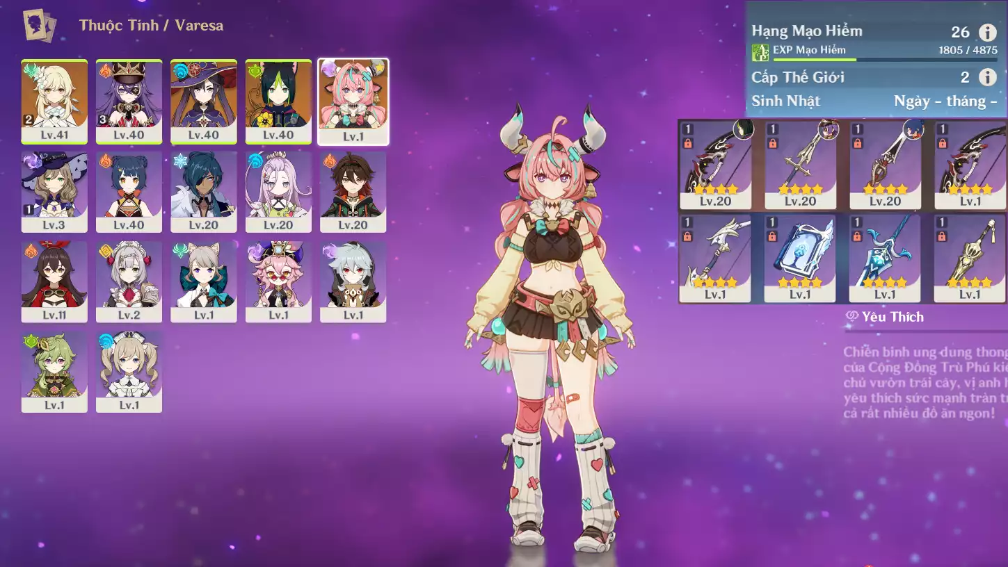 #361604 399,000đ 399,000đ AR level 26 Khu Vực asia Tướng 5* 3 Ar26 : Varesa + Tighnari + Mona _ banner nhân vật 20/90 lần ( chưa set user + sinh nhật ) Tướng : 3 Vũ khí : 0 Chi tiết