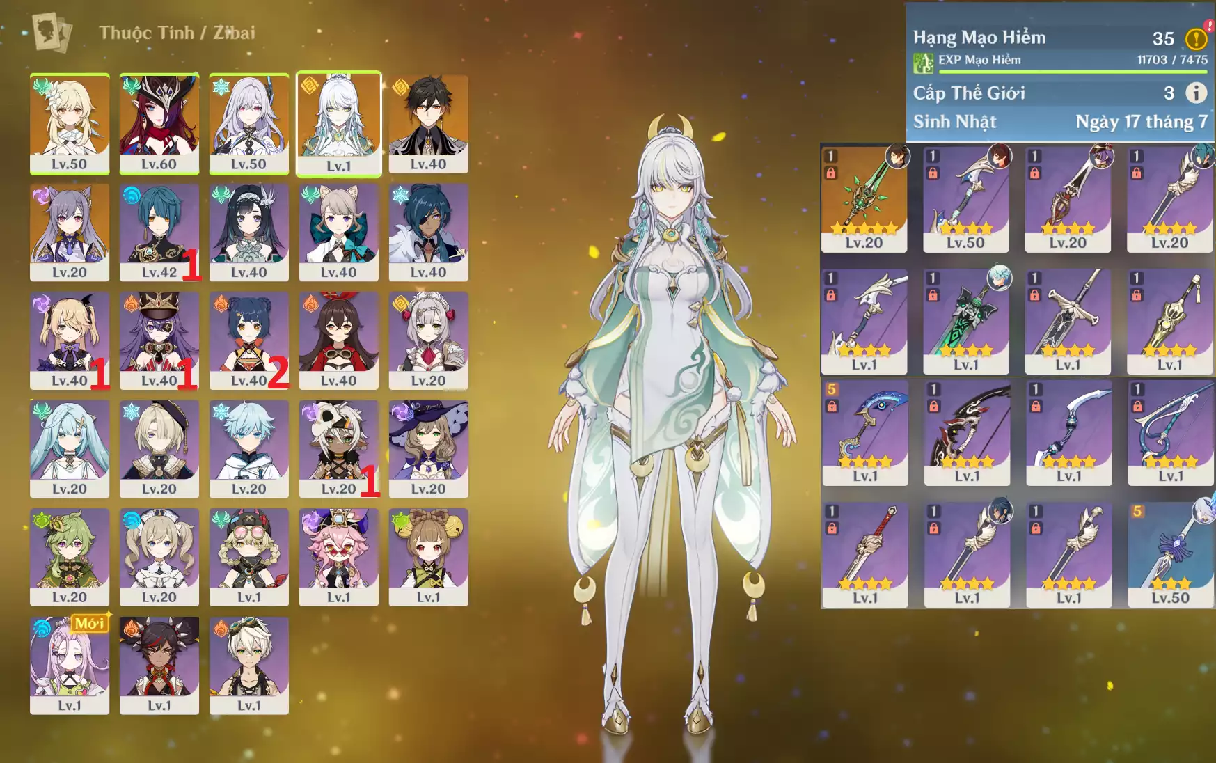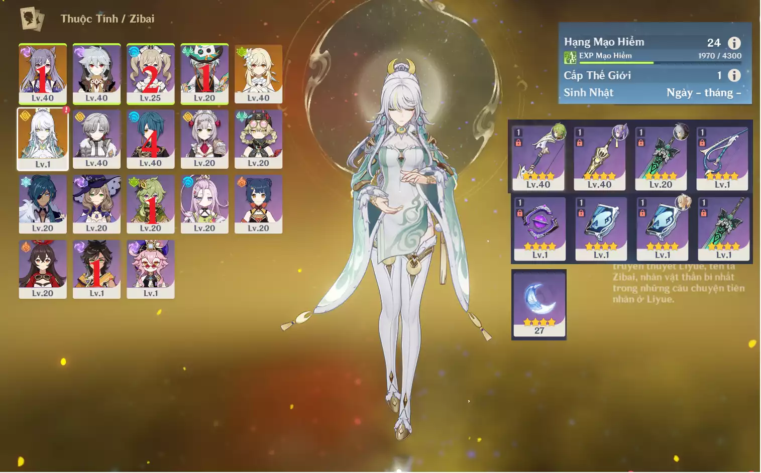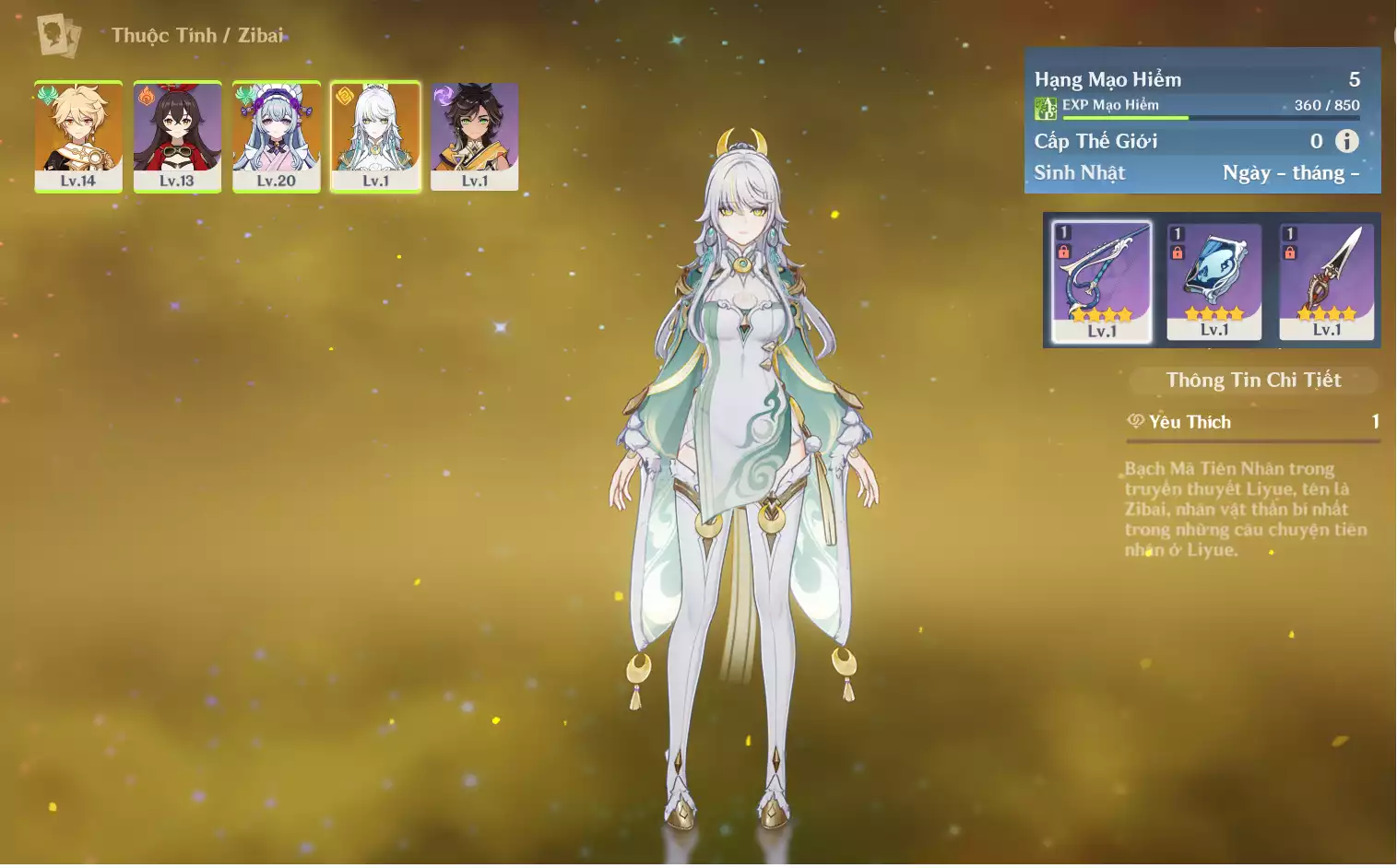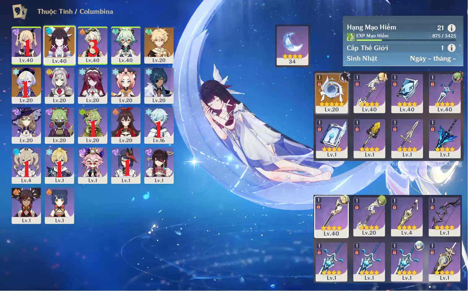 #359449 1,000,000đ 1,000,000đ AR level 21 Khu Vực asia Tướng 5* 3 Ar21: Nguyệt thần Columbina trấn Dạ Khúc Hạ Màn* + QiQic1 bennetC3 main NAM , chưa set user_chưa set sinh nhật , map zin 99% Tướng : 3 Vũ khí : 1 Chi tiết