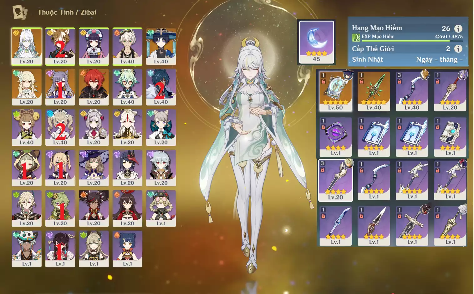 #359453 550,000đ 550,000đ AR level 18 Khu Vực asia Tướng 5* 1 Ar18 : Nguyệt thần Columbina _ banner nhân vật 3 trang ( chưa set user + sinh nhật ) _ map zin 99% Tướng : 1 Vũ khí : 0 Chi tiết