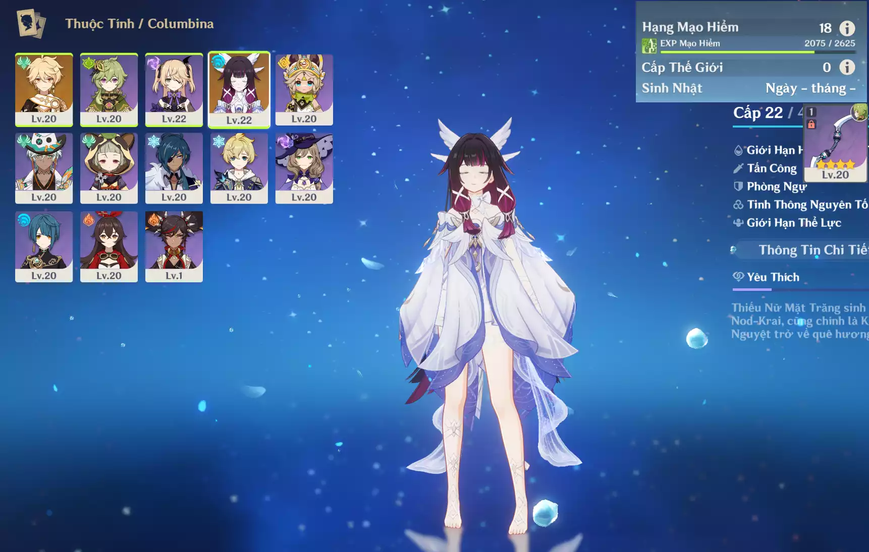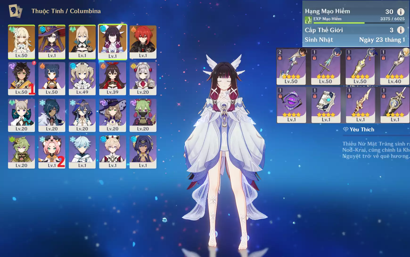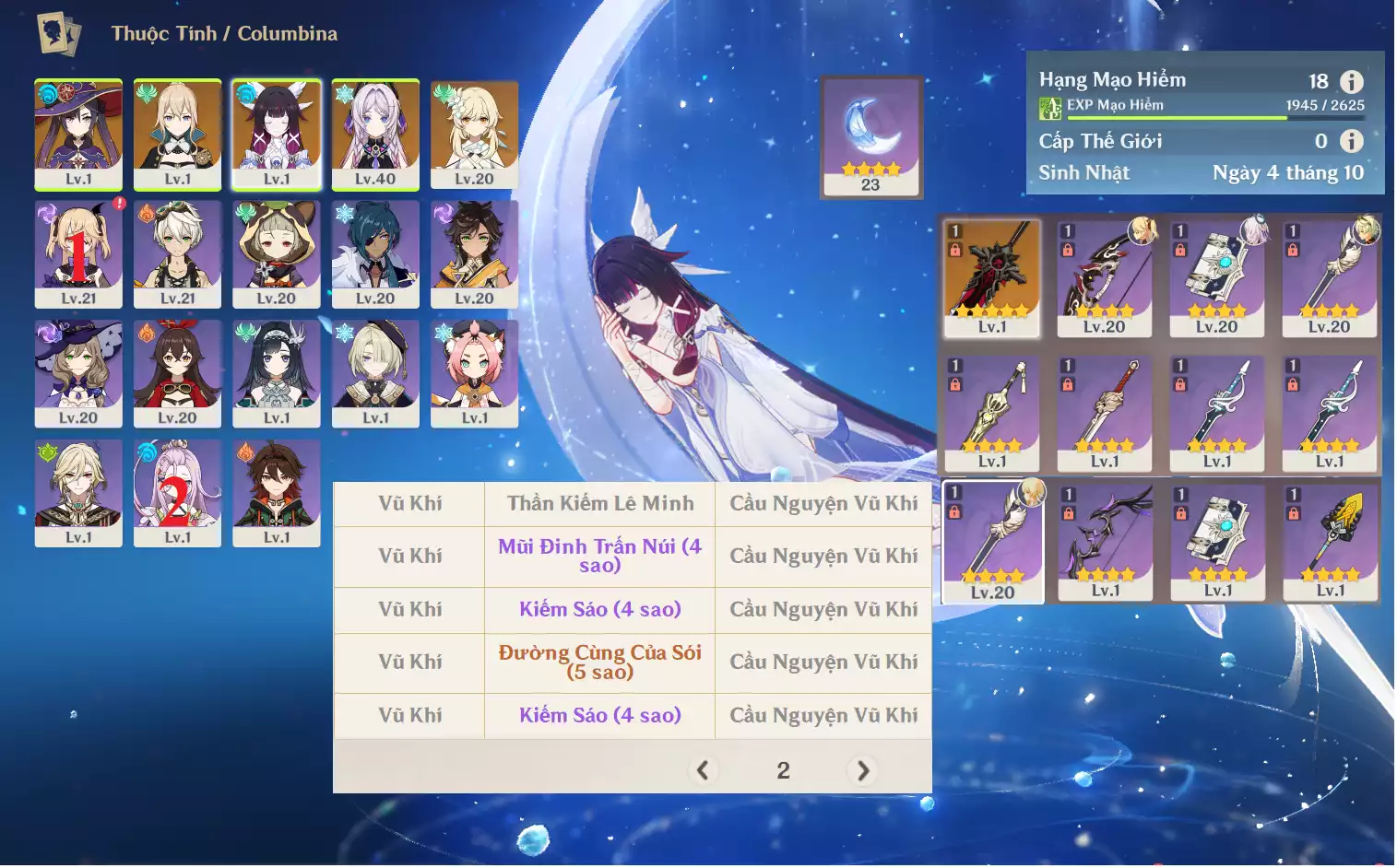 #359454 400,000đ 400,000đ AR level 30 Khu Vực asia Tướng 5* 4 Ar30 : Nguyệt thần Columbina + Jean + Mona + Diluc _ banner nhân vật 2 trang ( chưa set user + sinh nhật ) Tướng : 4 Vũ khí : 0 Chi tiết