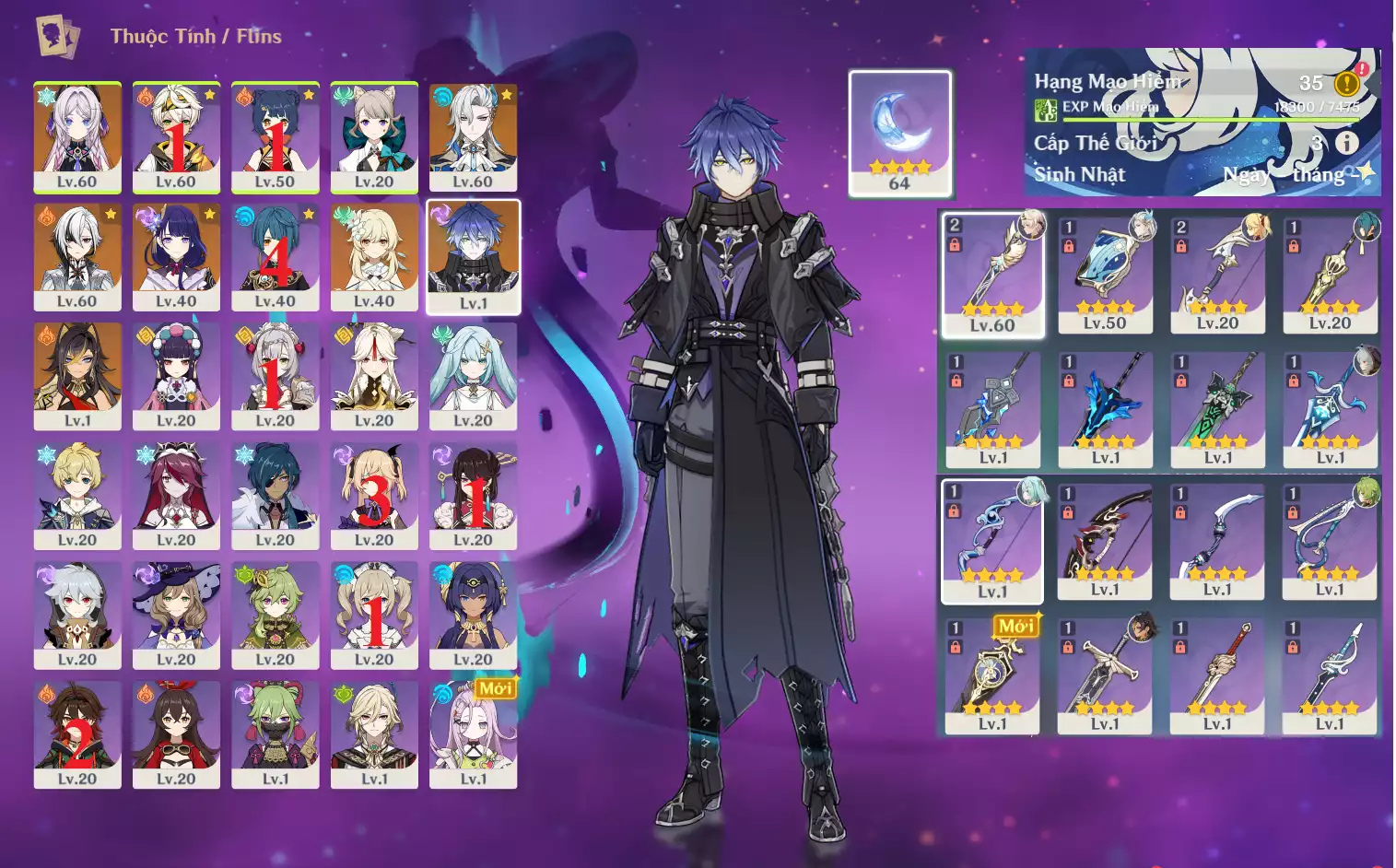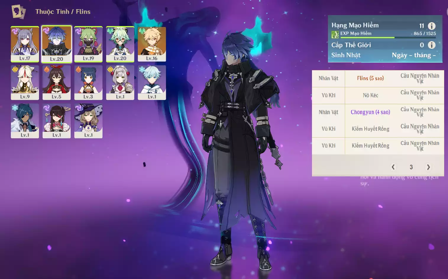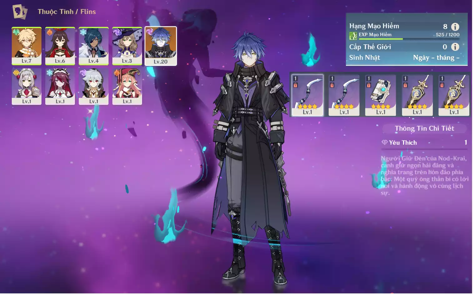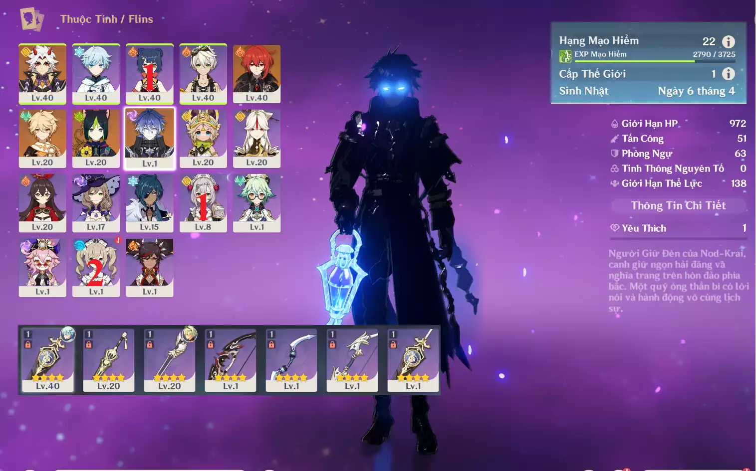 #356112 799,000đ 799,000đ AR level 28 Khu Vực asia Tướng 5* 2 VIP Ar28: Char mới Flins + Escoffier + Scaramouche ( Kẻ lang thang ) main NAM , chưa set user Tướng : 2 Vũ khí : 0 Chi tiết