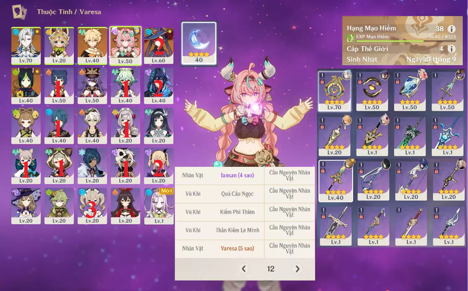 #356105 599,000đ 599,000đ AR level 38 Khu Vực asia Tướng 5* 5 Ar38 : Varesa + Neuvillette + MonaCM2 Tighnari main NAM , banner nhân vật 16 trang sure nổ , chưa set user _ chưa set sinh nhật Tướng : 5 Vũ khí : 0 Chi tiết
