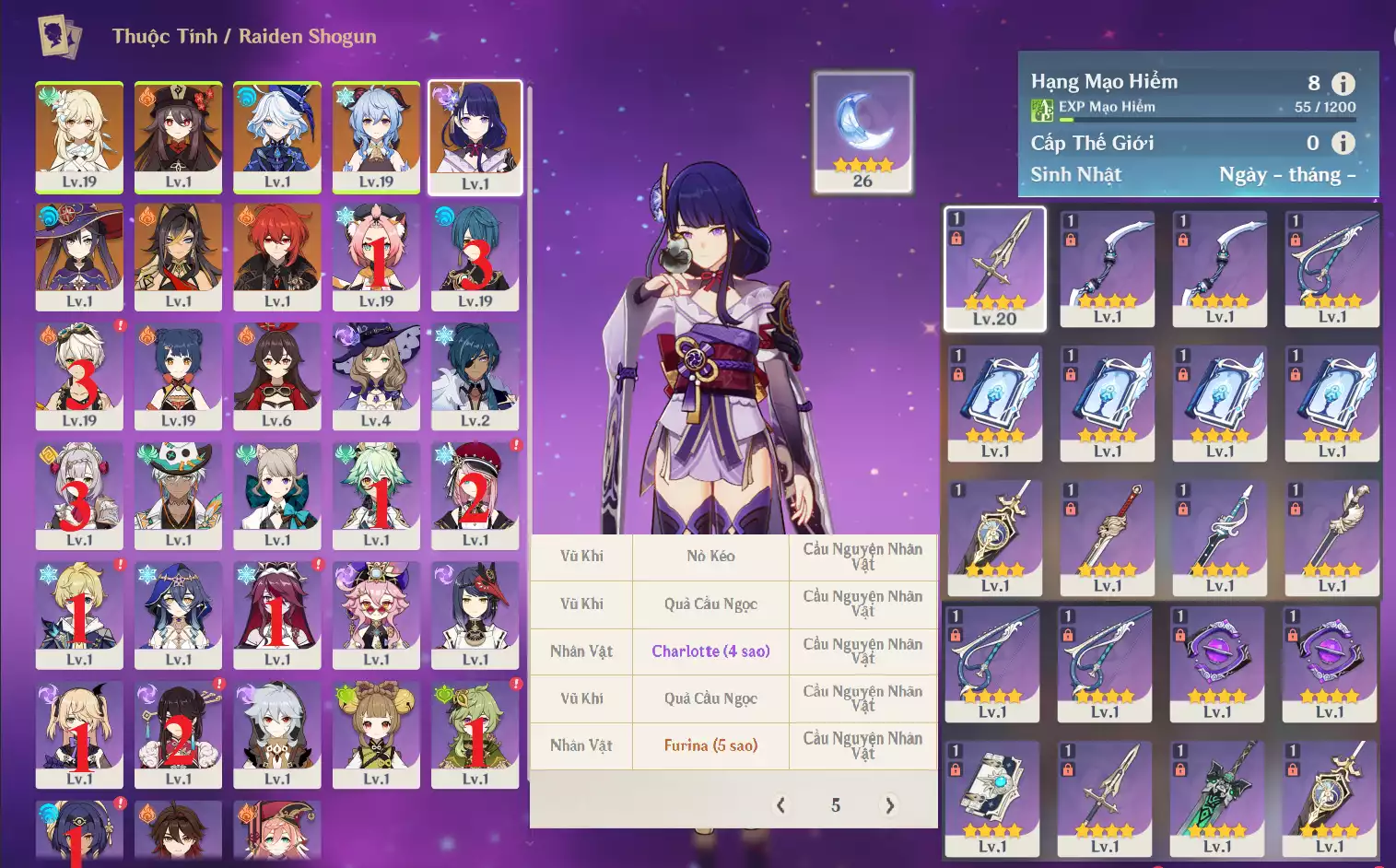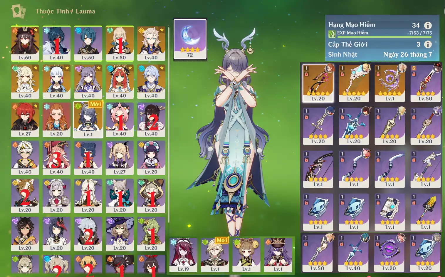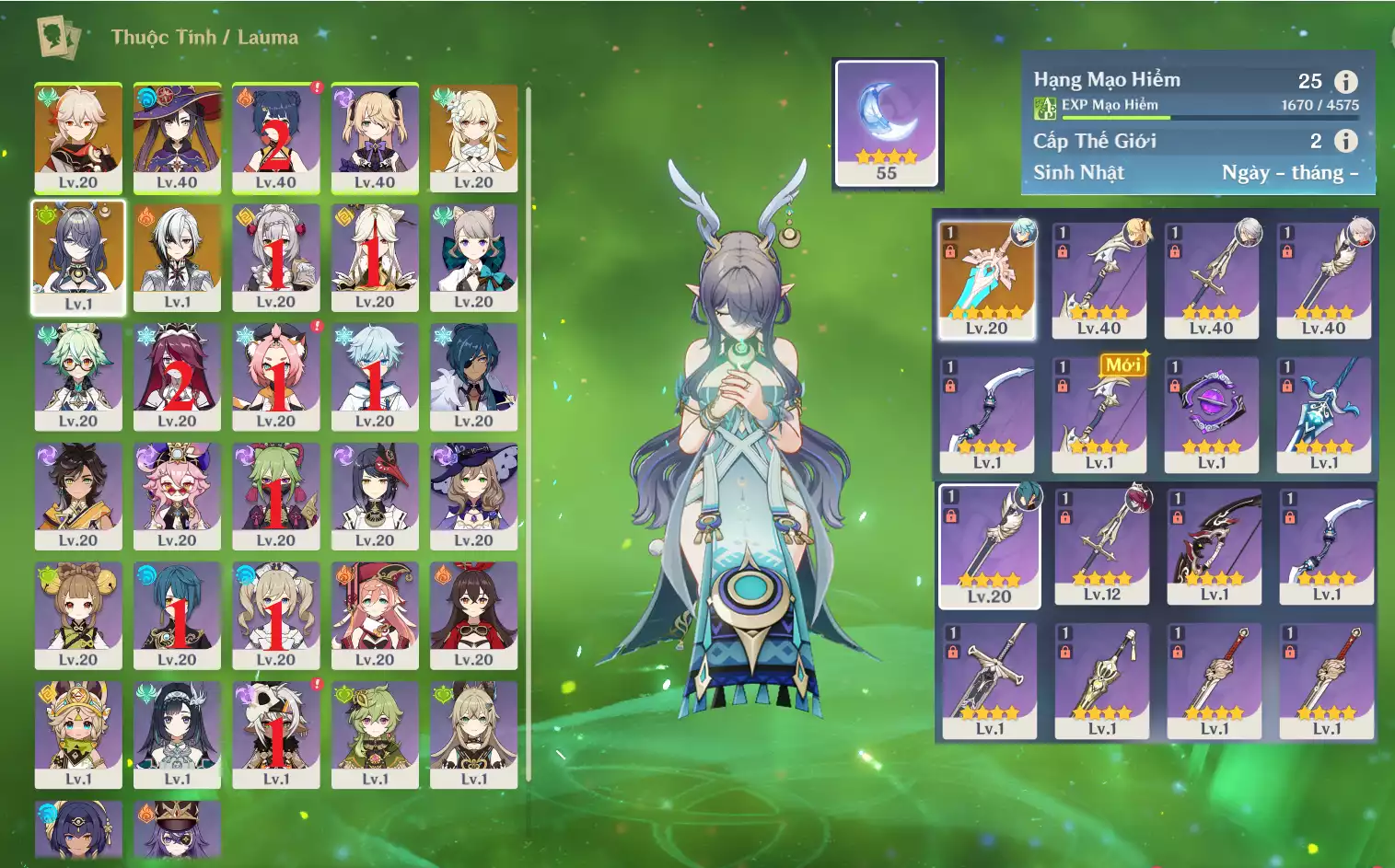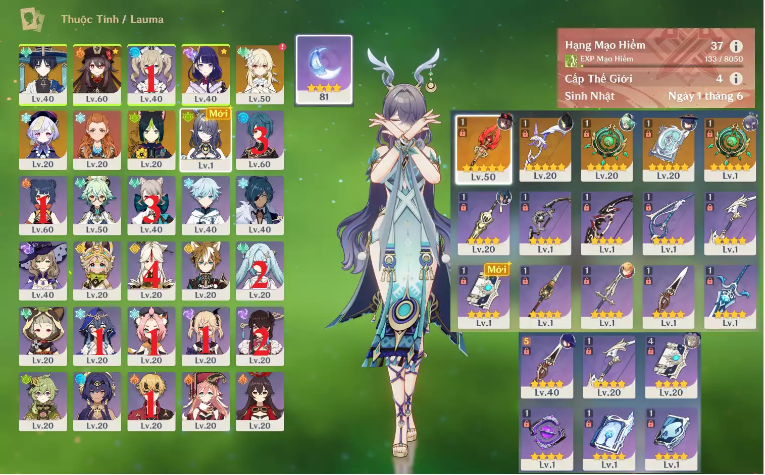 VIP Ar37: Char mới hot Lauma vk5* + Hutao Trấn hộ ma + Scaramouche (kẻ lang thang) DTTP* + Raiden shogun Baal + Tighnari Amos* qiqi , banner nhân vật 8 trang , chưa set mail