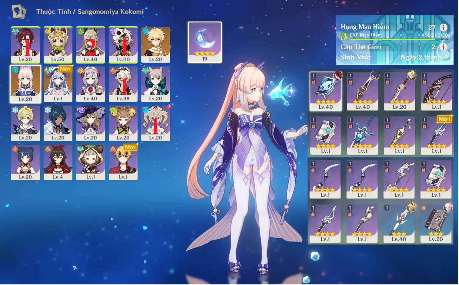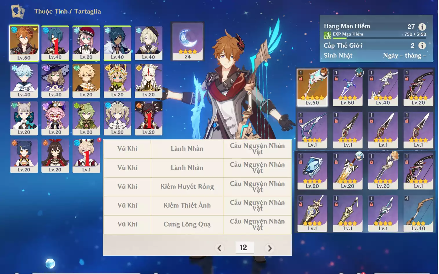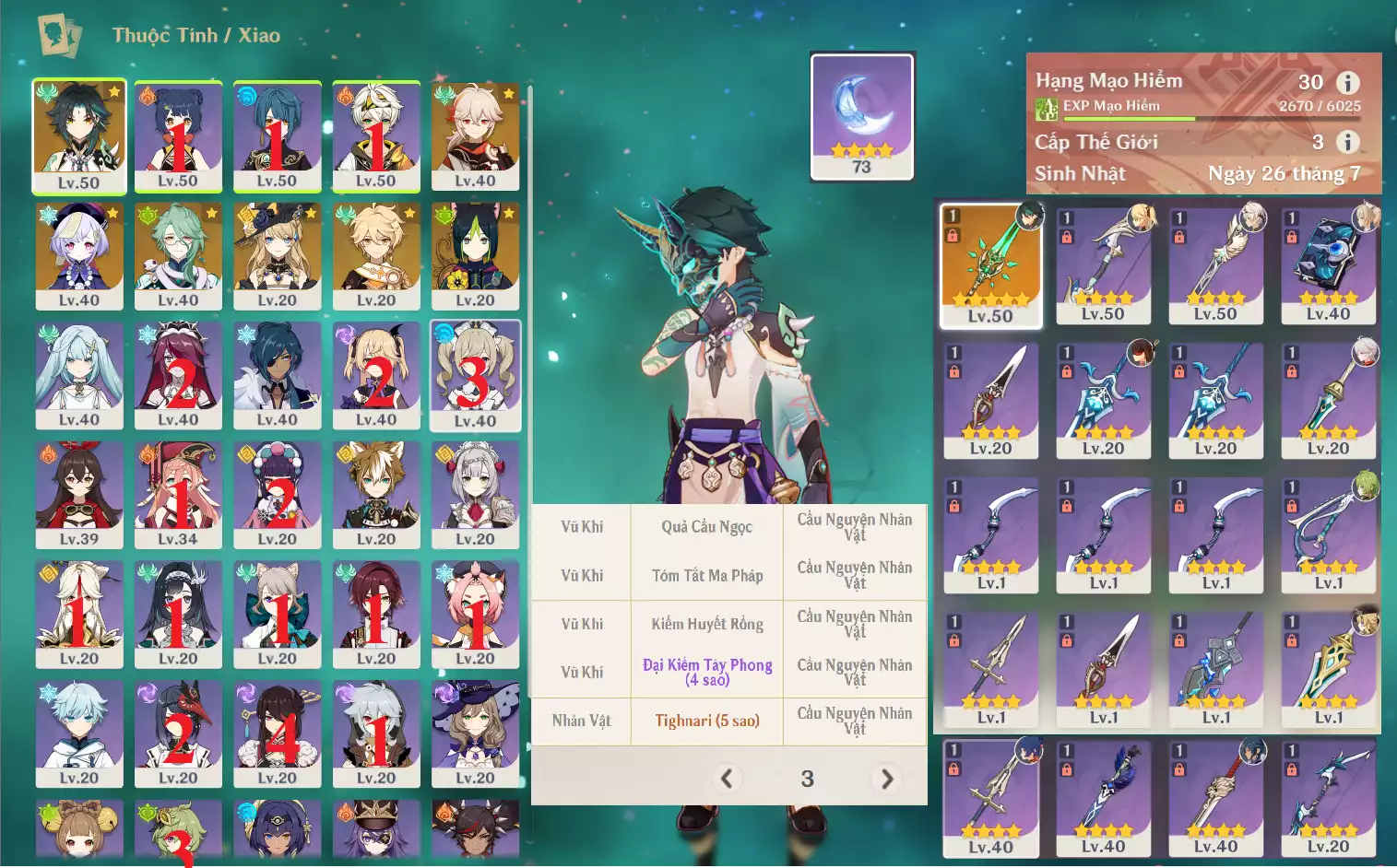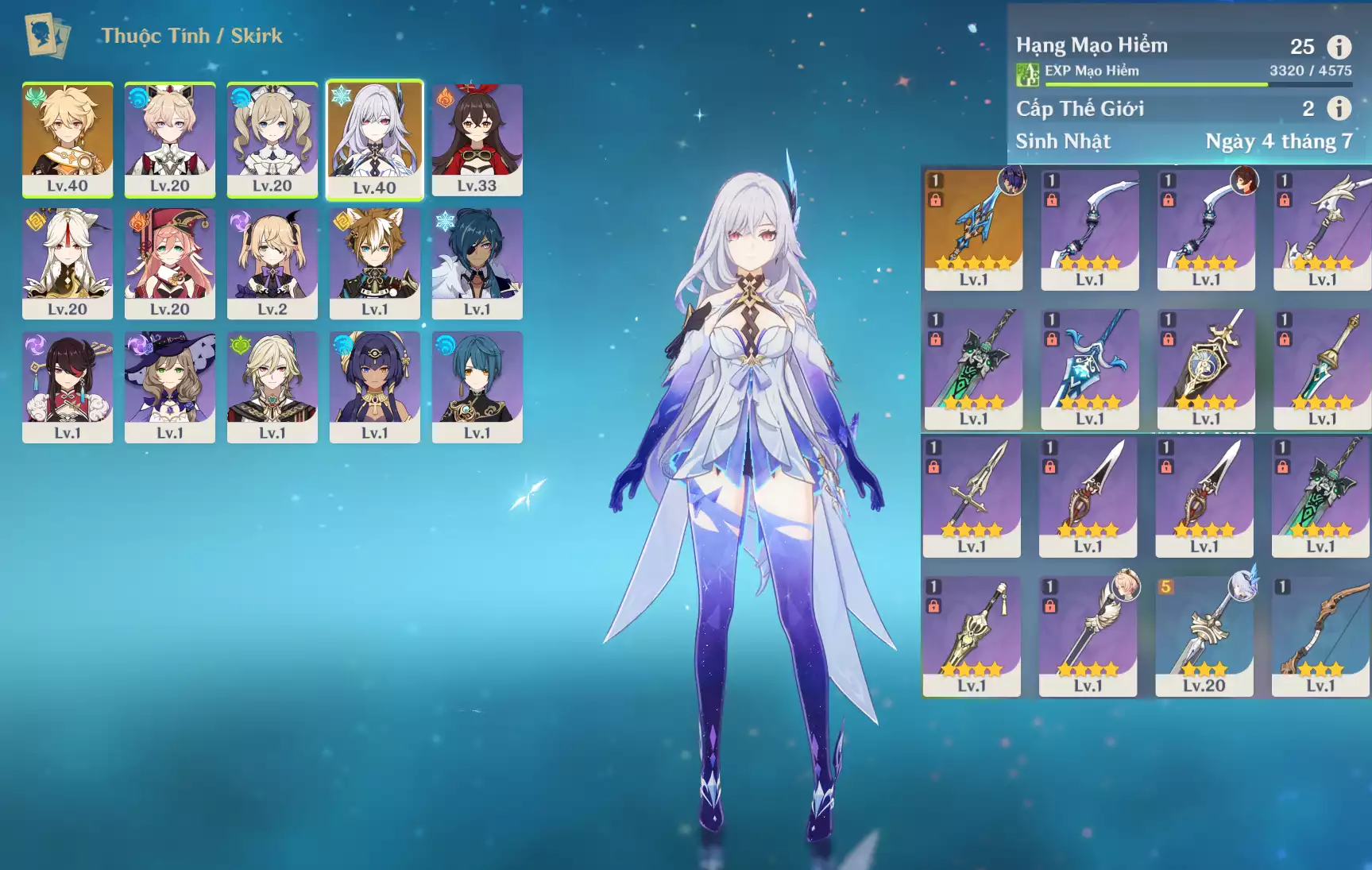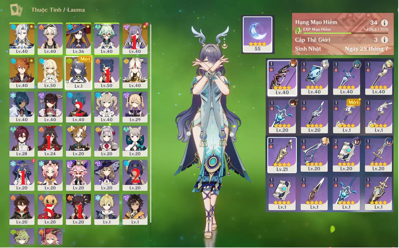 VIP Ar37: Char mới hot Lauma vk5* + Hutao Trấn hộ ma + Scaramouche (kẻ lang thang) DTTP* + Raiden shogun Baal + Tighnari Amos* qiqi , banner nhân vật 8 trang , chưa set mail