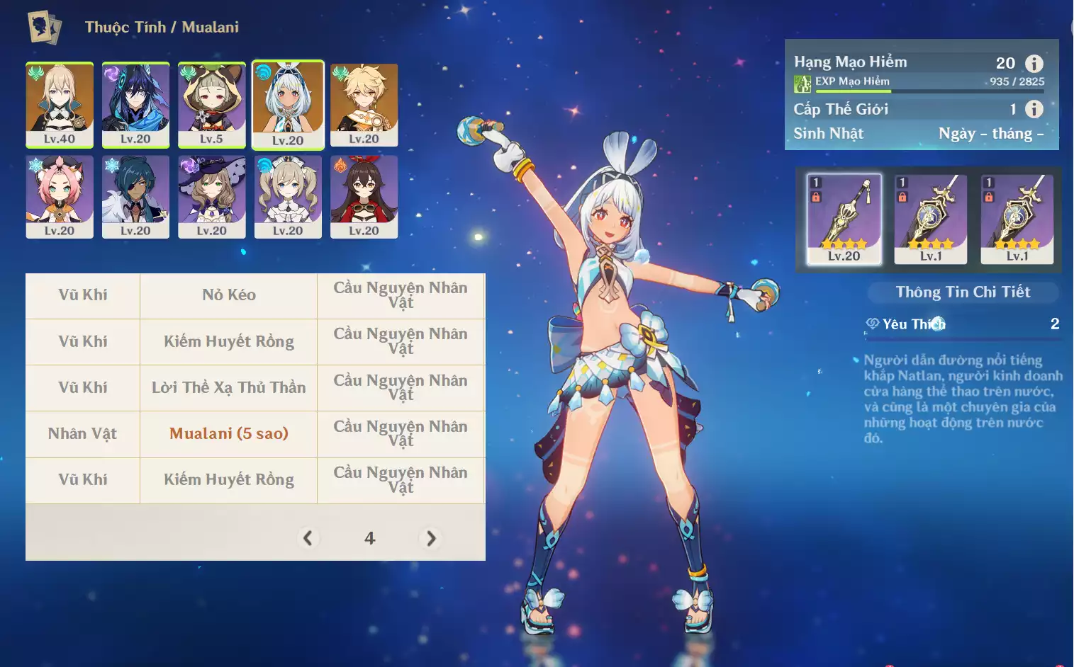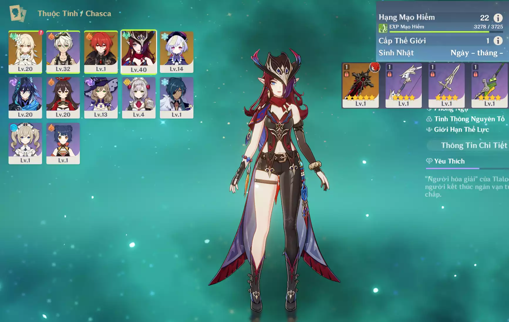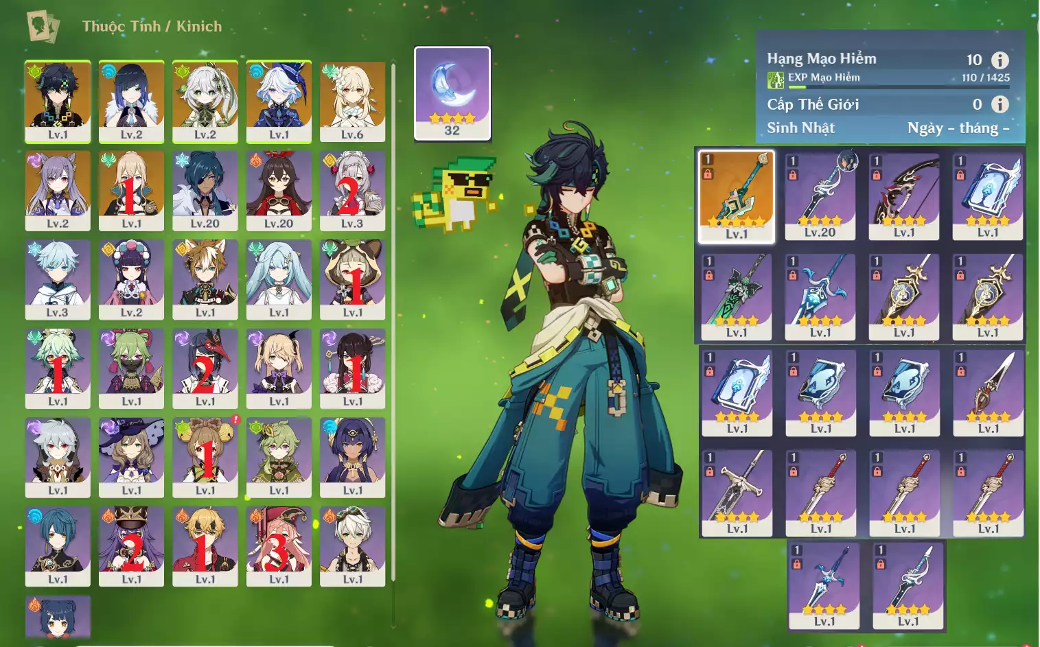 Siêu phẩm Ar10: Kinich trấn NSV* + Nahida + Furina + Yelan + Keqing JeanCM1 bennet , banner nhân vật 2 trang vũ khí 2 trang , chưa set mail _ chưa set sinh nhật