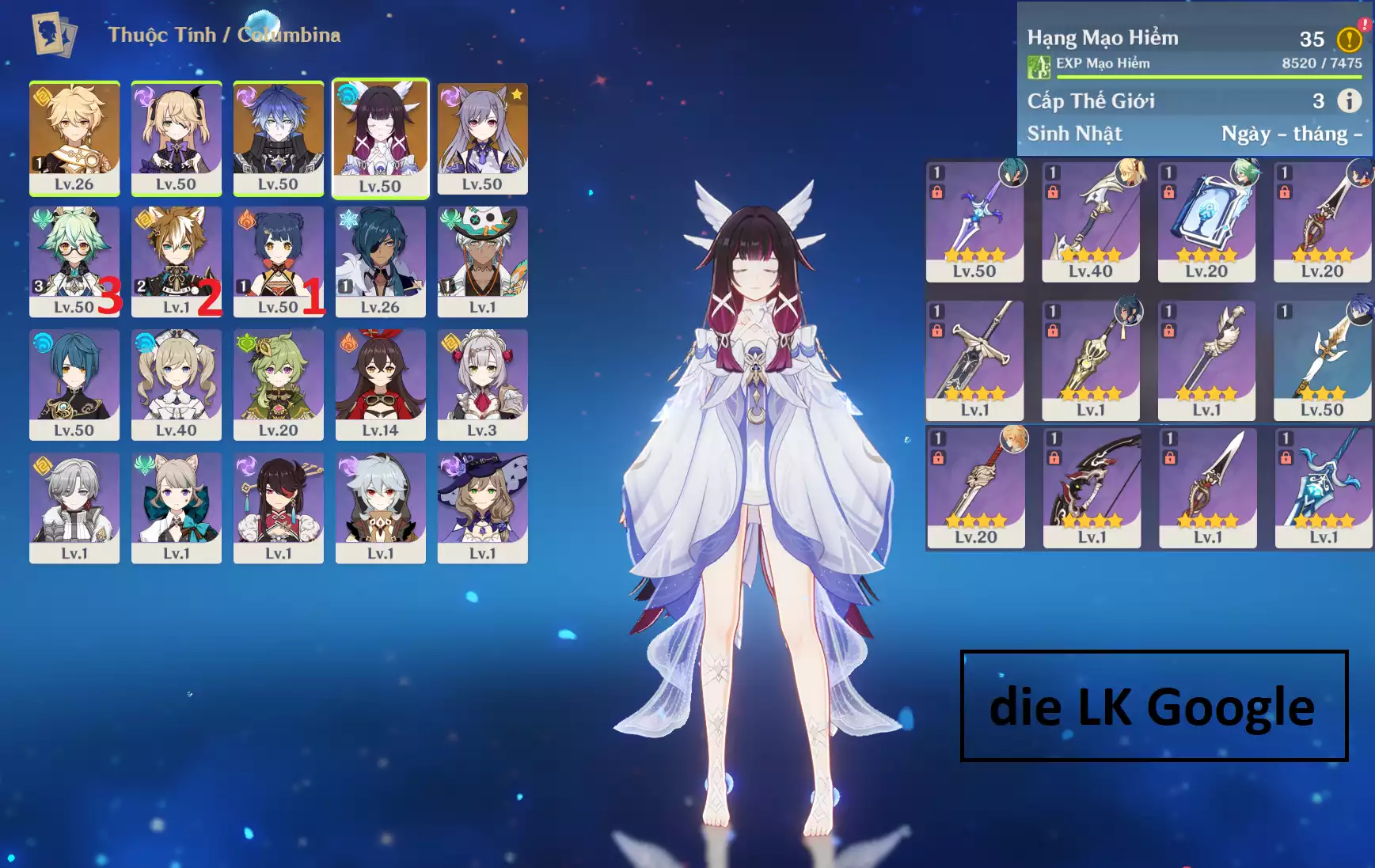 #360315 500,000đ 500,000đ AR level 35 Khu Vực asia Tướng 5* 3 Ar35 : Columbina + Flins + Keqing _ banner nhân vật 1 trang ( chưa set user + sinh nhật ) - die LK google nhưng ko ảnh hưởng đến bảo mật. Tướng : 3 Vũ khí : 0 Chi tiết