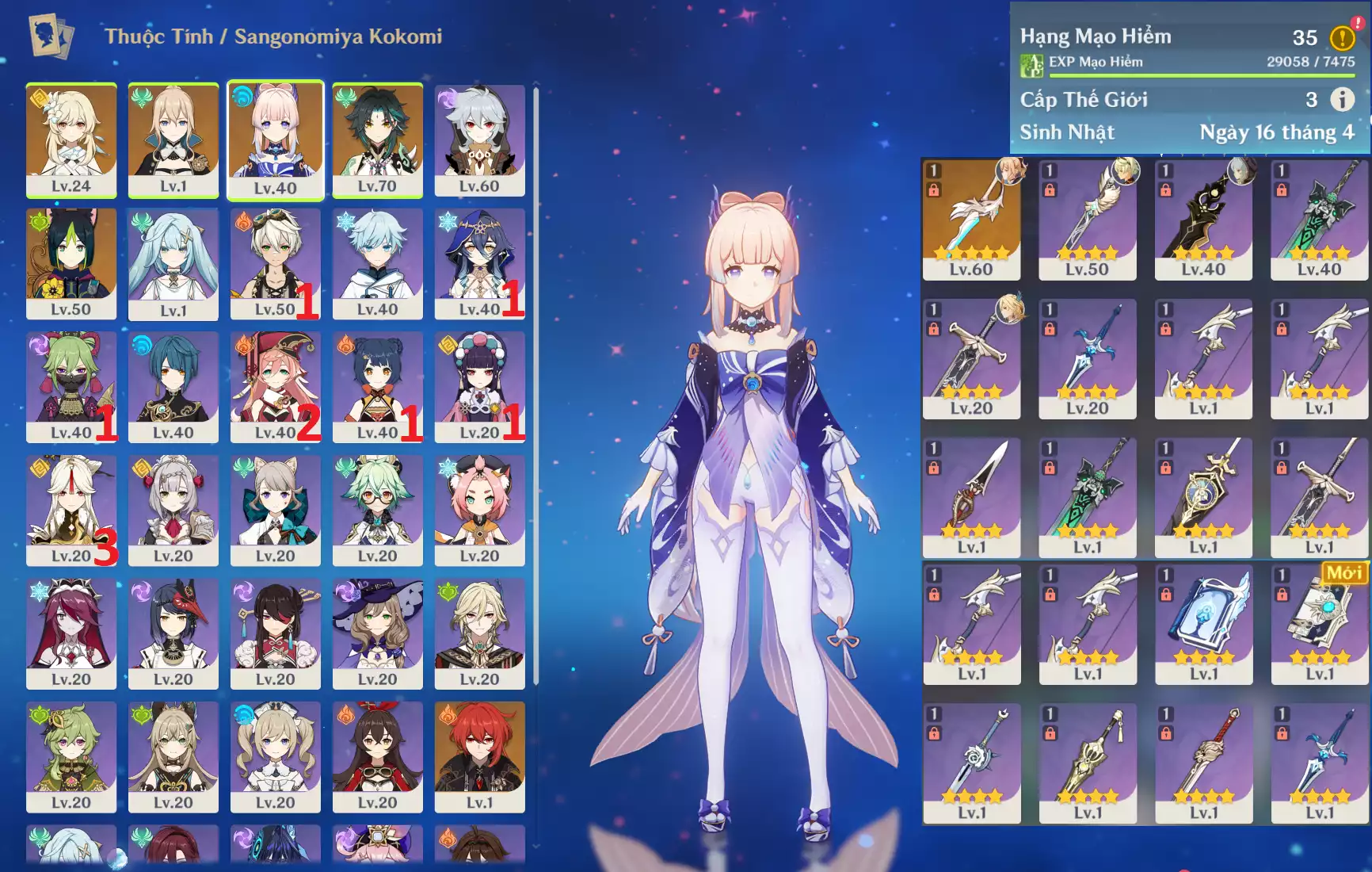 #356579 399,000đ 399,000đ AR level 35 Khu Vực asia Tướng 5* 7 Ar35 : Xiao + Kokomi + Jean + PƯK + Tighnari _ bennetC1 xingqiu faruzan _ banner nhân vật 50/90 _ map zin 90% Tướng : 7 Vũ khí : 1 Chi tiết