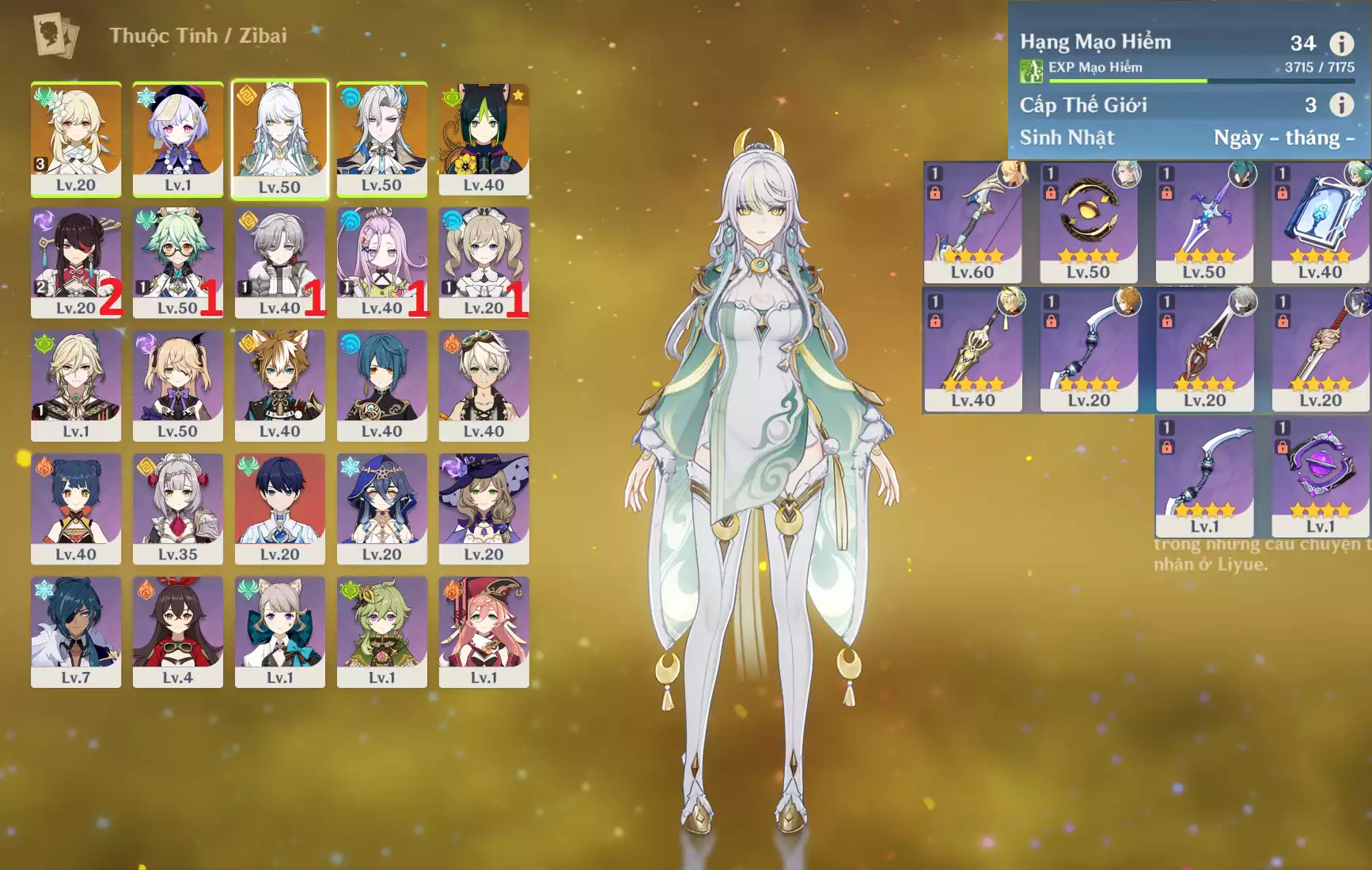 #360316 600,000đ 600,000đ AR level 34 Khu Vực asia Tướng 5* 4 Ar34 : Zibai + Neuvilette + QiQi + Tighnari _ nhân vật 4 trang ( chưa set user + sinh nhật ) _ map zin 99% Tướng : 4 Vũ khí : 0 Chi tiết