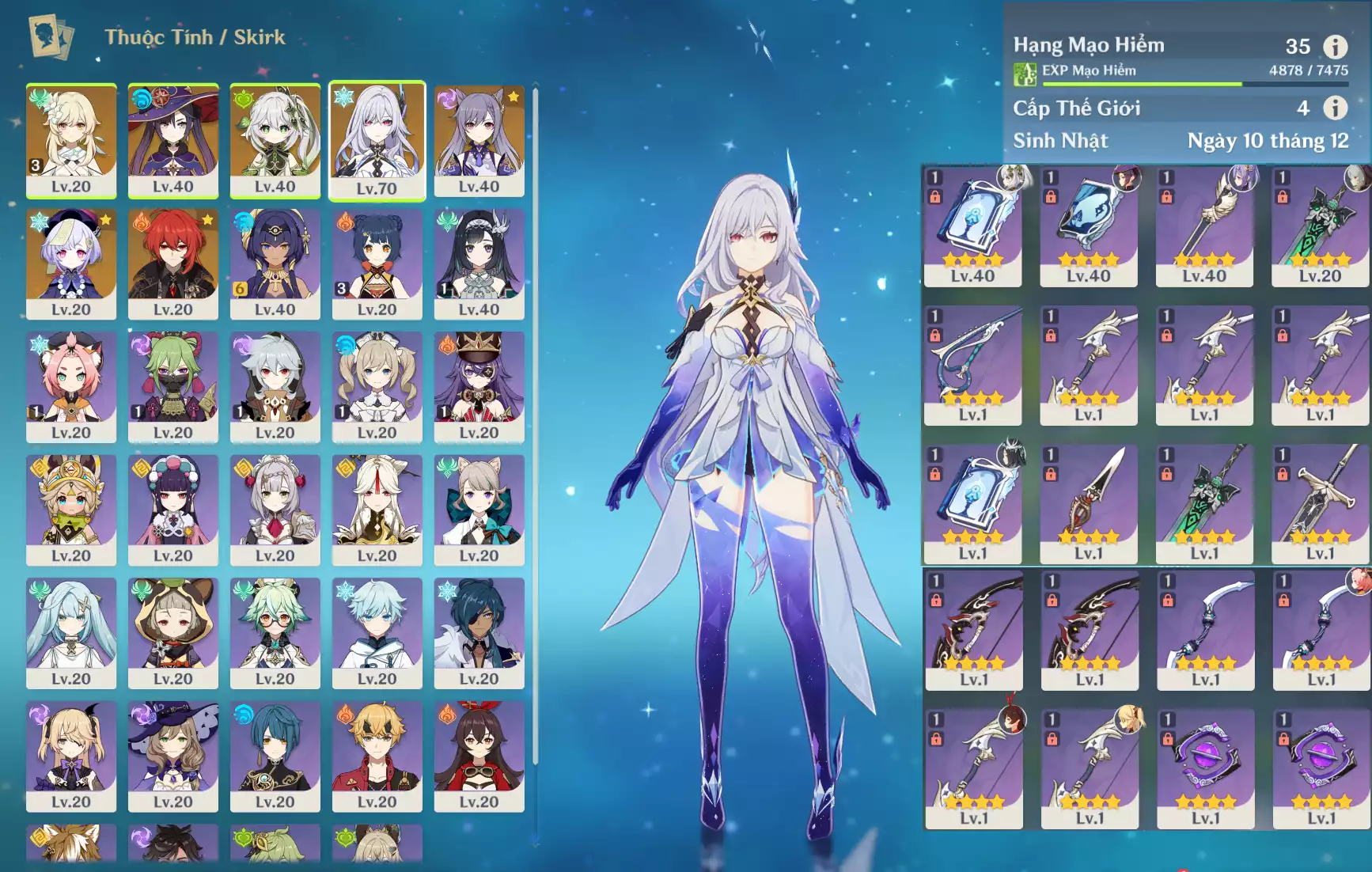 #360323 699,000đ 699,000đ AR level 35 Khu Vực asia Tướng 5* 4 Ar35 : Skirk + Neuvilltte + Kazuhu + Tighnari + Amos_ banner nhân vật 15/90 lần _ map zin hơn 90% Tướng : 4 Vũ khí : 1 Chi tiết