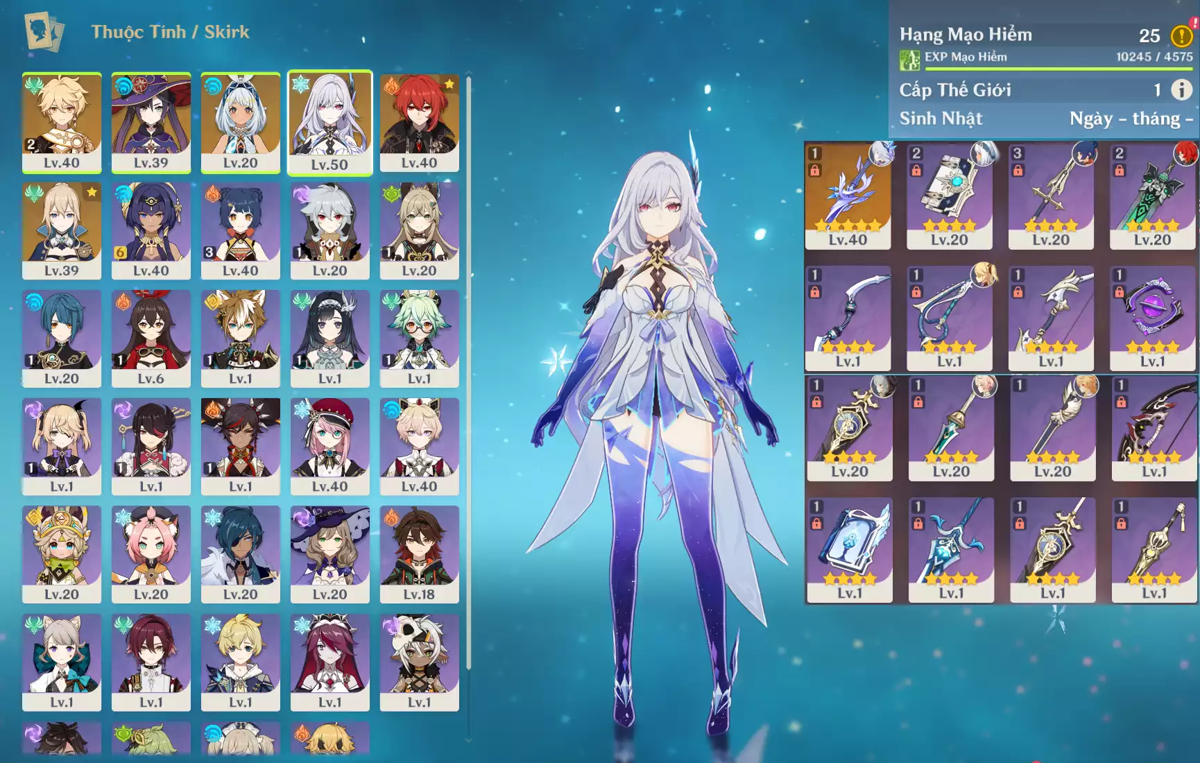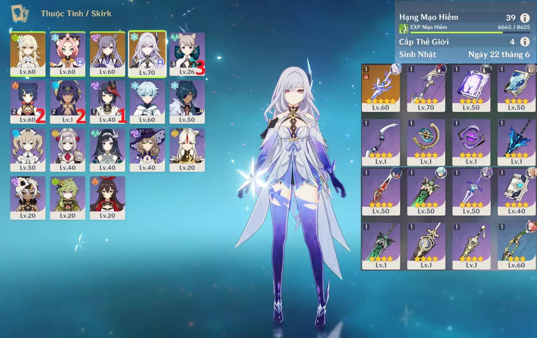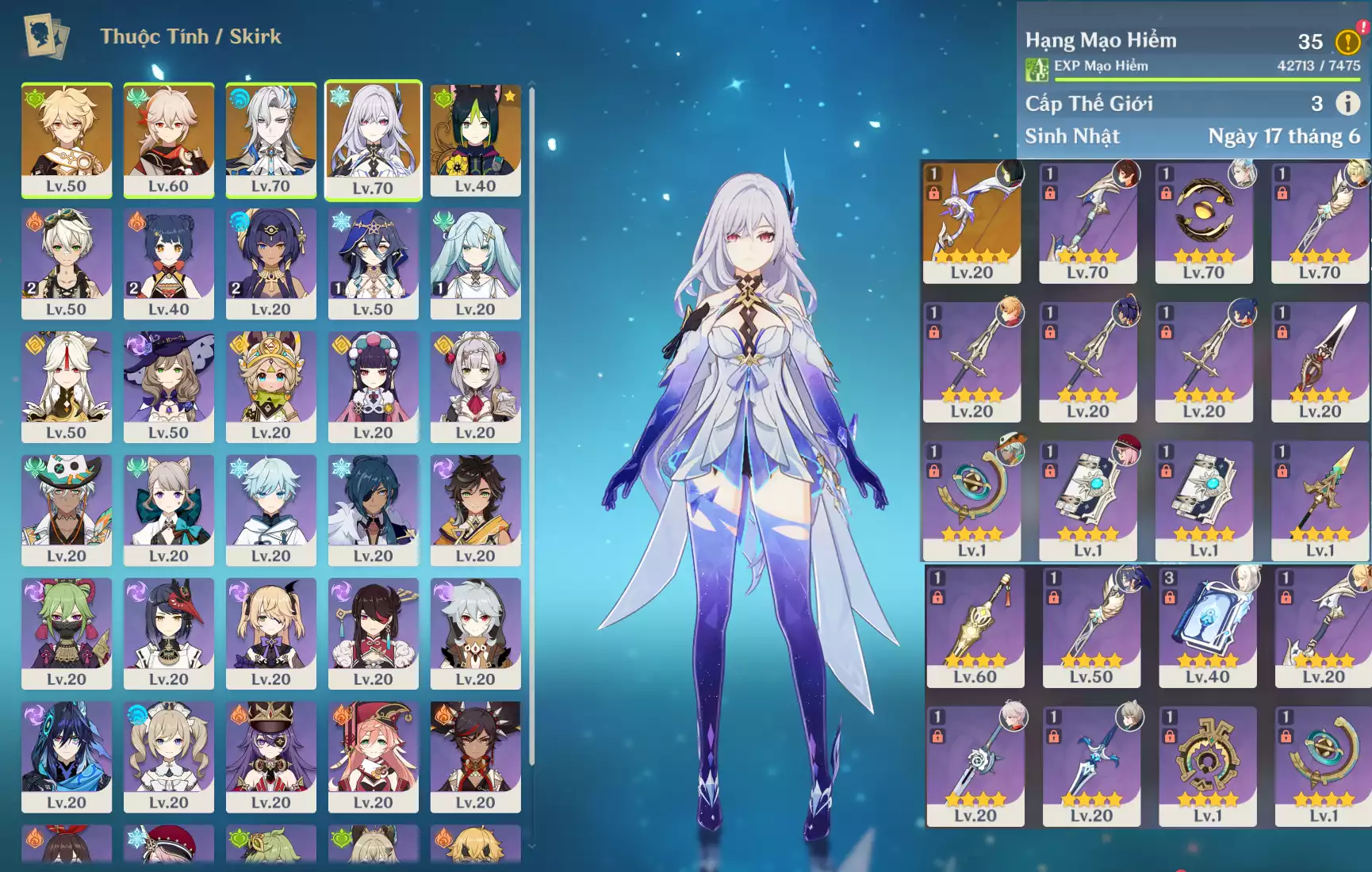 #360322 550,000đ 550,000đ AR level 35 Khu Vực asia Tướng 5* 6 Ar35 : Skirk + Nahida + Mona + Keqing + Diluc + QiQi _ banner nhân vật 20/90 _ map zin 95% Tướng : 6 Vũ khí : 0 Chi tiết