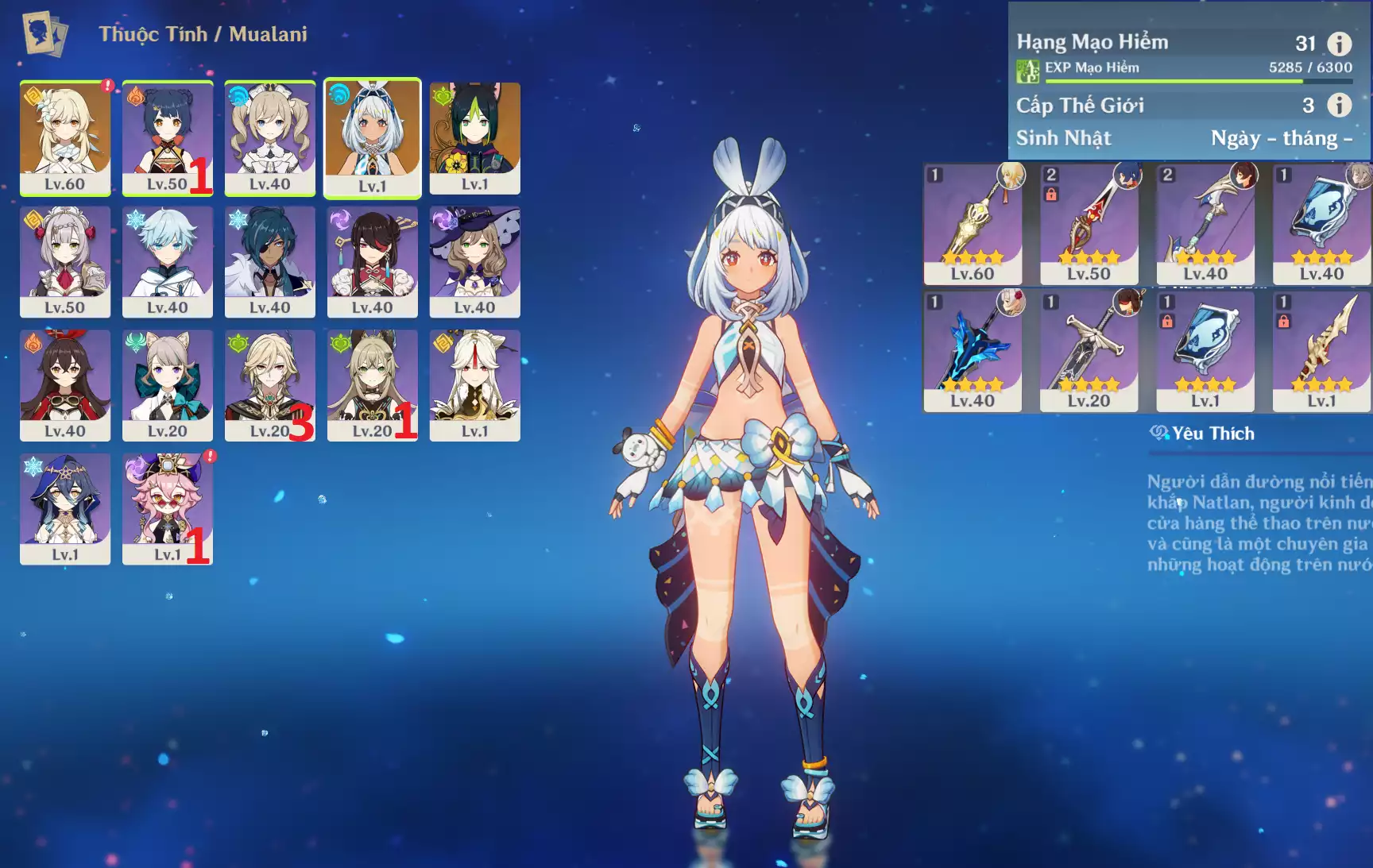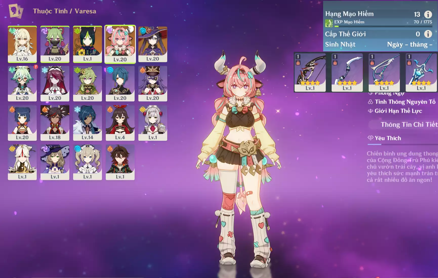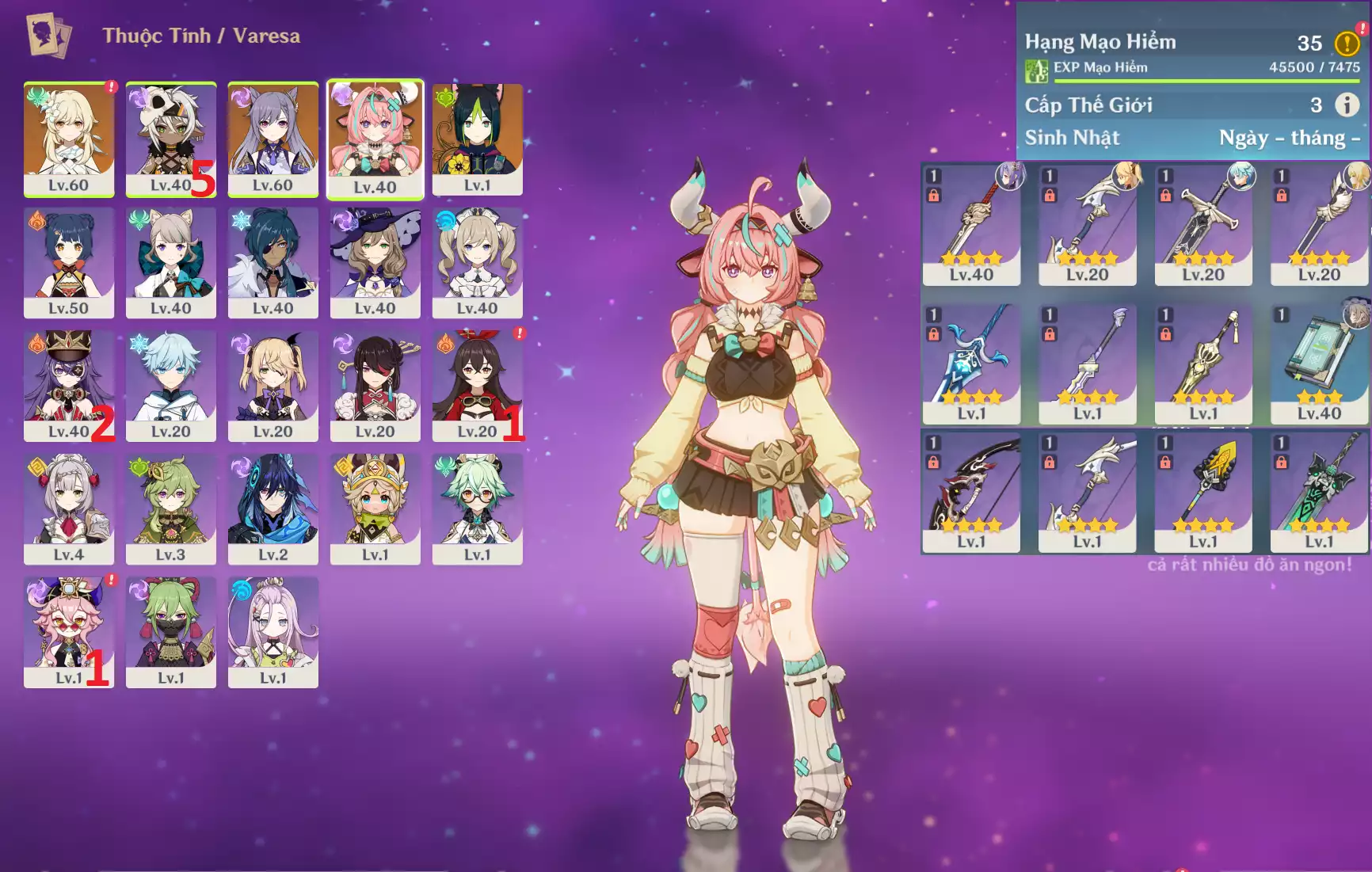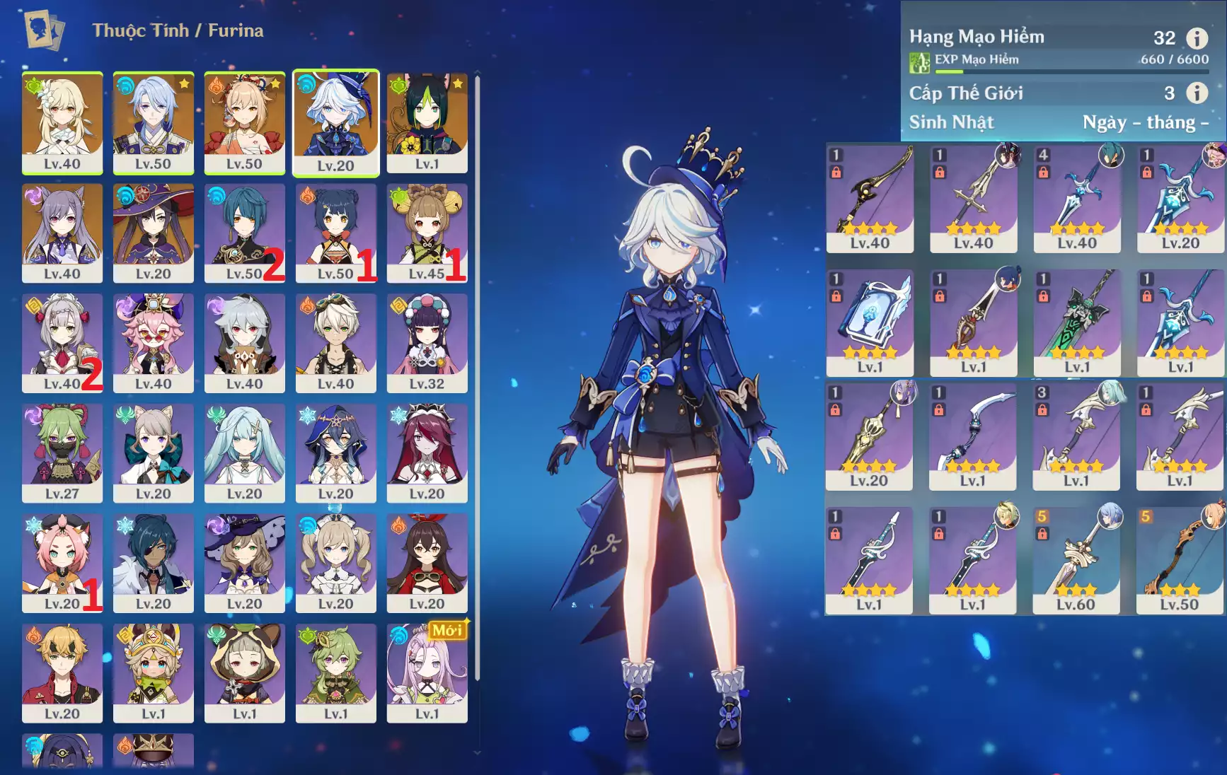#356590 499,000đ 499,000đ AR level 13 Khu Vực asia Tướng 5* 3 Ar13 : Varesa + Tighnari + Mona _ banner nhân vật 20/90 ( chưa set user + sinh nhật ) Tướng : 3 Vũ khí : 0 Chi tiết