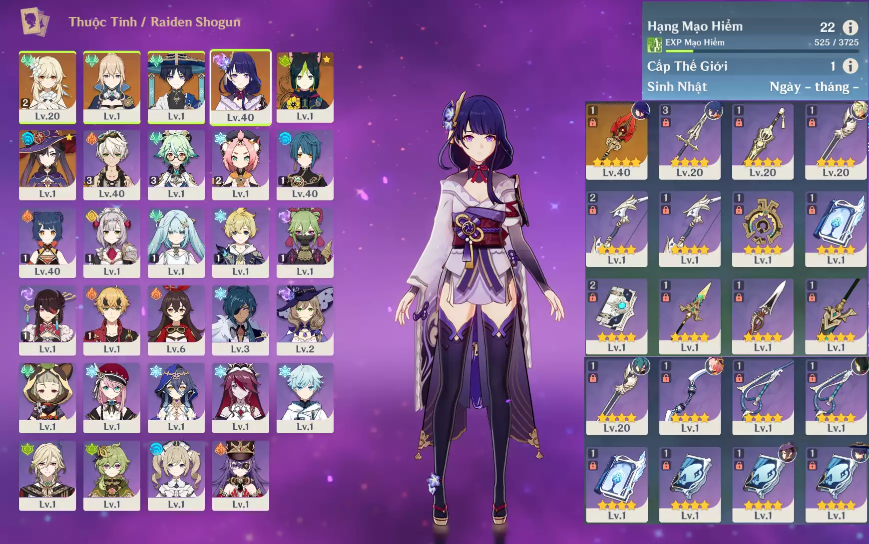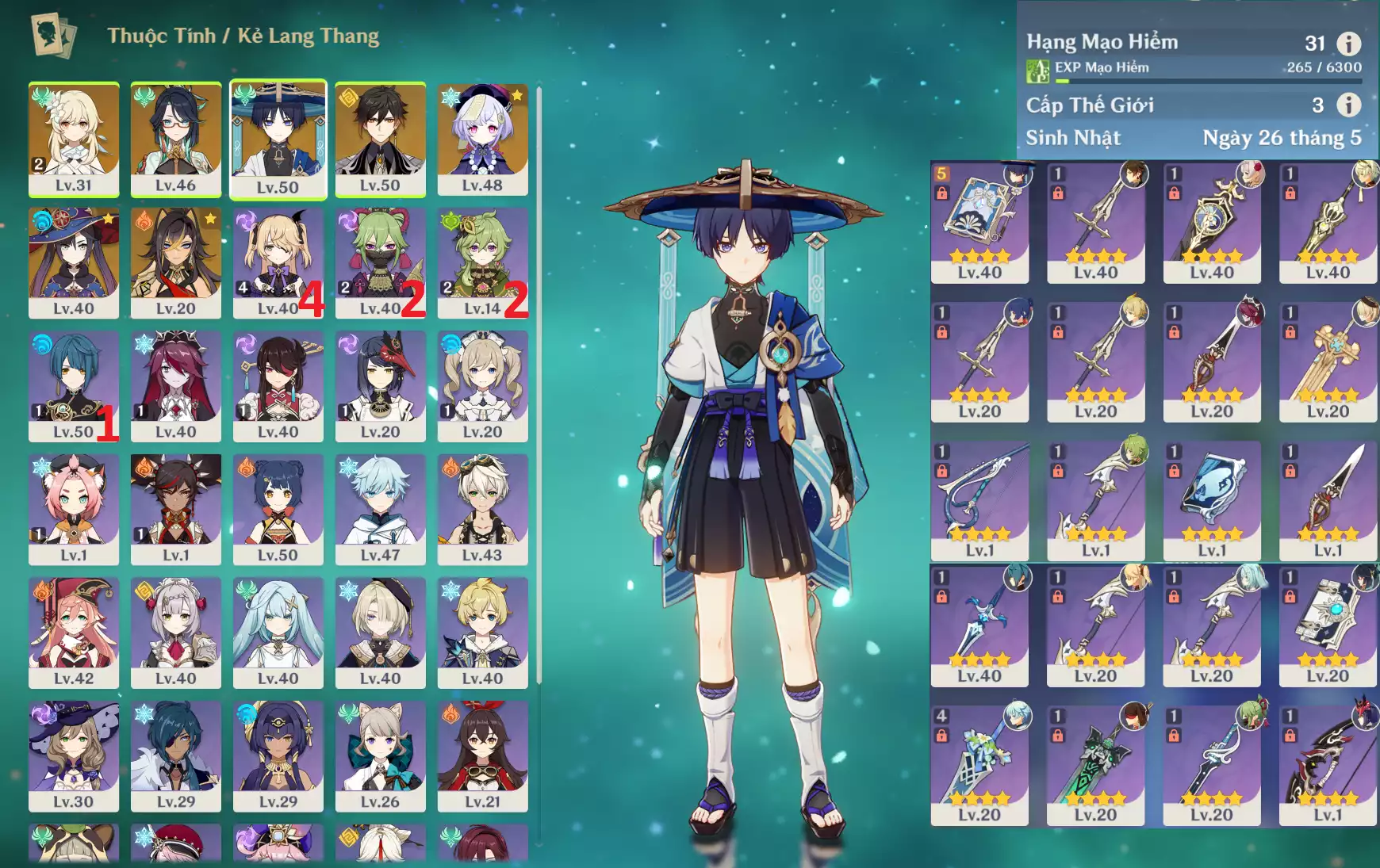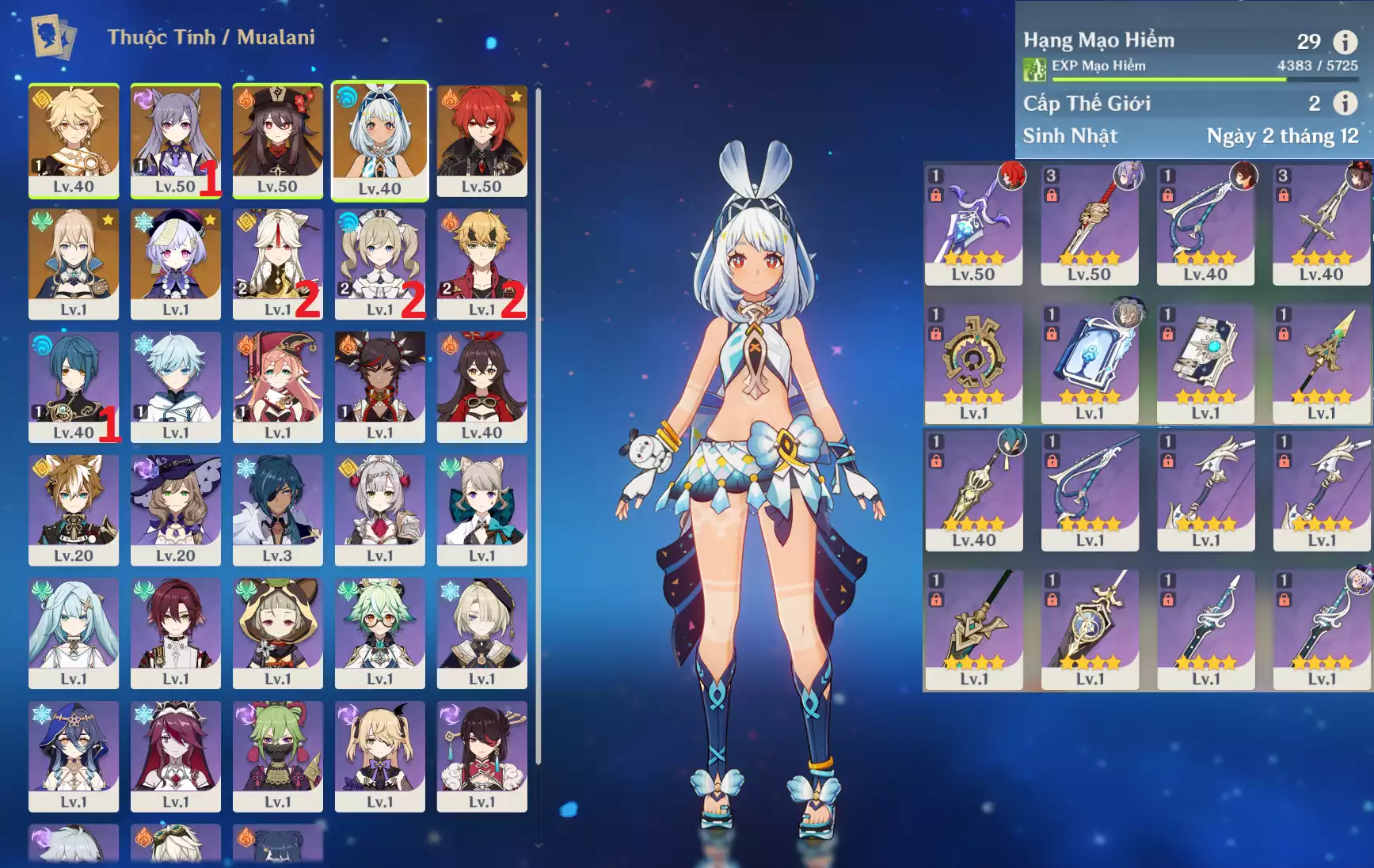 #360190 499,000đ 499,000đ AR level 29 Khu Vực asia Tướng 5* 6 Ar29 : Hutao + Mualali + KeqingC1 + Jean + QiQi + Diluc _ banner nhân vật 30/90 lần ( quên user ) _ map zin 99% Tướng : 6 Vũ khí : 0 Chi tiết