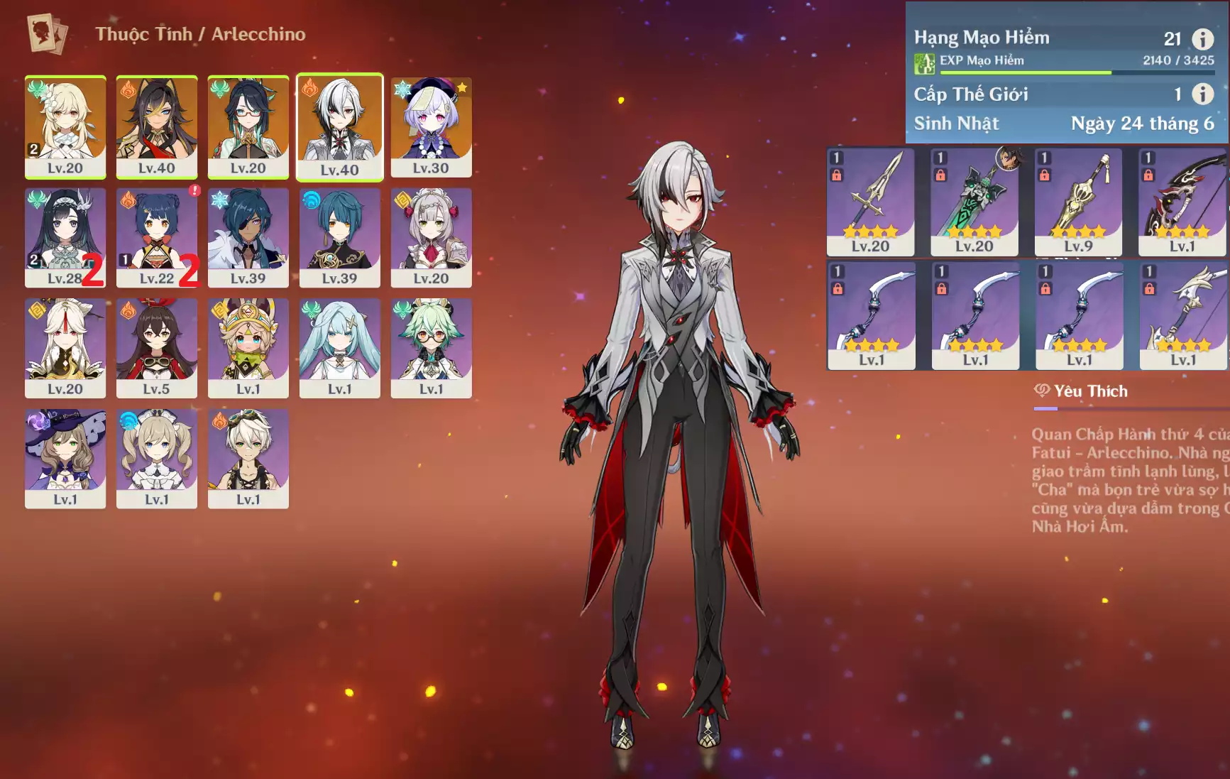 #360188 599,000đ 599,000đ AR level 21 Khu Vực asia Tướng 5* 4 Ar21 : Arlecchino + Xianyun + Dehya + QiQi _ banner nhân vật 10/90 ( chưa set user ) _ map zin 99% Tướng : 4 Vũ khí : 0 Chi tiết