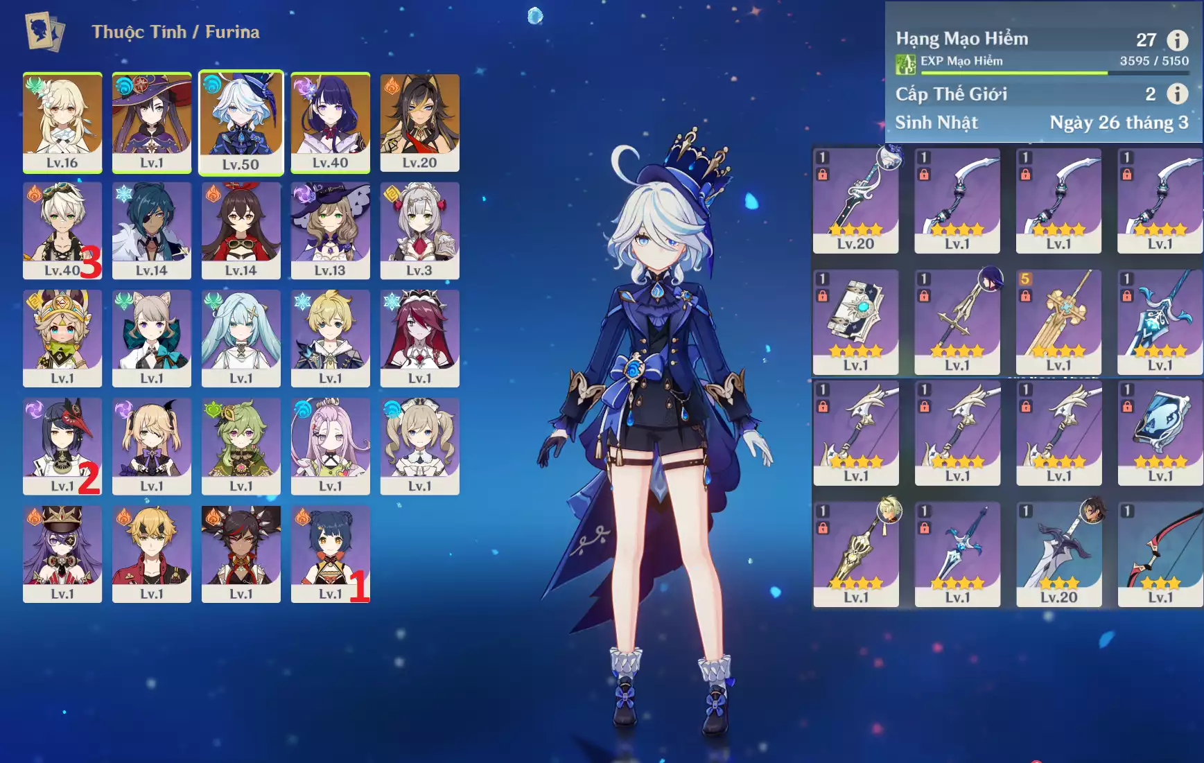#359130 2,499,000đ 2,499,000đ AR level 10 Khu Vực asia Tướng 5* 9 VIP Ar10: NEW Columbina - Furina TRẤN SNLL - Kazuha - Mualani - Mizuki - Qiqi - Tighnari - Xingqiu - Bennet vv. Acc trắng thông tin cực VIP, banner nv 25/90 Tướng : 9 Vũ khí : 1 Chi tiết