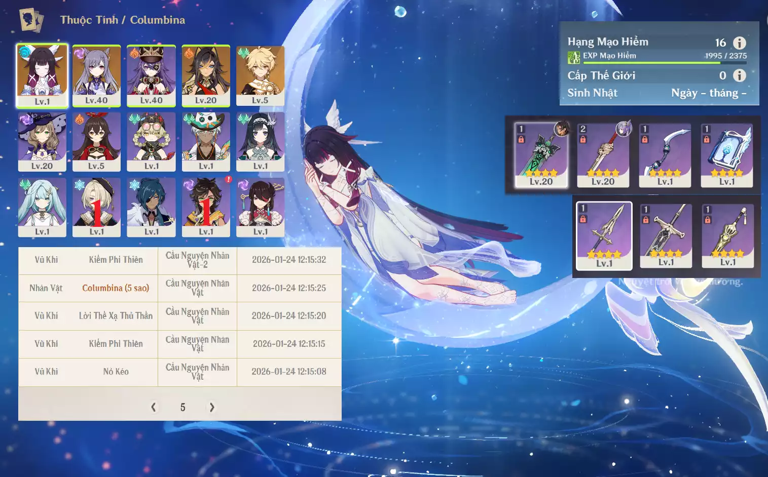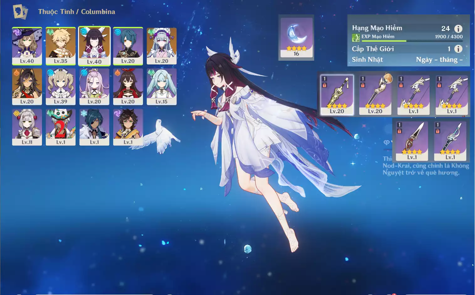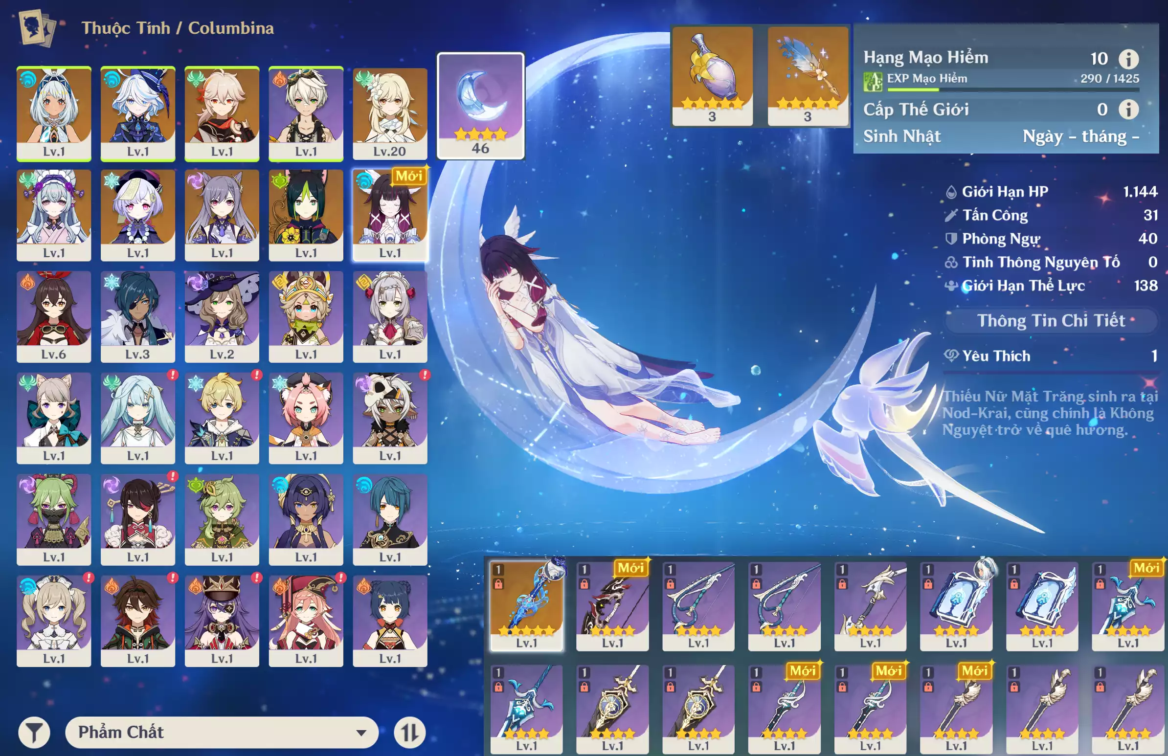 #359132 569,000đ 569,000đ AR level 16 Khu Vực asia Tướng 5* 3 Ar16: Nguyệt thần Columbina + Dehya Keqing main NAM , banner nhân vật 5 trang vũ khí 4 trang , chưa set user _ chưa set sinh nhật Tướng : 3 Vũ khí : 0 Chi tiết