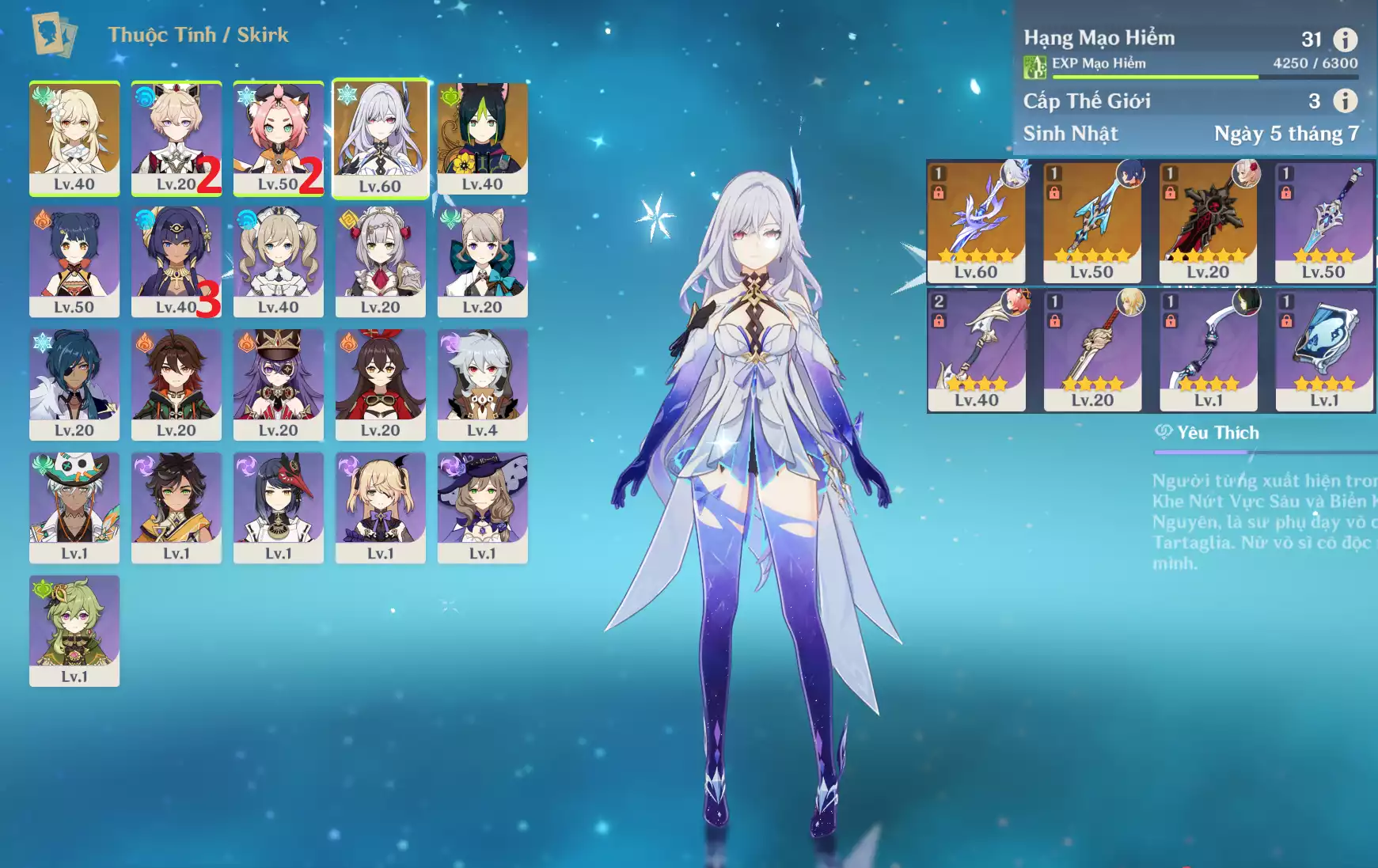 #359099 950,000đ 950,000đ AR level 31 Khu Vực asia Tướng 5* 2 Ar31 : Skirk + Trấn ( Thương Diệu ) + Tighnari + ĐCCS + HD _ banner nhân vật 30/90 ( quên user ) Tướng : 2 Vũ khí : 3 Chi tiết
