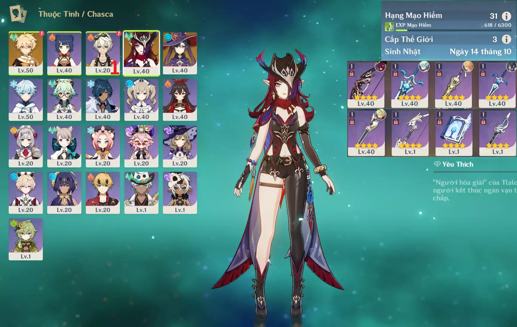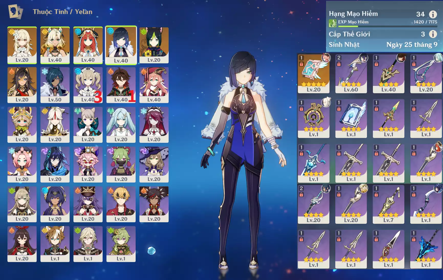 #355275 600,000đ 600,000đ AR level 34 Khu Vực asia Tướng 5* 5 Ar34 : Yelan + Nilou + Xilonen + Dehya + Tighnari + QTK _ bannner nhân vật 35/90 ( chưa set user ) _ map zin 99% Tướng : 5 Vũ khí : 1 Chi tiết