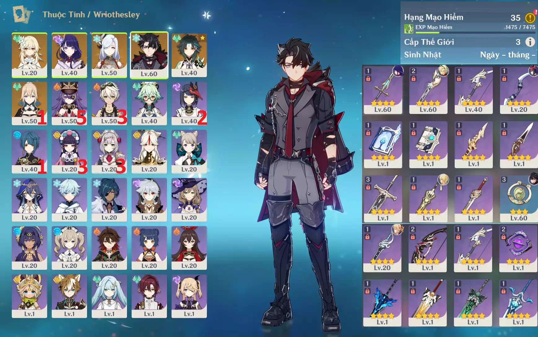 #355307 899,000đ 899,000đ AR level 35 Khu Vực asia Tướng 5* 5 Ar35 : Wriothesley + Shenhe + Raidenshogun-baal + Xiao + JeanC1 _ bennetC3 xingqiuC1 _ banner nhân vật 15/90 ( chưa set sinh nhật ) _ map zin 99% Tướng : 5 Vũ khí : 0 Chi tiết
