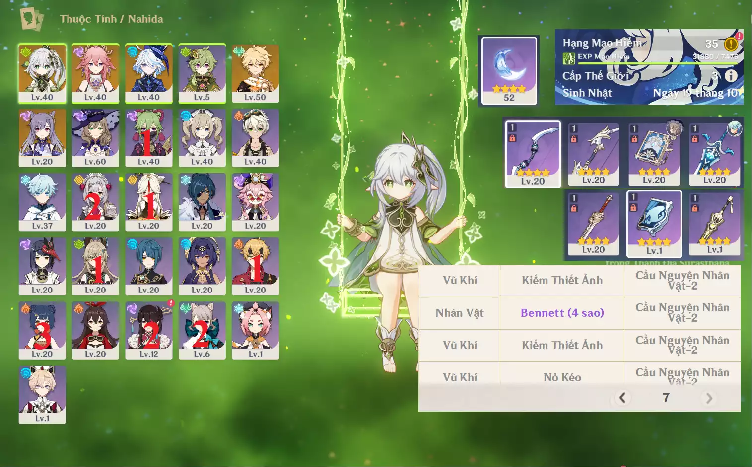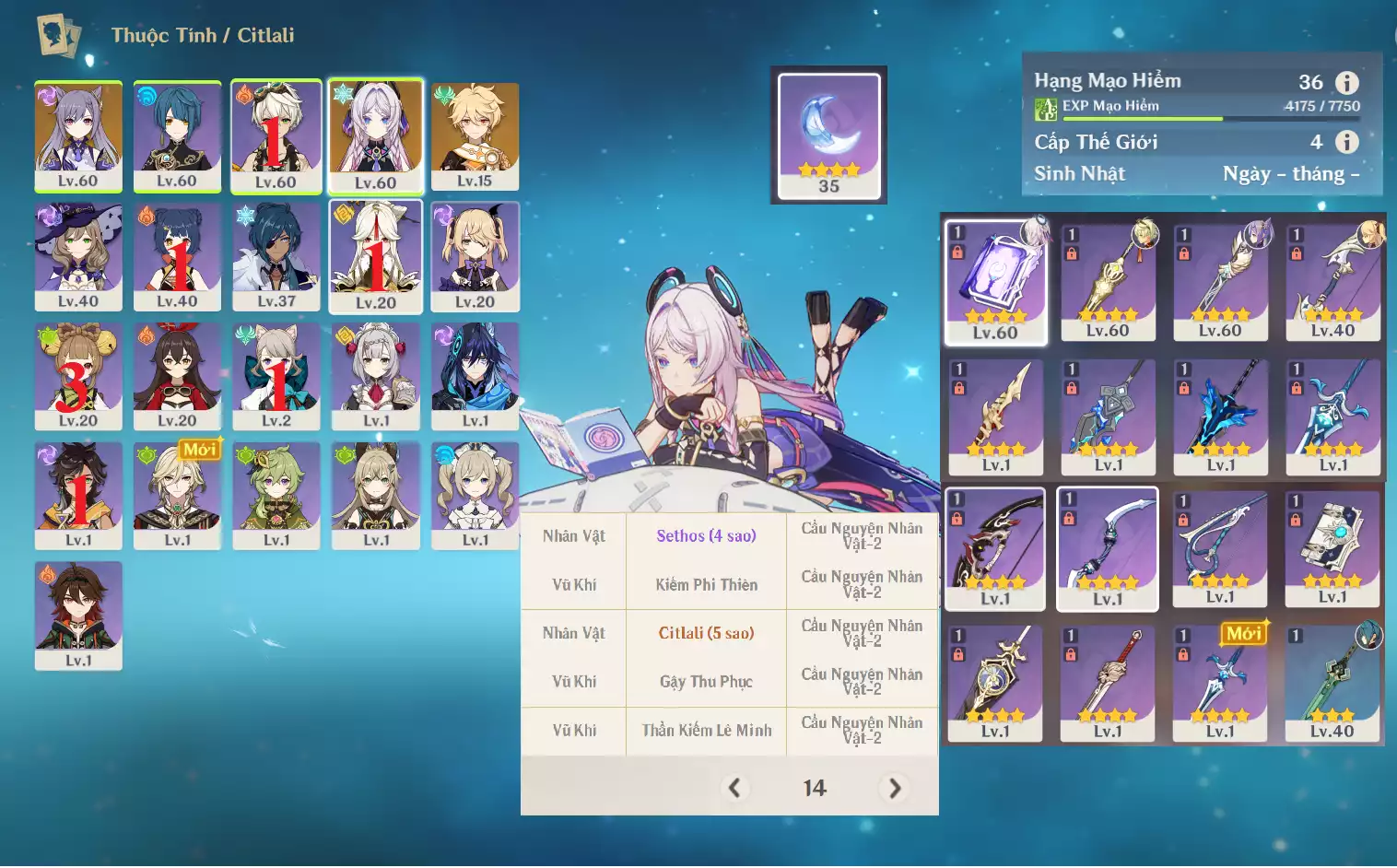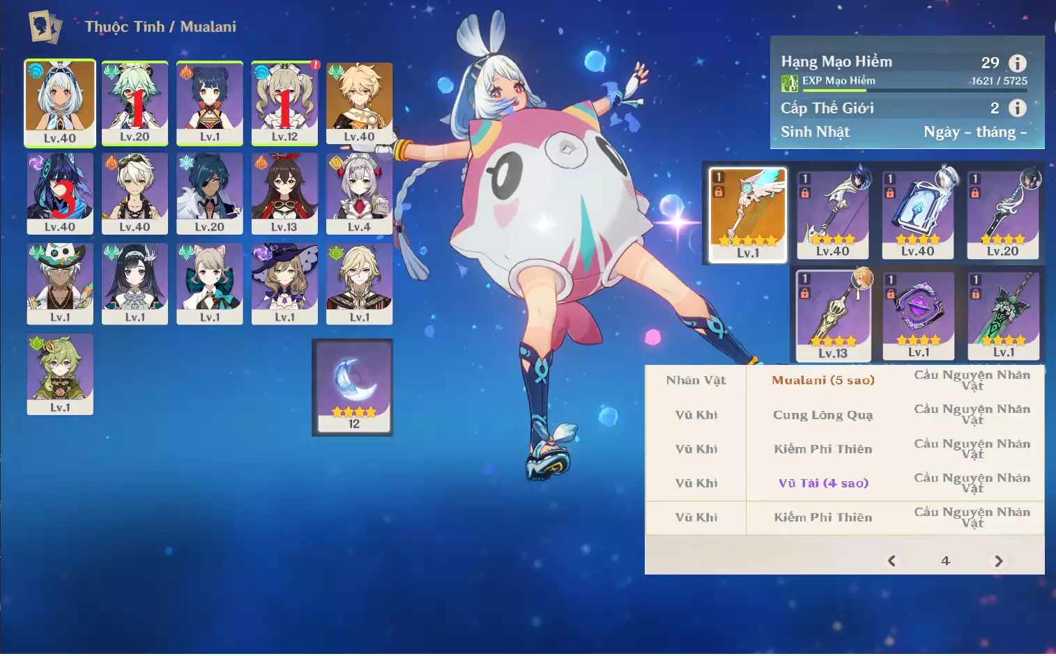 #355387 699,000đ 699,000đ AR level 35 Khu Vực asia Tướng 5* 5 Ar35: Furina + Nahida + Yae Miko + Keqing bennet main NAM , banner nhân vật 11 trang , chưa set user Tướng : 5 Vũ khí : 0 Chi tiết
