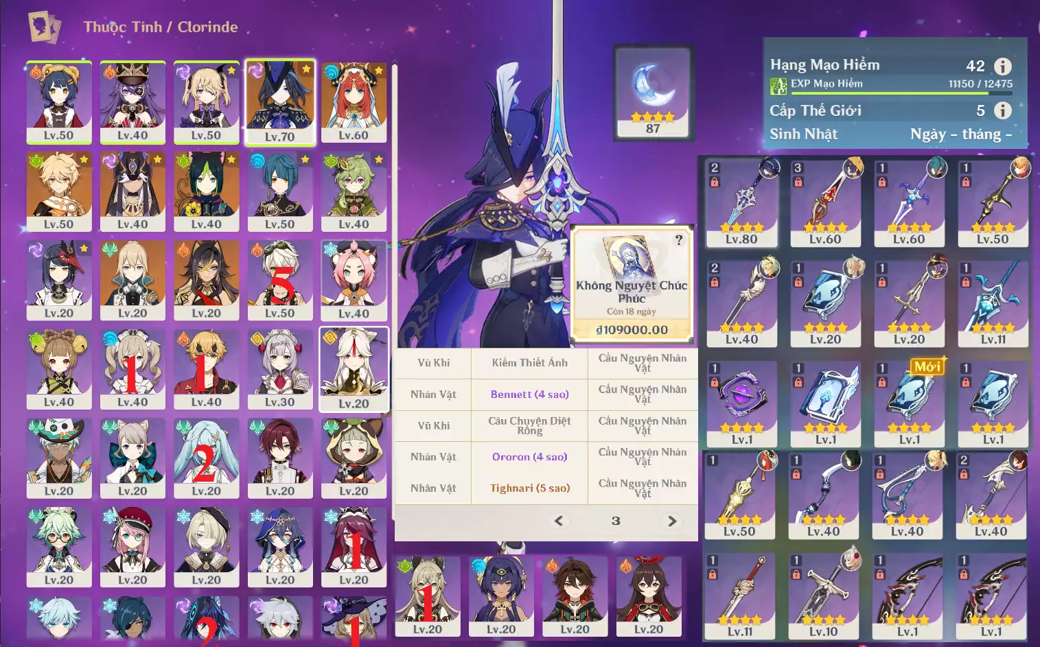 #355384 499,000đ 499,000đ AR level 42 Khu Vực asia Tướng 5* 7 Ar42: Clorinde + Yae Miko + Cyno + Tighnari jean Dehya bennetC5 main NAM , banner nhân vật ĐÃ LỆCH 10 trang , chưa set user _ chưa set sinh nhật Tướng : 7 Vũ khí : 0 Chi tiết