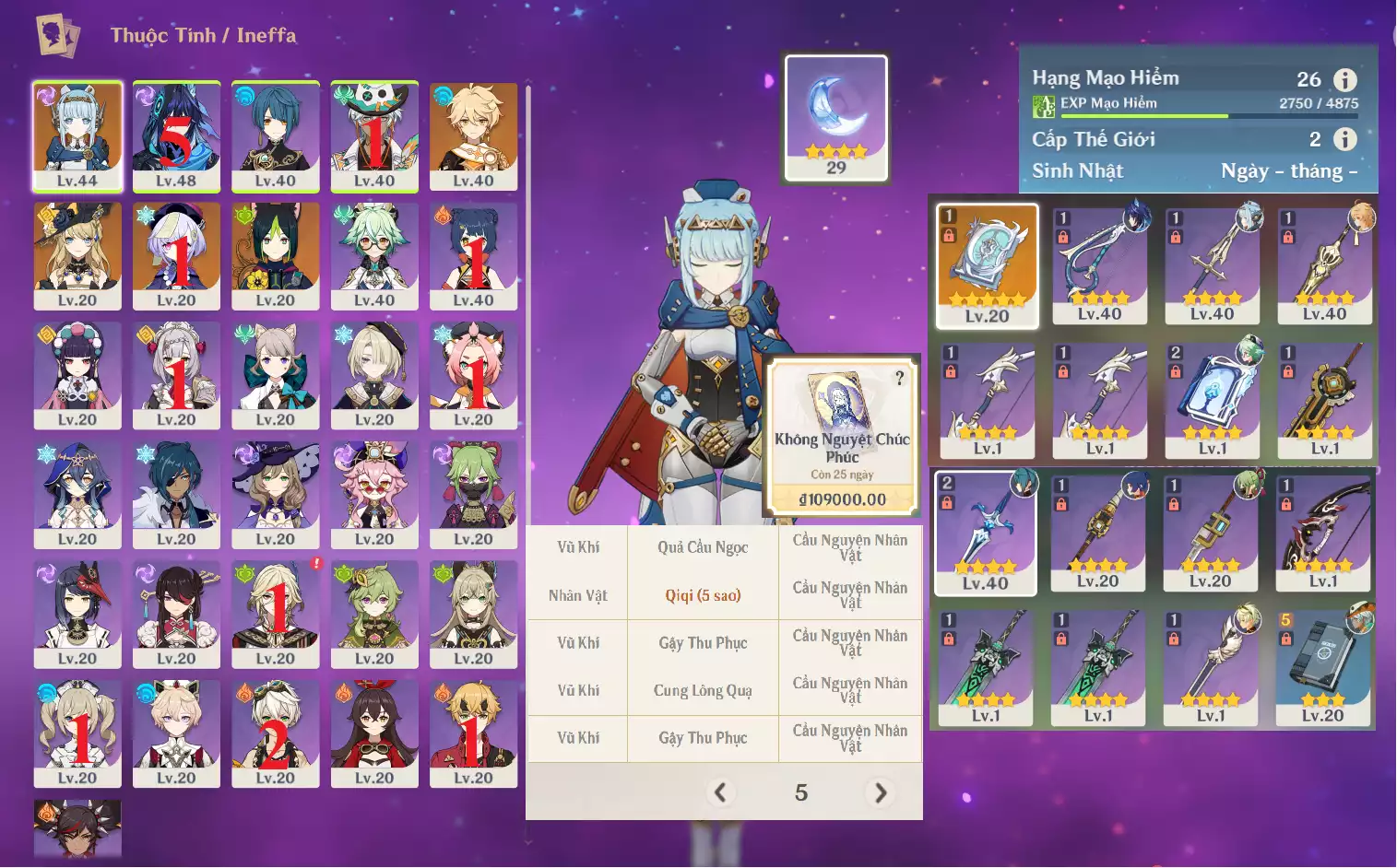 #355385 699,000đ 699,000đ AR level 26 Khu Vực asia Tướng 5* 4 Ar26: Char mới Ineffa + Navia + Tighnari Qiqi bennetC2 main NAM , banner nhân vật ĐÃ LỆCH 4 trang + thẻ tháng 25 ngày từ ngày 10/9/2025 , chưa set user _ chưa set sinh nhật Tướng : 4 Vũ khí : 1 Chi tiết