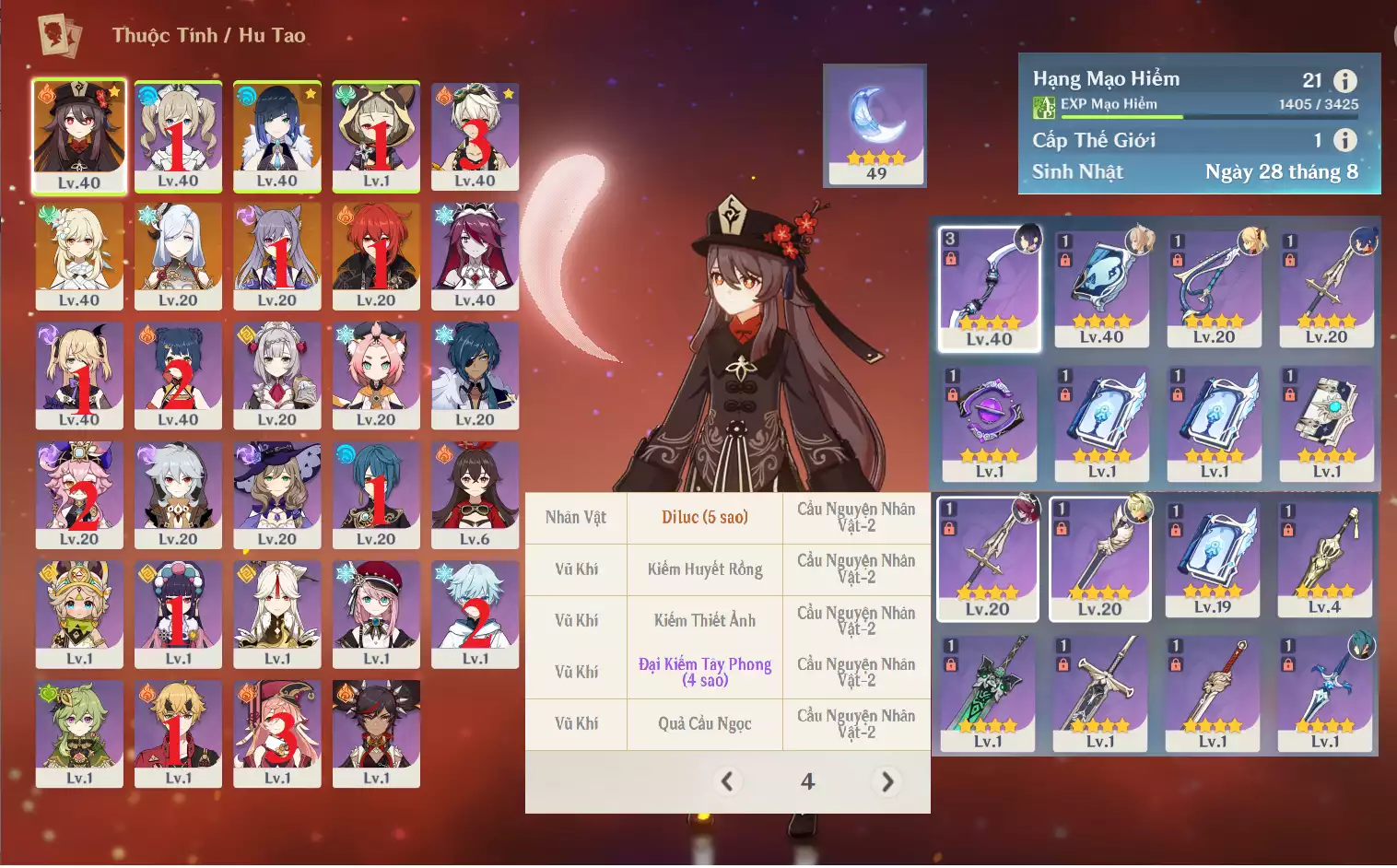 #355395 799,000đ 799,000đ AR level 21 Khu Vực asia Tướng 5* 6 Ar21: Hutao + Yelan + Shenhe + DilucCM1 KeqingCM1 bennetC3 , banner nhân vật ĐÃ LỆCH 9 trang , chưa set user , map còn zin Tướng : 6 Vũ khí : 0 Chi tiết