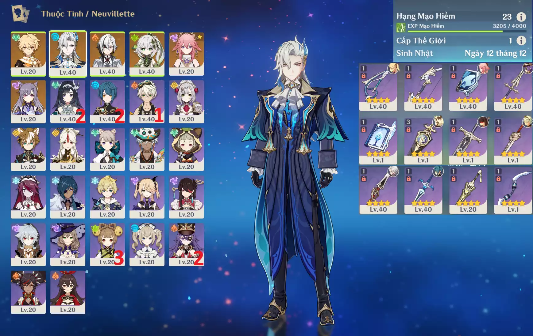 #355270 1,000,000đ 1,000,000đ AR level 33 Khu Vực asia Tướng 5* 8 Ar33 : Neuvillette + Chasa + Scaramouche + Eula + Navia + TKKN _ bennet xingqiu _ banner nhân vật 1 trang ( chưa set user + sinh nhật ) _ map zin 99% Tướng : 8 Vũ khí : 1 Chi tiết
