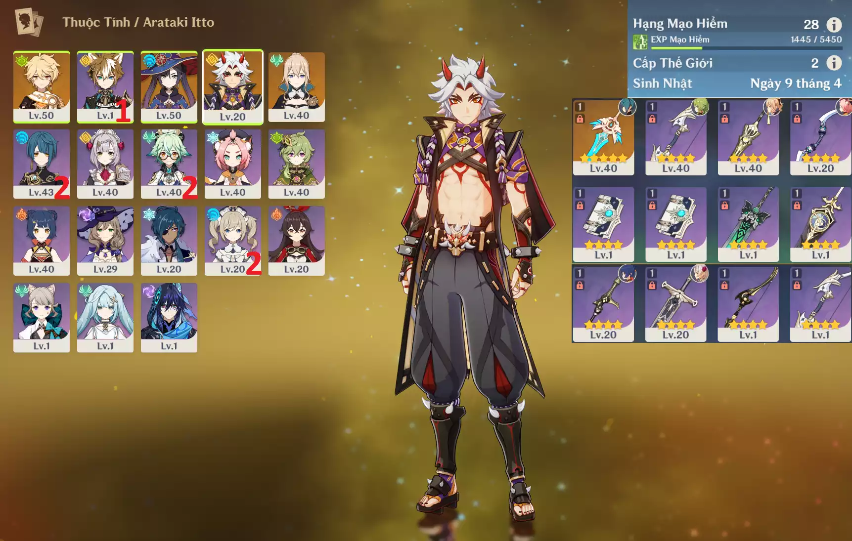 #355305 250,000đ 250,000đ AR level 28 Khu Vực asia Tướng 5* 3 Ar28 : Itto + Monac + Jean + TKK _ banner nhân vật 30/90 ( chưa set user ) _ map zin hơn 90% Tướng : 3 Vũ khí : 1 Chi tiết