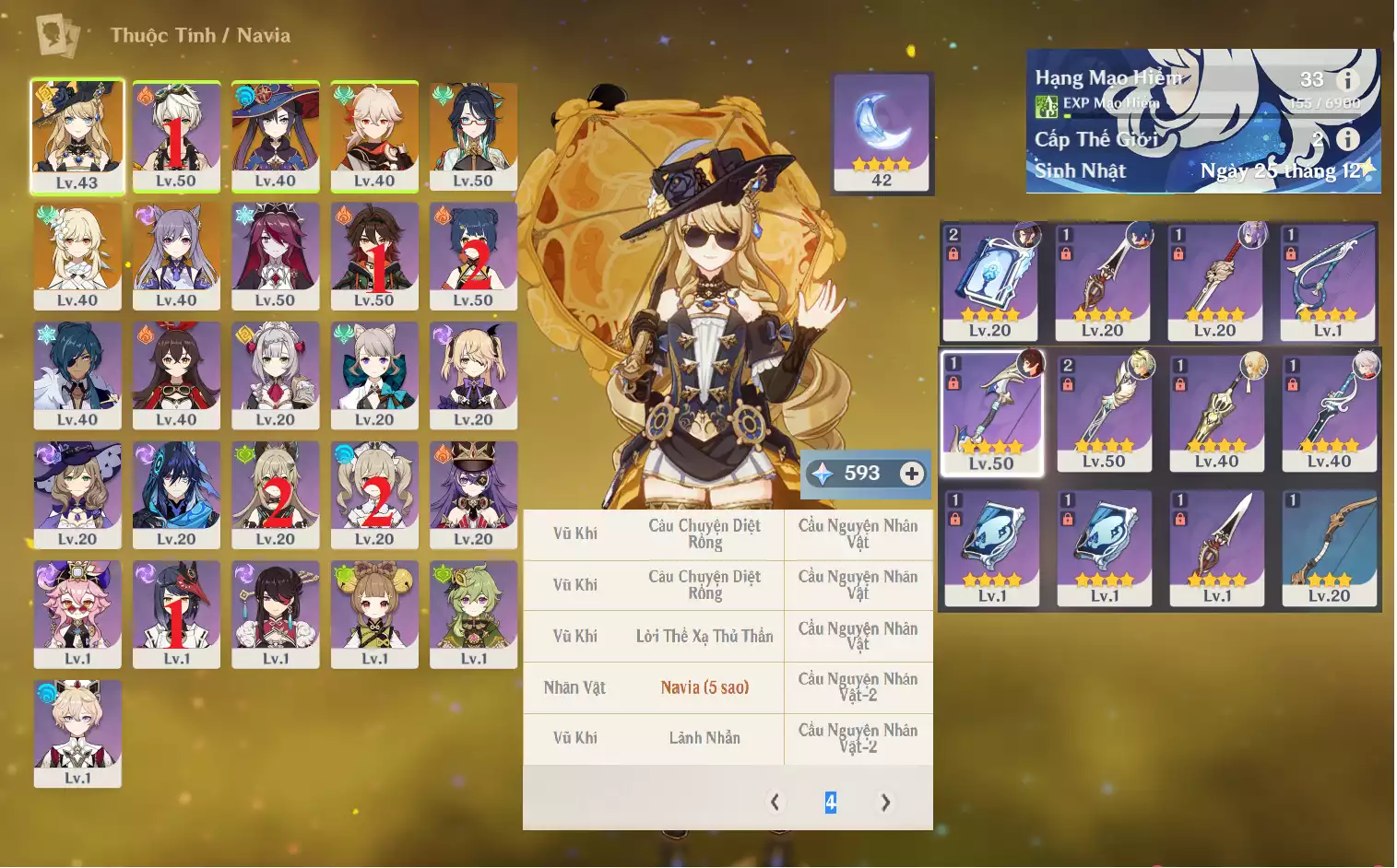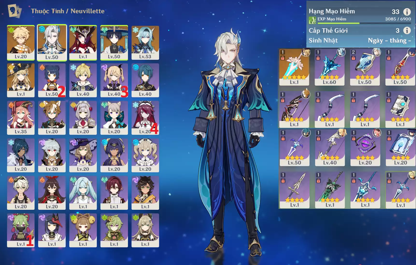 #355270 1,000,000đ 1,000,000đ AR level 33 Khu Vực asia Tướng 5* 8 Ar33 : Neuvillette + Chasa + Scaramouche + Eula + Navia + TKKN _ bennet xingqiu _ banner nhân vật 1 trang ( chưa set user + sinh nhật ) _ map zin 99% Tướng : 8 Vũ khí : 1 Chi tiết