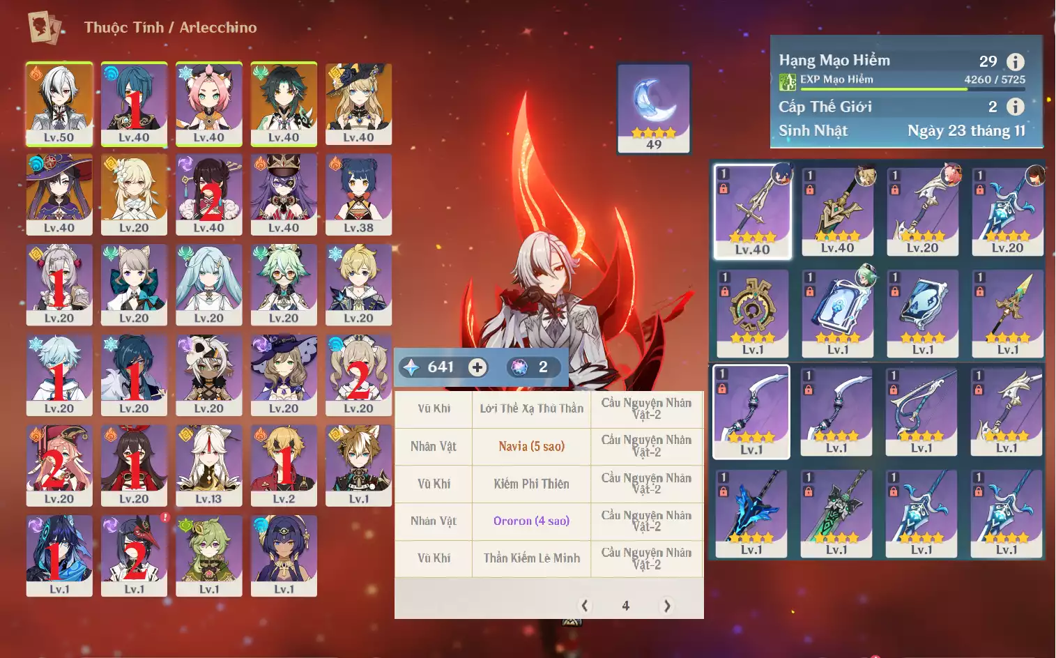 #355186 699,000đ 699,000đ AR level 29 Khu Vực asia Tướng 5* 4 VIP Ar29: Arlecchino + Navia + Xiao + Mona ( banner nhân vật 12 trang gần nổ) Tướng : 4 Vũ khí : 0 Chi tiết