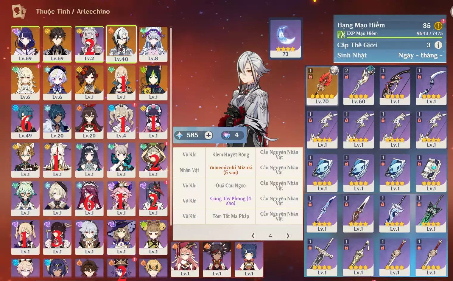 #355187 1,500,000đ 1,500,000đ AR level 35 Khu Vực asia Tướng 5* 10 SIÊU PHẨM Ar35: Arlecchino Hộ Ma + Zhongli + Raiden Shogun BAAL + Chiori + Mizuki + JeanC1 QiQi Tighnari + xingqiuC6 RosariaC6 ( banner nhân vật ĐÃ LỆCH 13 trang sure limited ) , chưa set sinh nhật Tướng : 10 Vũ khí : 1 Chi tiết